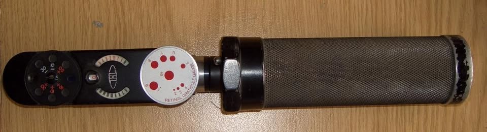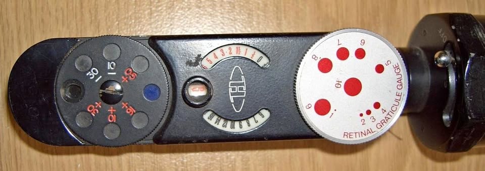 Genuine Theodore Hamblin Retinal Graticule Gauge. This is a direct type hand-held instrument with a battery-powered light source. The ophthalmoscope is equipped with a rotating disc of lenses to permit the doctor’s observation of the eye at varying depths and magnifications. This is a very rare optical instrument. whatsapp