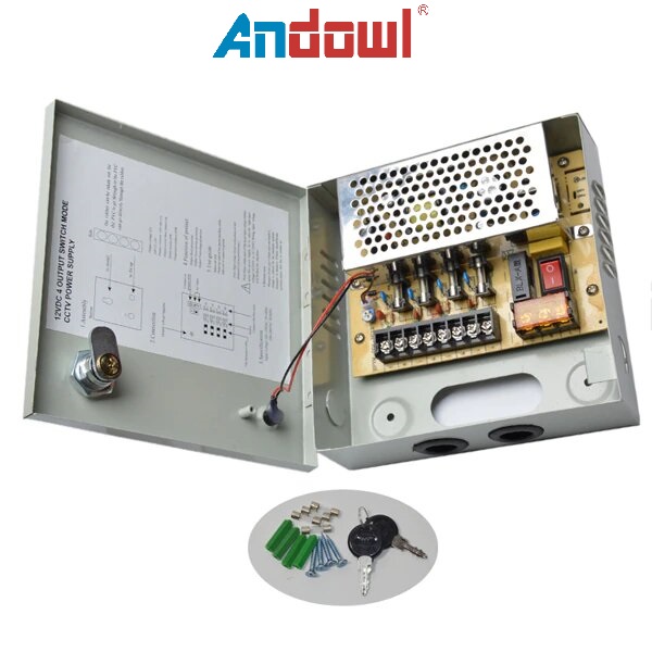 Power Supply Box with 4 Port Channels, Fuses, 10A and AC 110-220V to DC 12V.