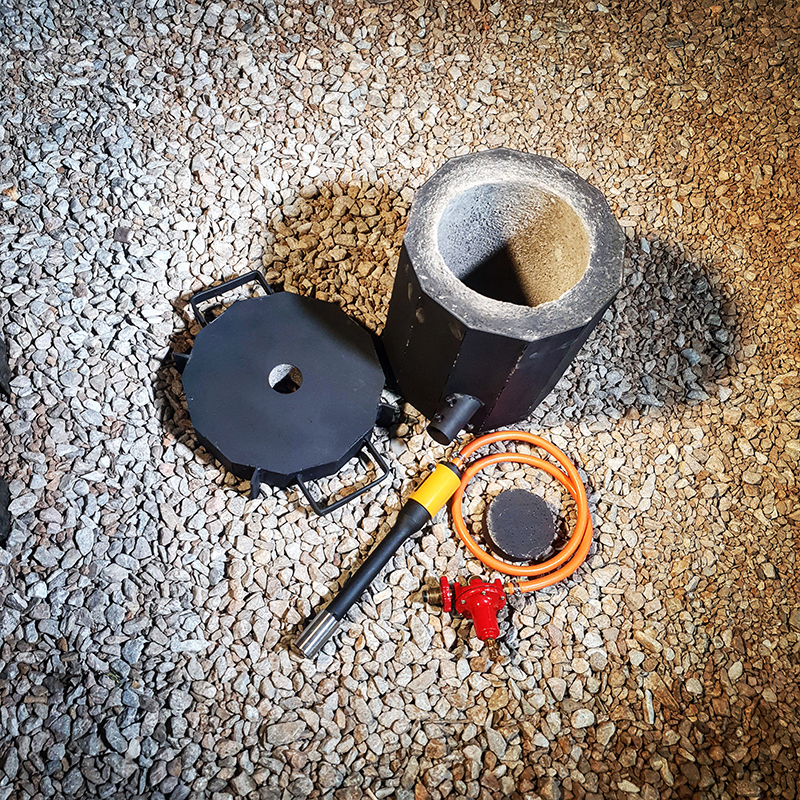 The package includes the foundry chamber, a foundry lid, a spacer block, a high-pressure LP gas regulator, a dragon burner, and an LPG hose (1 meter) with 2 hose clamps, and a printed setup guide to get you up and running as soon as possible.