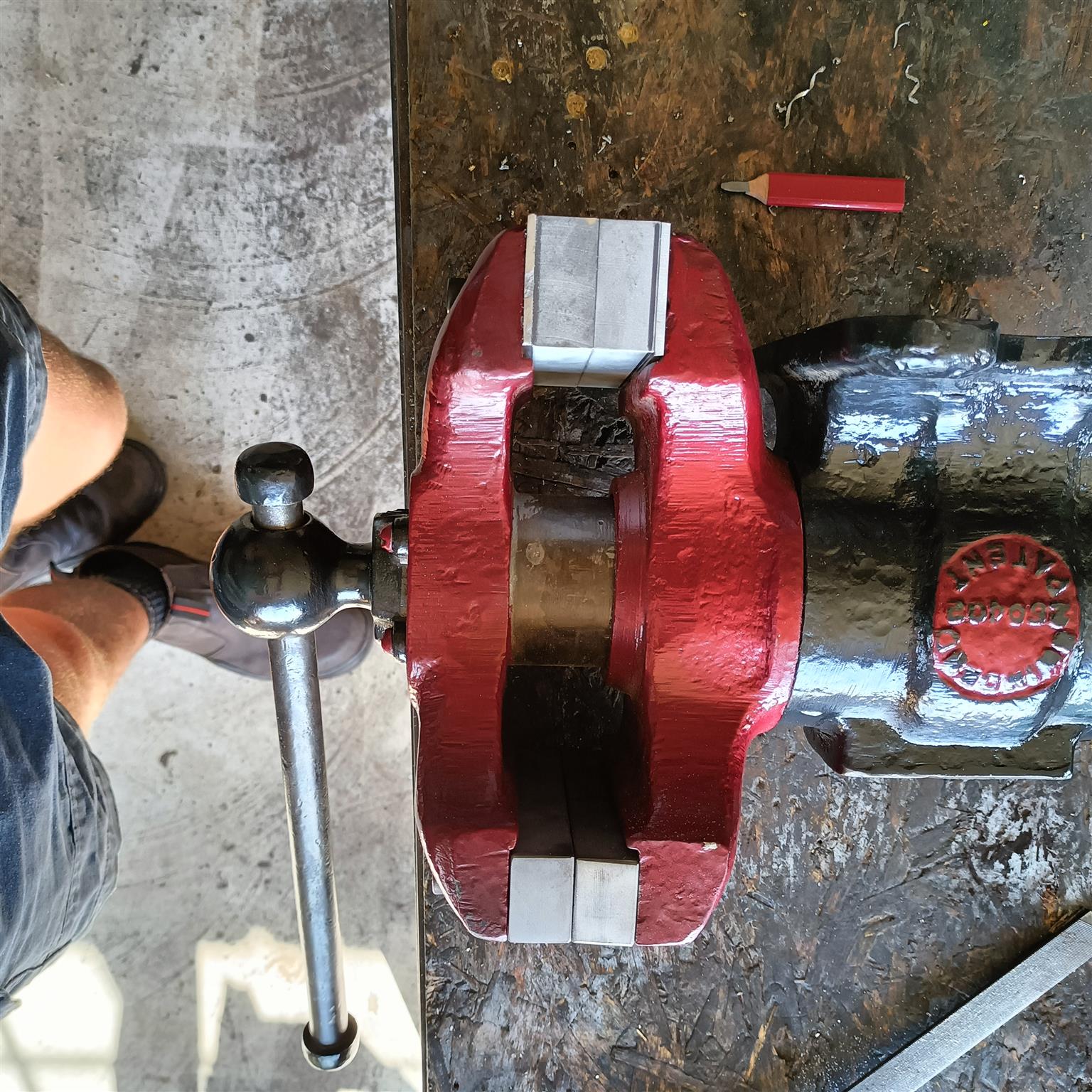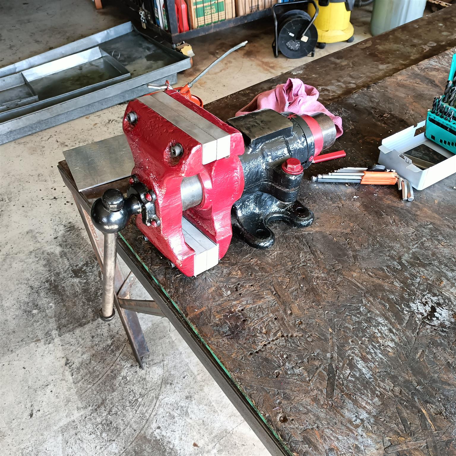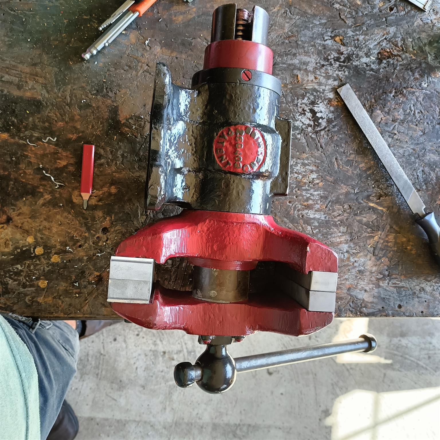 Strong old bench vise. Restored to pristine condition full functioning nothing broken or bend. 2 sets of jaws 180° 1 set soft 1 set hardened steel (K110/D2). Vice jaws can rotate 360° horizontally. Steel jaws 6 inches, soft jaws 5 inches.