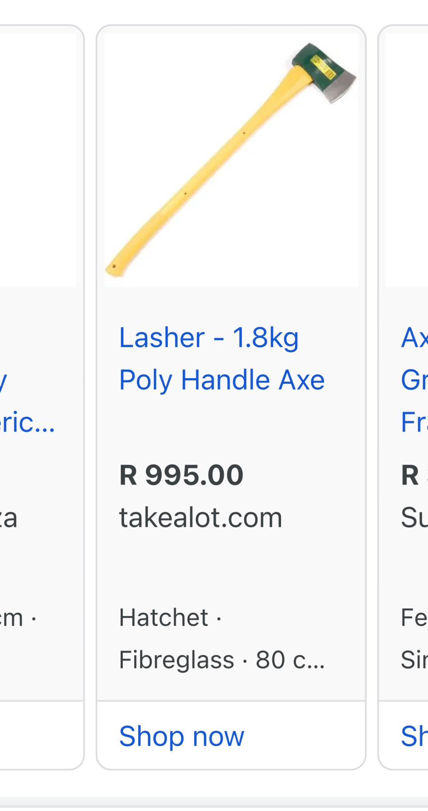 Poly Handle Axe 1.8KG. More details:Intention - For SalePrice - 450.0Region - GautengCity - PretoriaSuburb - Pretoria East