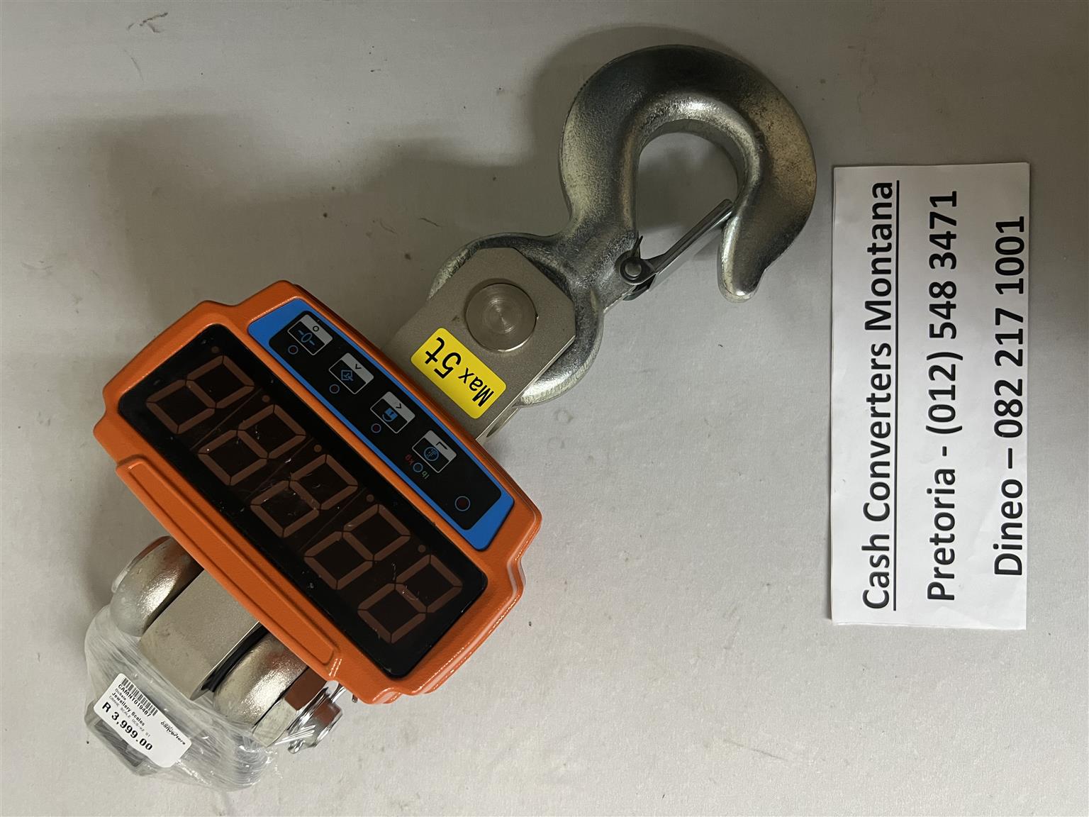 Electronic Crane Scale OCS-XZ-5t for sale R3999.00. In a good and working condition backed by a six month guarantee. Max. 5T. Orange and silver in colour. Reference : CAMNT019487