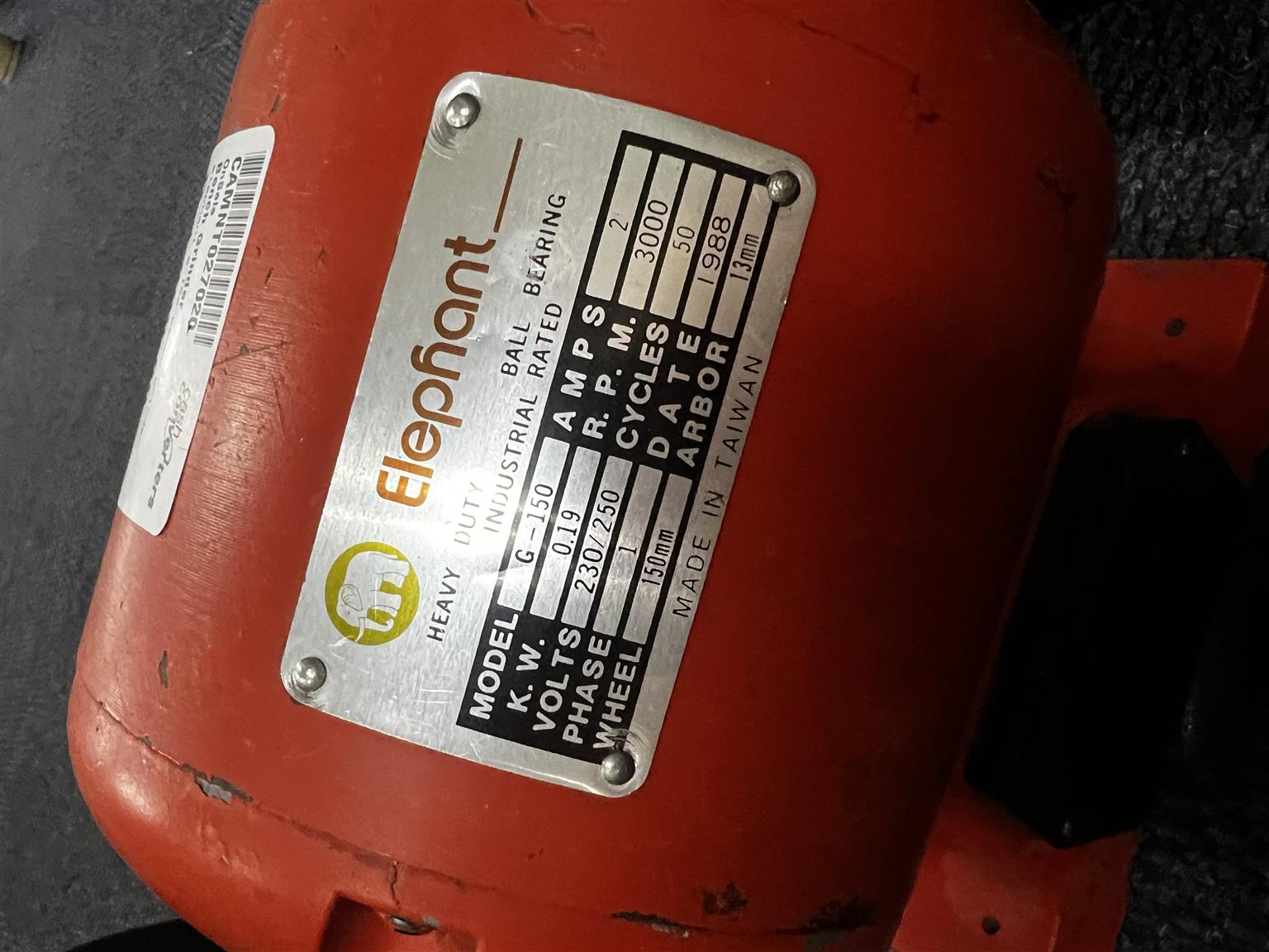 Elephant Bench Grinder G-150 for sale R1299.00. In a good and working condition backed by a six month guarantee. Orange and black in colour. Reference : CAMNT027020