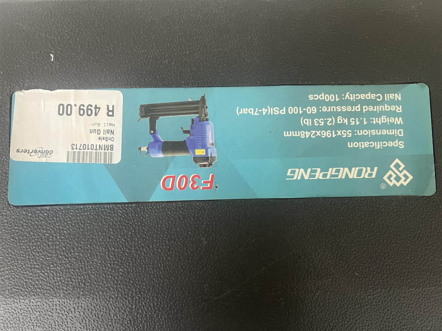 Rongpeng Nail Gun F30D for sale R499.00. In a good and working condition backed by a six month guarantee. Required pressure 60-100 PSI(4-7bar), nail capacity 100pcs. Blue and yellow in colour.