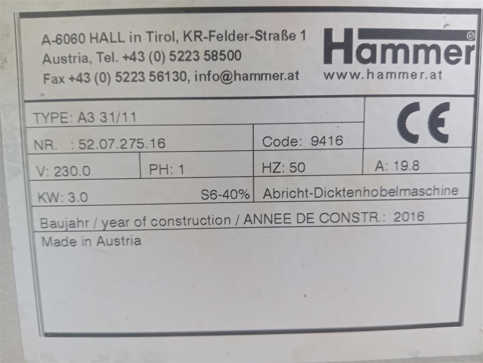 Hammer A3-31 Combination Thicknesser and Planer. 3Kw single phase. One hobby owner since new.