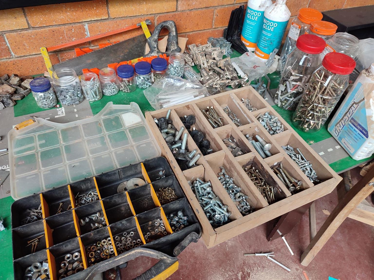 Batch of screws, nails, fischer plugs, glue hinges etc R500