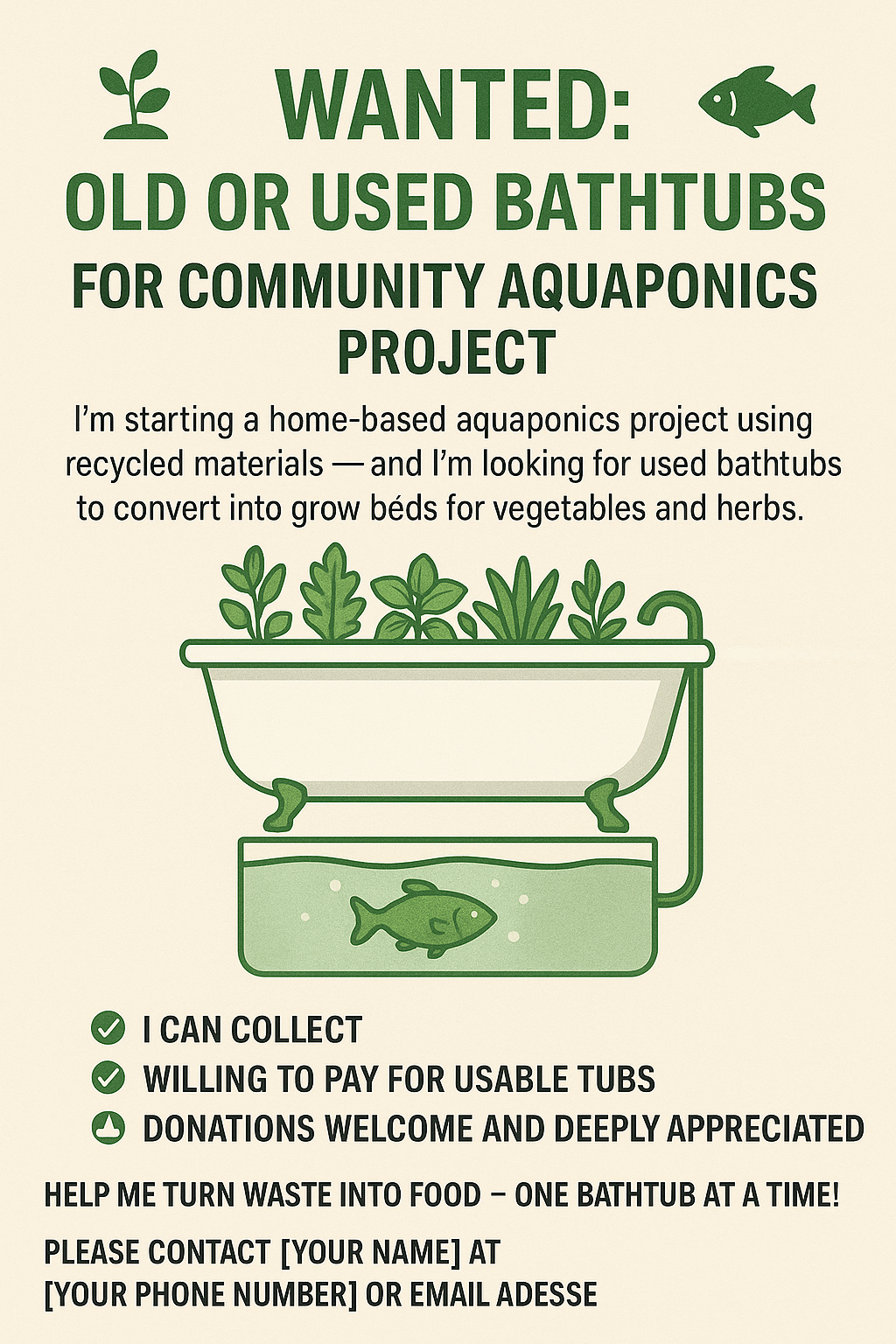 I’m starting a home-based aquaponics project using recycled materials — and I’m looking for used bathtubs to convert into grow beds for vegetables and herbs.