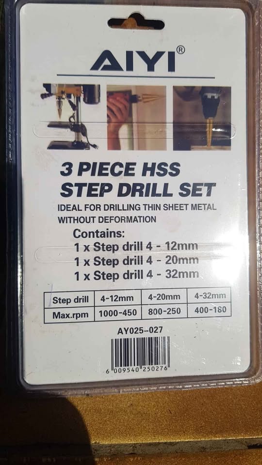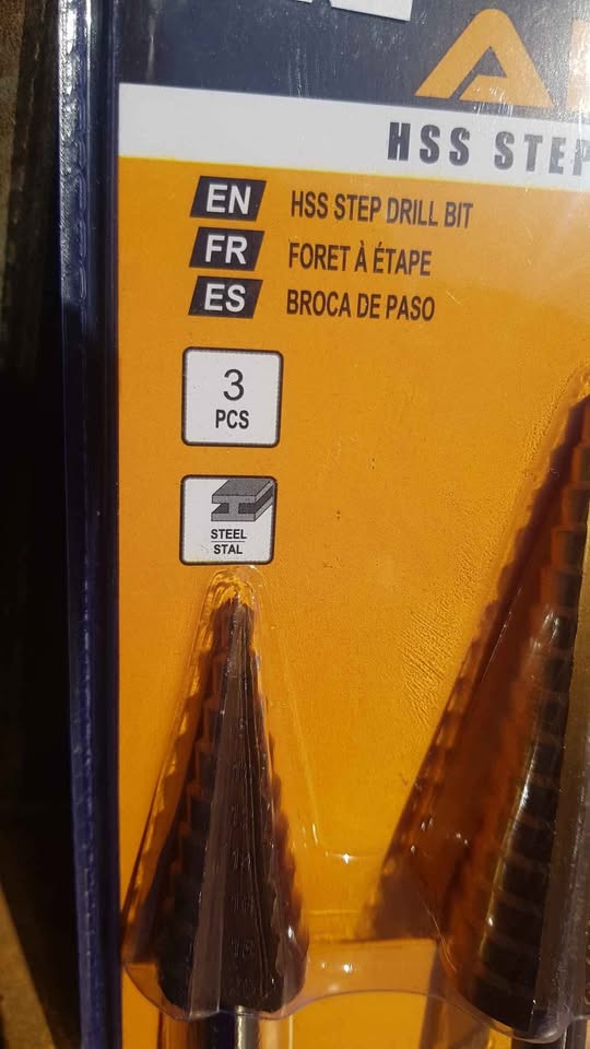 From 4 mm up to 32 mm. A step drill bit is a conical drill bit with multiple stepped cutting edges of increasing diameter. It’s mainly used for drilling clean, precise holes in thin materials like sheet metal, plastic, and soft wood. Each step on the bit corresponds to a different hole size, eliminating the need for multiple bits. Common Uses: Drilling holes in electrical panels and junction boxes Enlarging existing holes Working with thin metals and plastics Chamfering edges Advantages:. ✔ Versatile: One bit covers multiple hole sizes ✔ Clean Cuts: Reduces burrs and deformations ✔ Durable: Coated versions (e.g., titanium nitride) extend lifespan ✔ Efficient: No need to switch between multiple drill bits How to Use a Step Drill Bit: Mark the hole location using a center punch. Start drilling at low speed with steady pressure. Increase speed as the bit progresses through the material. Lubricate (if needed) when drilling metal to reduce heat and wear. Deburr (if necessary) with the same drill bit or a deburring tool. It's a very handy tool to have around the house or at the work place.