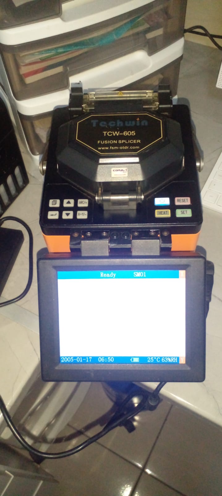 Techwin TCW-605 Fusion Splicer for Sale. Still in good condition. Needs Electrodes.