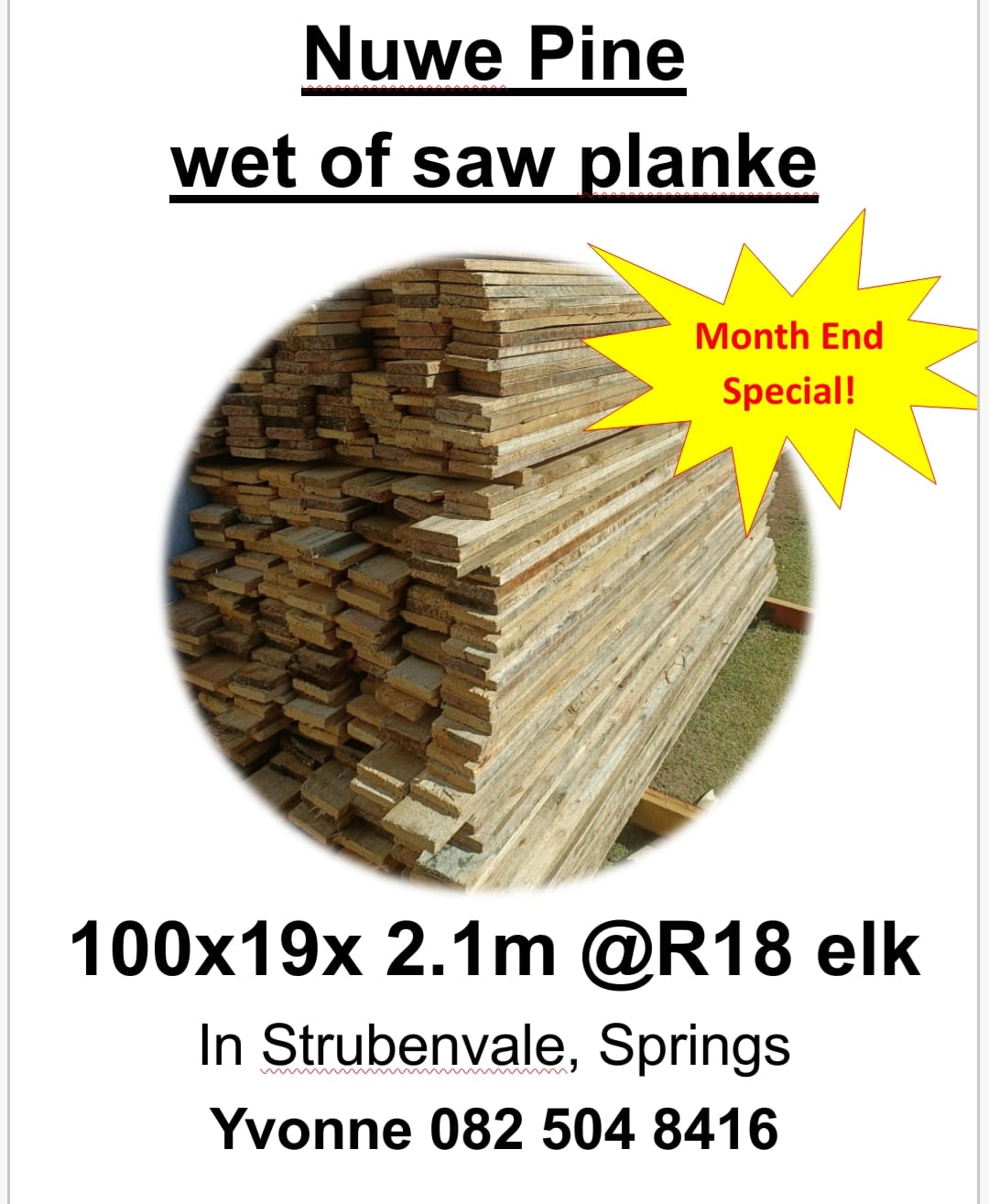 100x19x2.1meter new, freshly cut pine planks, wet of saw, not treated.