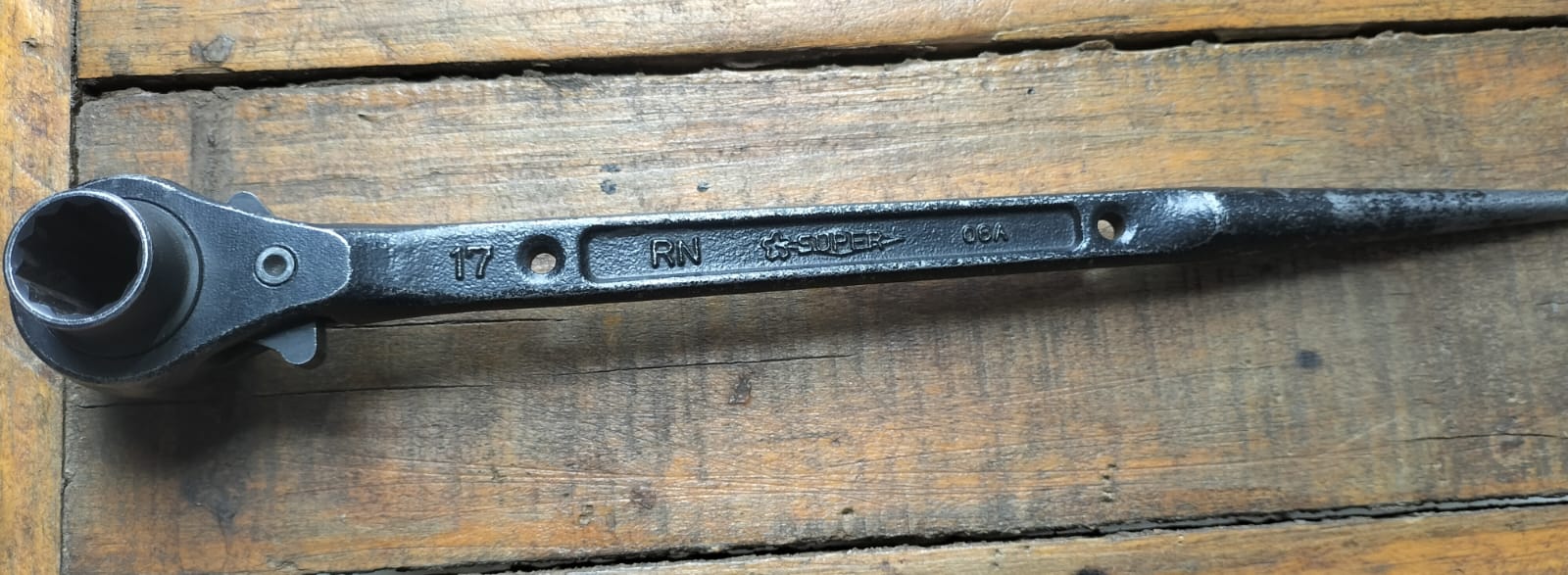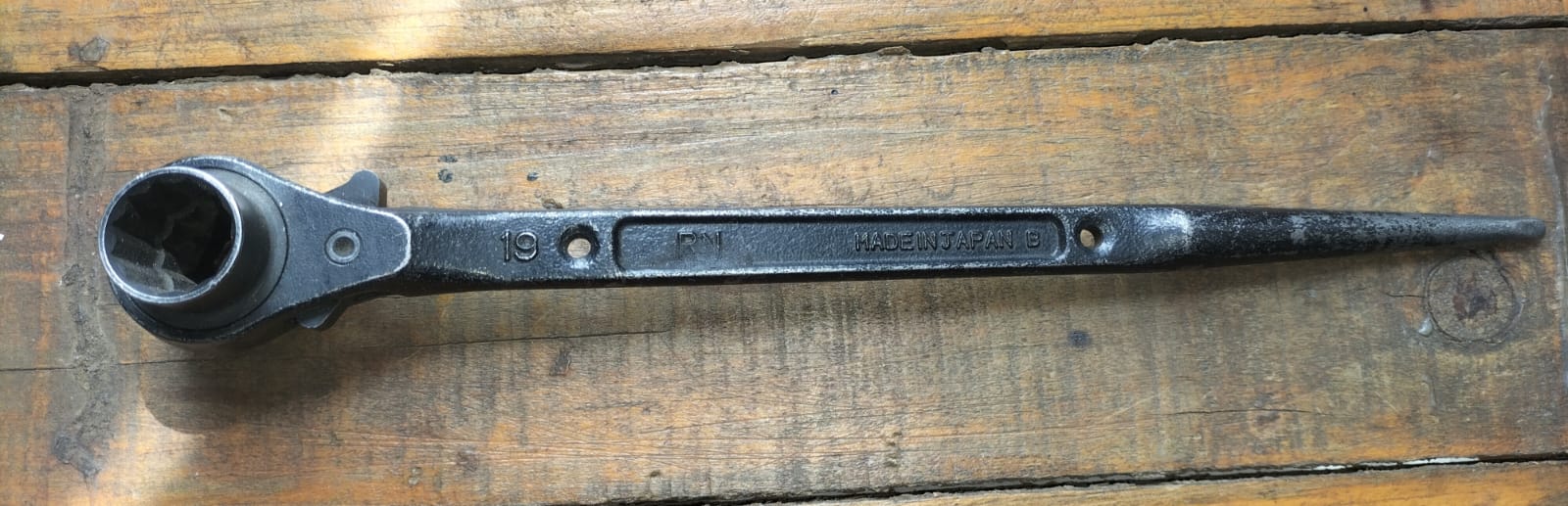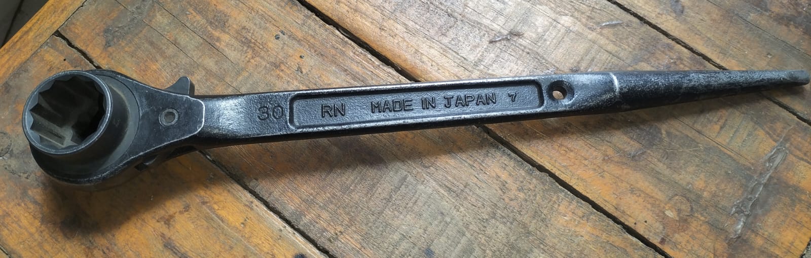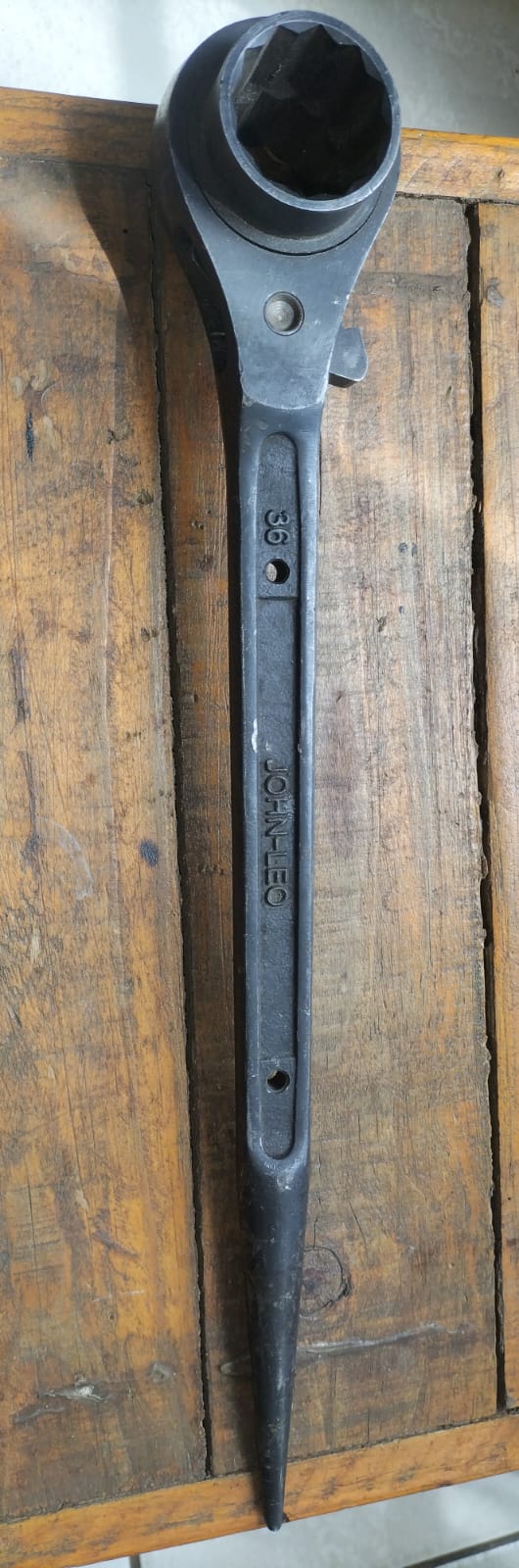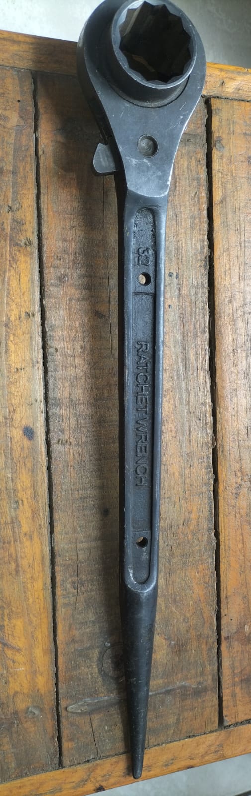 Each wrench has two sizes and a "podger" handle used for aligning bolt holes in structural steelwork.