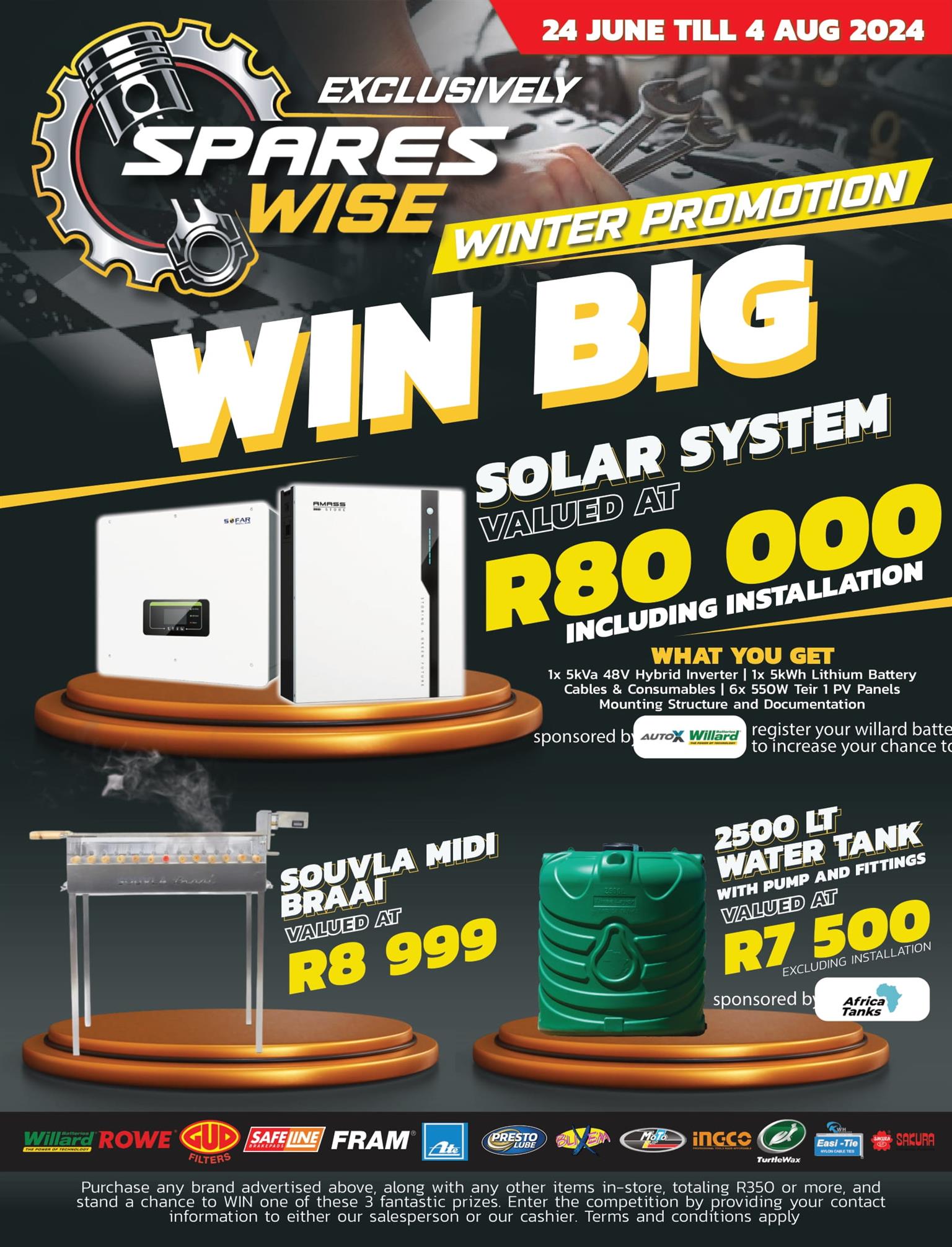 🥇 Grand Prize: An Amazing Solar System valued at R80,000 (including installation), sponsored by AutoX and Willard Batteries.