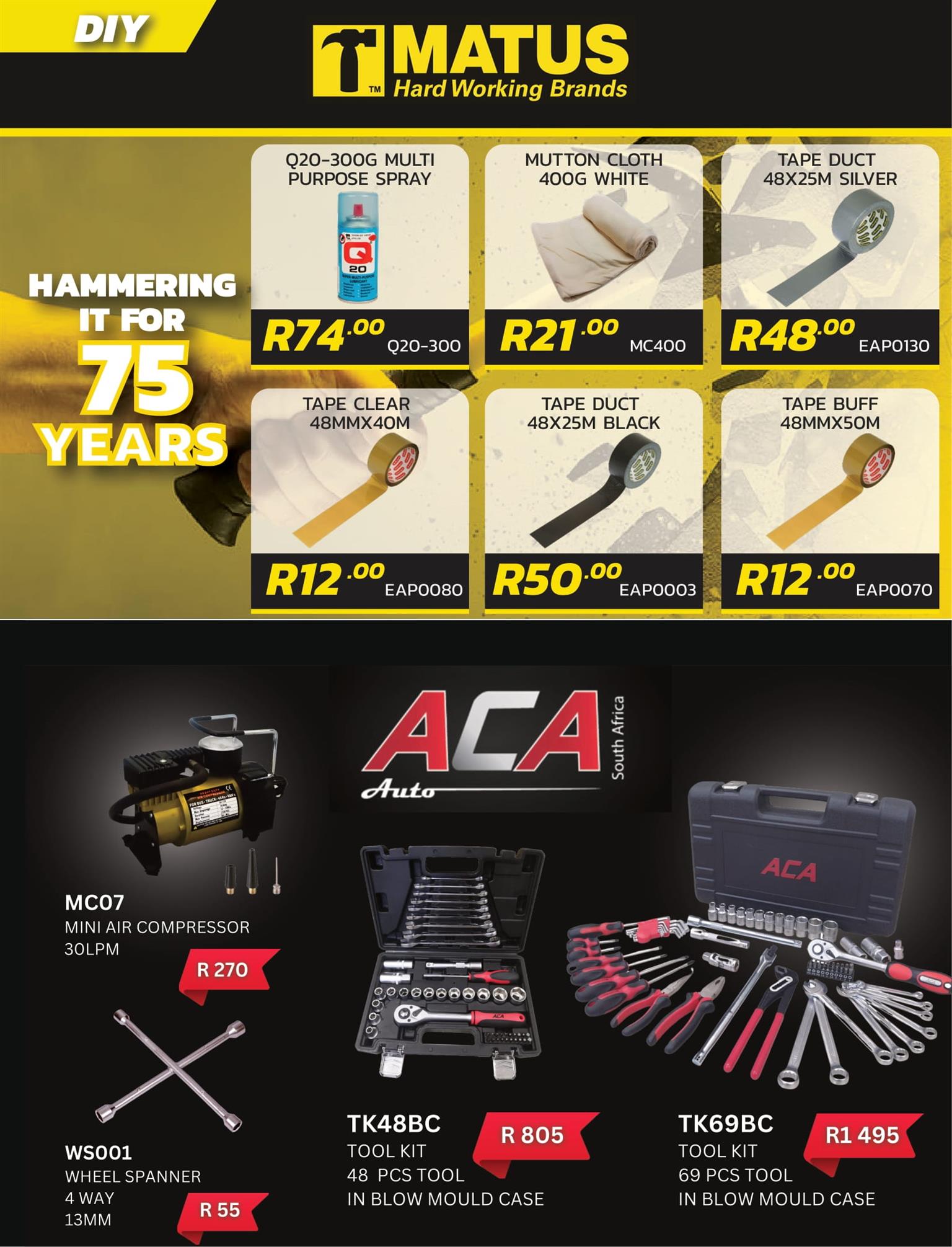 Equip yourself with the best from Matus Tools and ACA Auto Tools! Purchase any Matus or ACA Auto tool in-store totaling R350 or more from 24 June to 4 August 2024 and stand a chance to WIN BIG with these fantastic prizes: