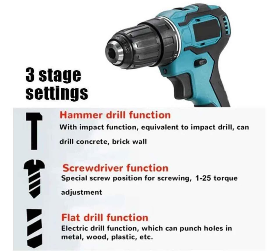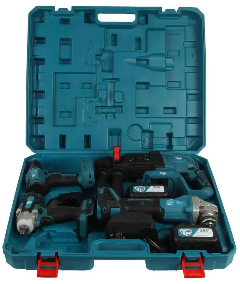 *36V 4 in 1 Brushless Multi-Function Power Toolset* _*CORDLESS*_ On special till 3 Nov 2024 🥳🥳 Was *R2900* Now *R2700*🧰 Features: -Cordless design -Power and speed -Adjustable clutch -Drill and driver modes -Multiple speed settings Specifications: *Brushless Impact Wrench* Speed: 0-2500rpm Impact Frequency: 0-2000rpm Max Torque: 350N.m *Brushless Drill* Max Torque: 40~45N.m No load: 0-1800rpm Torque Setting: 23+1 *Brushless Angle Grinder* Main thread: M14 Rated speed: 10000rpm Disc size: 125mm *Brushless SDS Hammer Drill* Max Hole Diameter: 20mm Impact Frequency: 0-4550spm No load speed: 1800rpm Modes: 3 -Voltage: 36V -Package weight: 13000g Size; l=64.7cm x h=53cm x w=17cm What's in the box 1 x Brushless Impact wrench 1 x Brushless grinder 1 x Brushless sds hammer drill 1 x Brushless drill 1 x Battery Charger 4 x 36V 15000mAh Battery