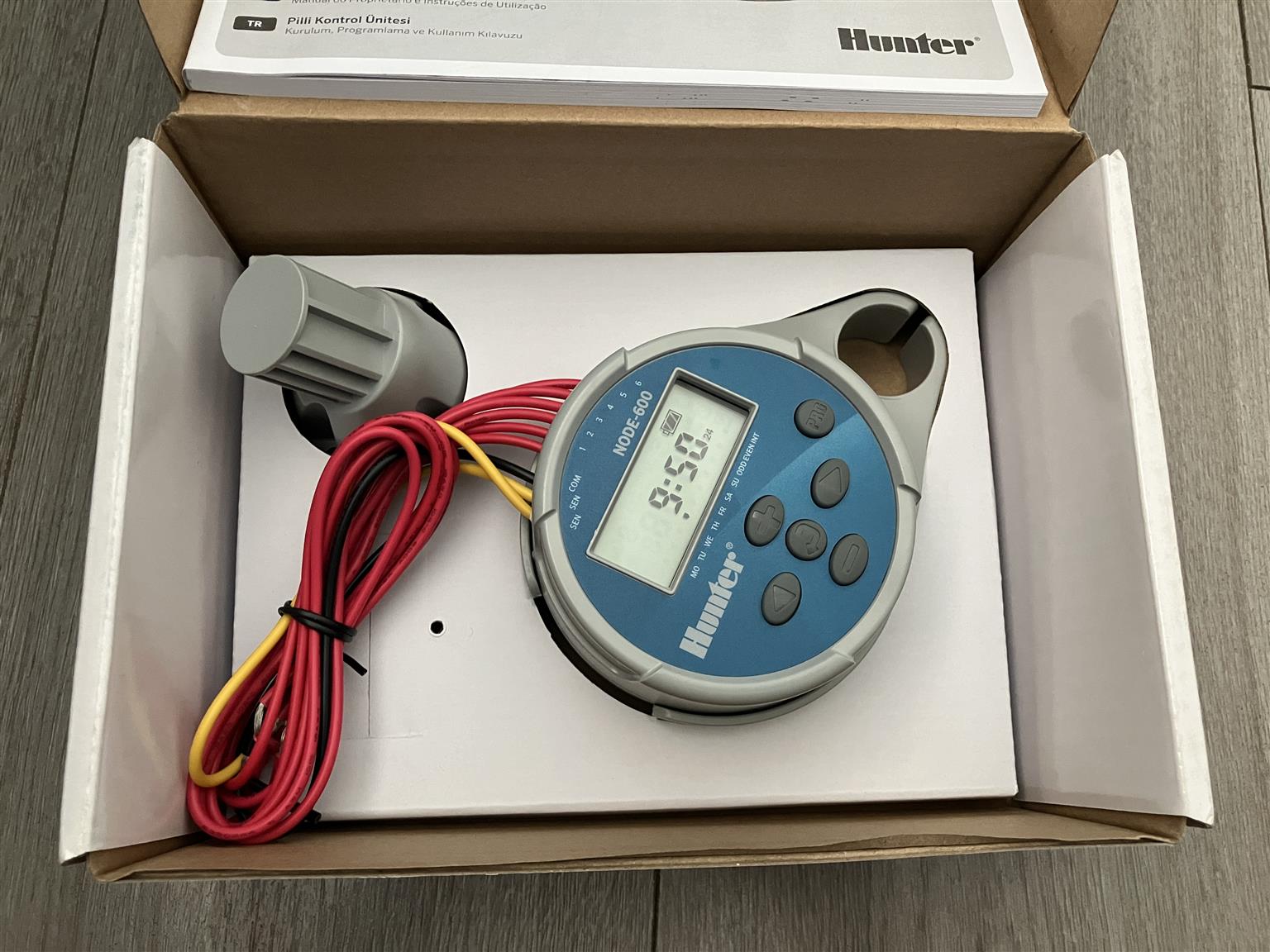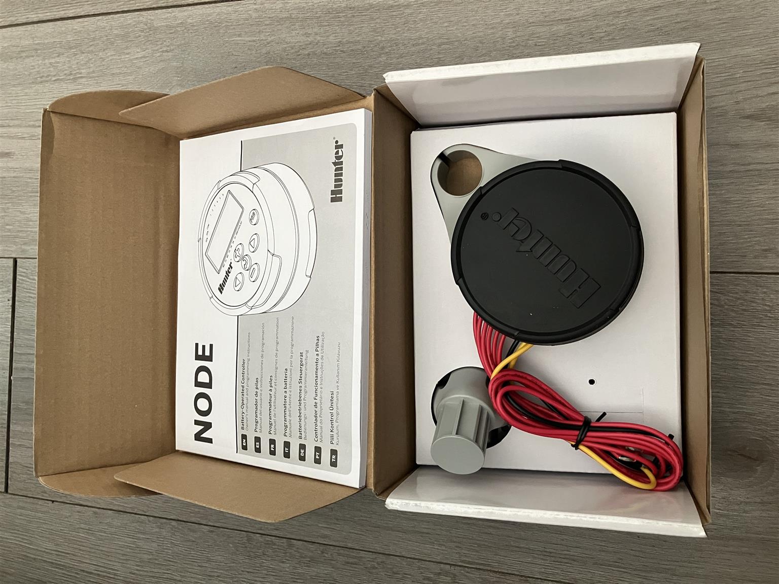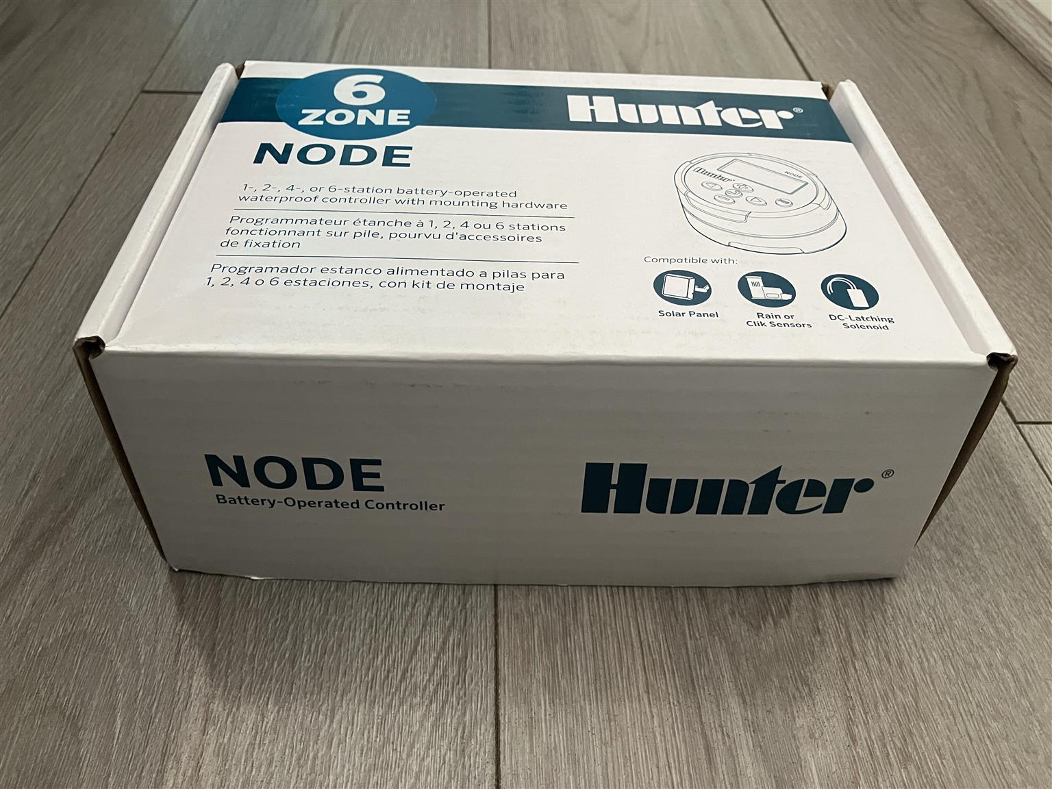 6-station irrigation controller. Still new in box and never been used. This battery-powered, waterproof controller offers automatic irrigation control for irrigation without electricity. The Node mounts to a valve solenoid quickly and easily, and without screws, drills or additional wires. One 9V battery is included.