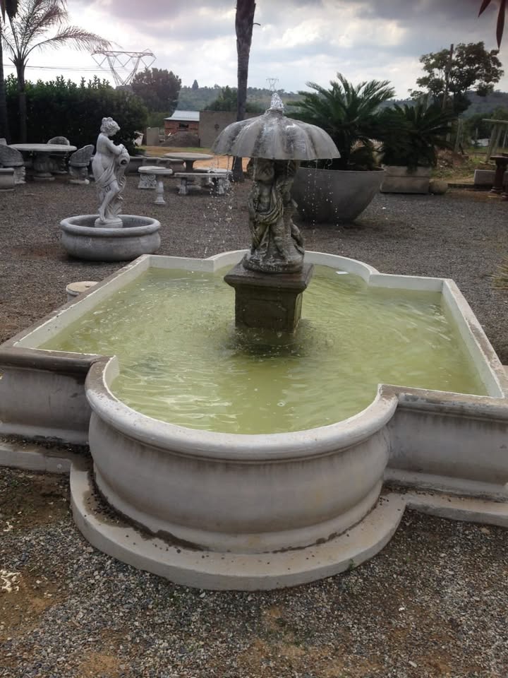 FJC Staalwerke, ons installeer voorafgegiete konkryt fonteine, enige form, enige grootte. Of jy dit opsit om in tuin te maak, en of jy dit optig vir die kalmerende effek wat die water op jou het, vir die vermeerdering van jou eiendom se waarde, watter rede ookal, ons help jou daarmee. Kwalityt werkmanskap gewaarborg. Ons is gelee op die Rhenosterfontein pad in die Cullinan/Donkerhoek area. Kontak ons gerus vir 'n kwotasie. 0.7.3.3.2.6.4.4.9.2