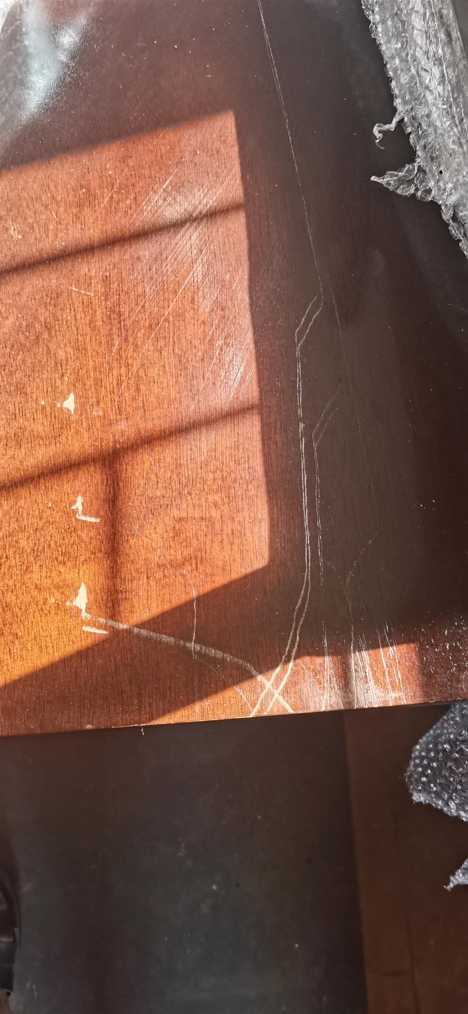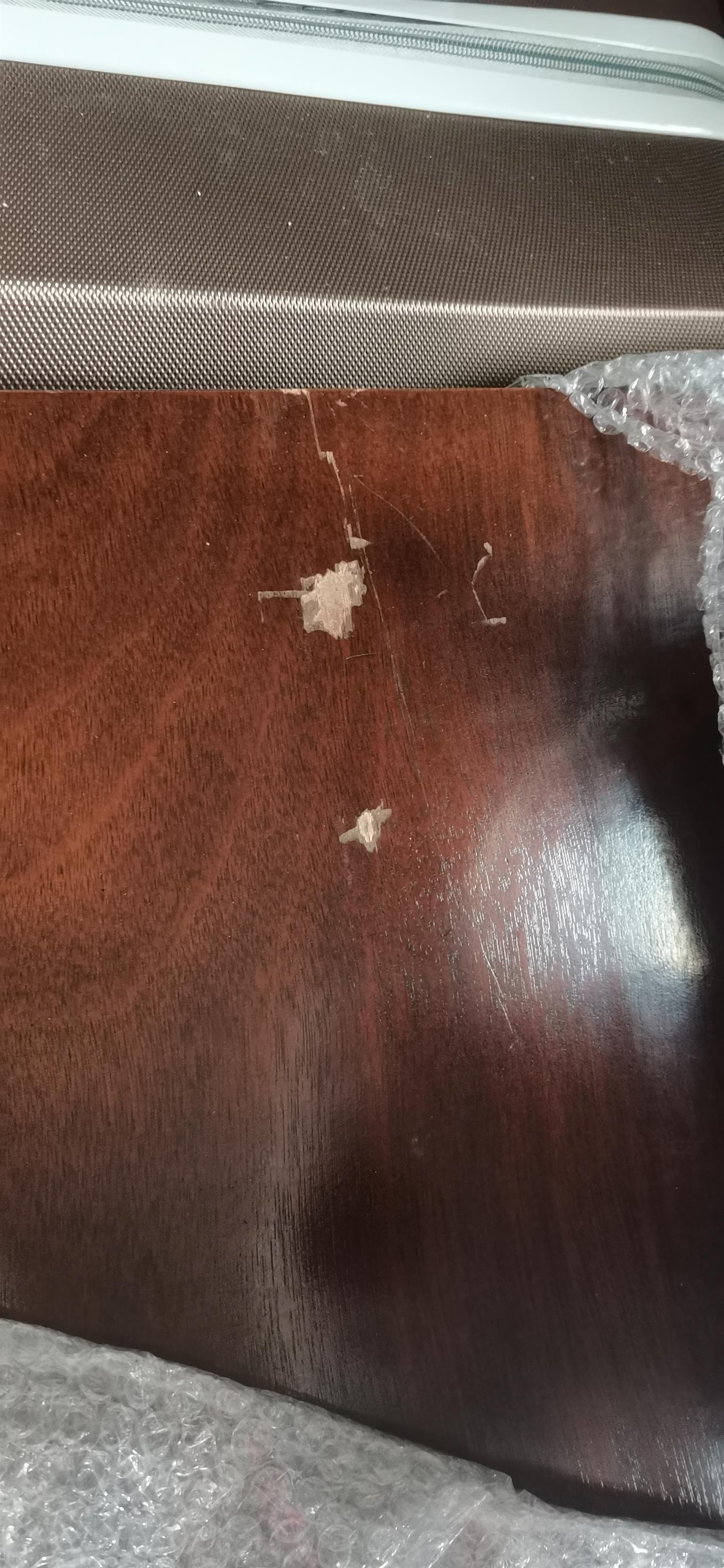 Dining room table and 6 chairs. Table has few scratches which will need to be polished and minor on chairs.