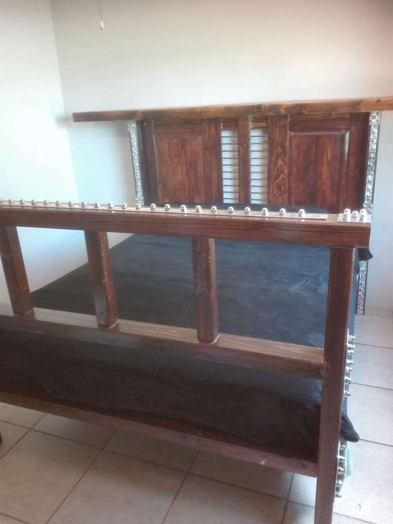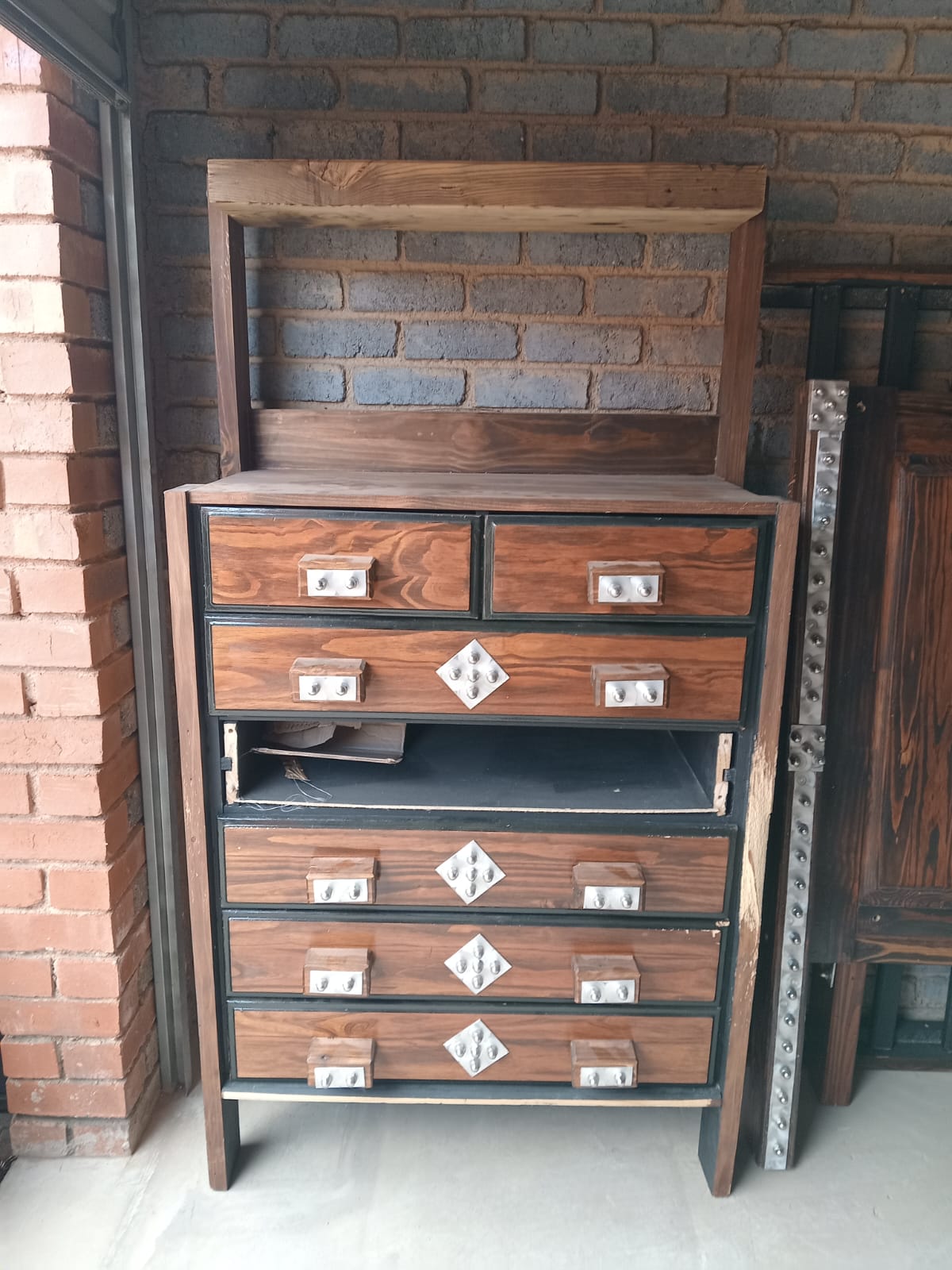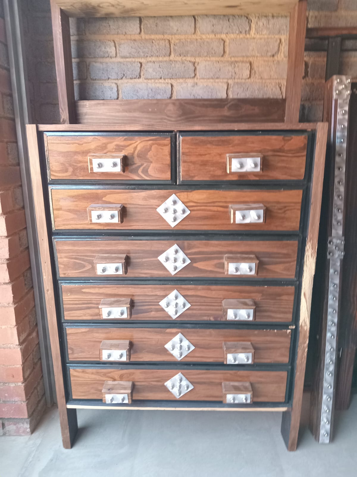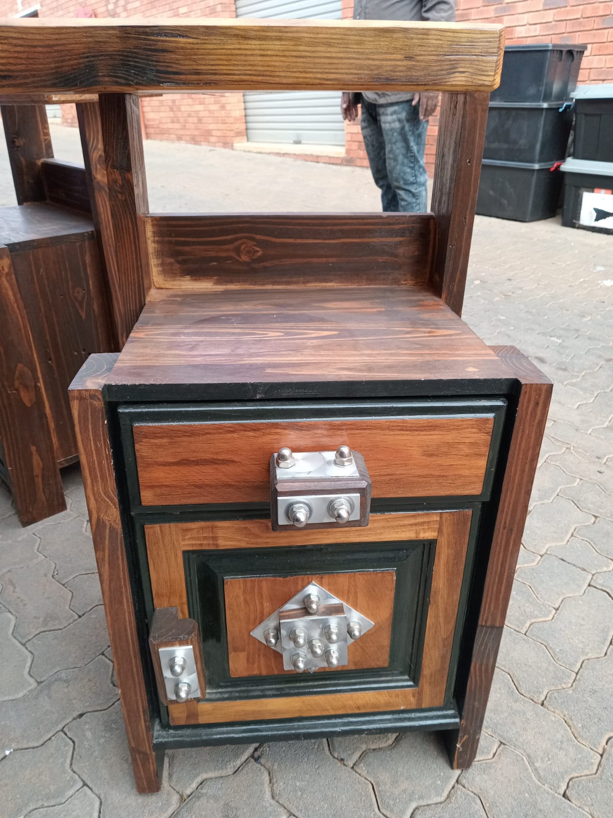 Handmade wooden bed base, side cupboards and chest of drawers with steel detailing.