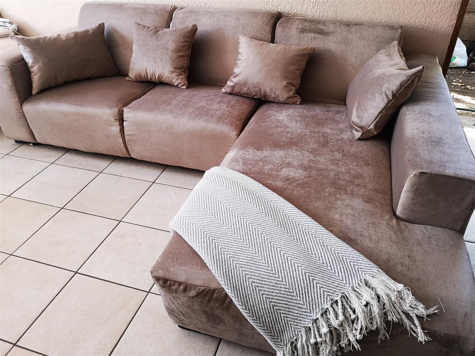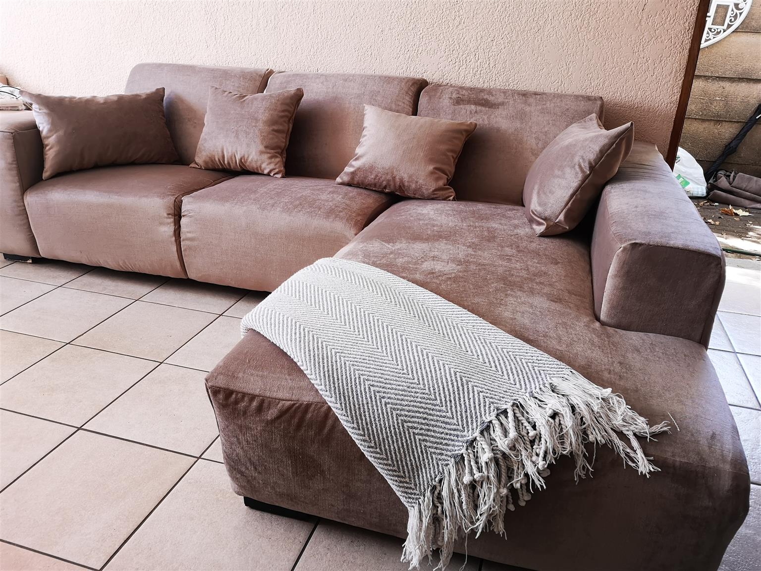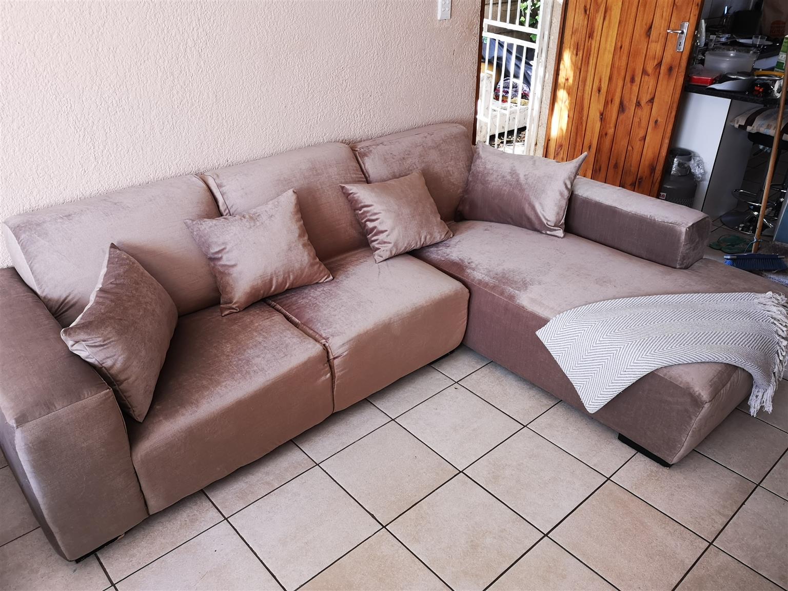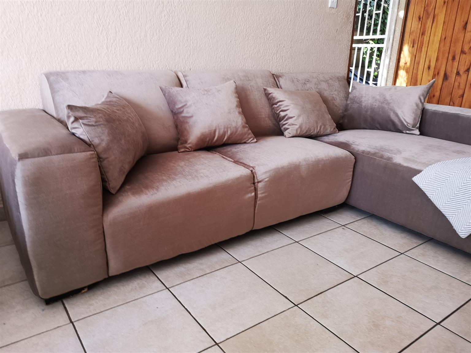 A Stunning L Shape Couch with Scatters and it has been re upholstered. We are based in Brackenhurst, Alberton. Delivery can be arranged.