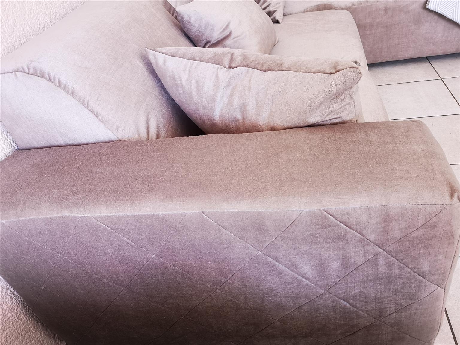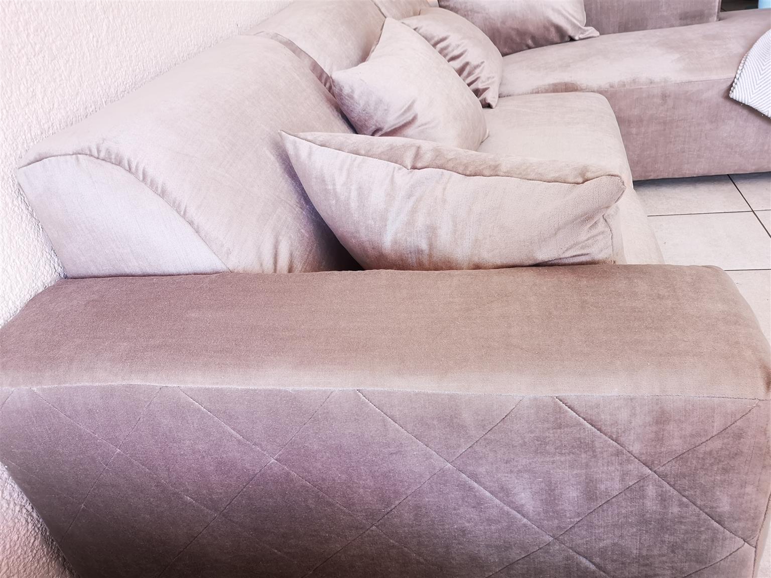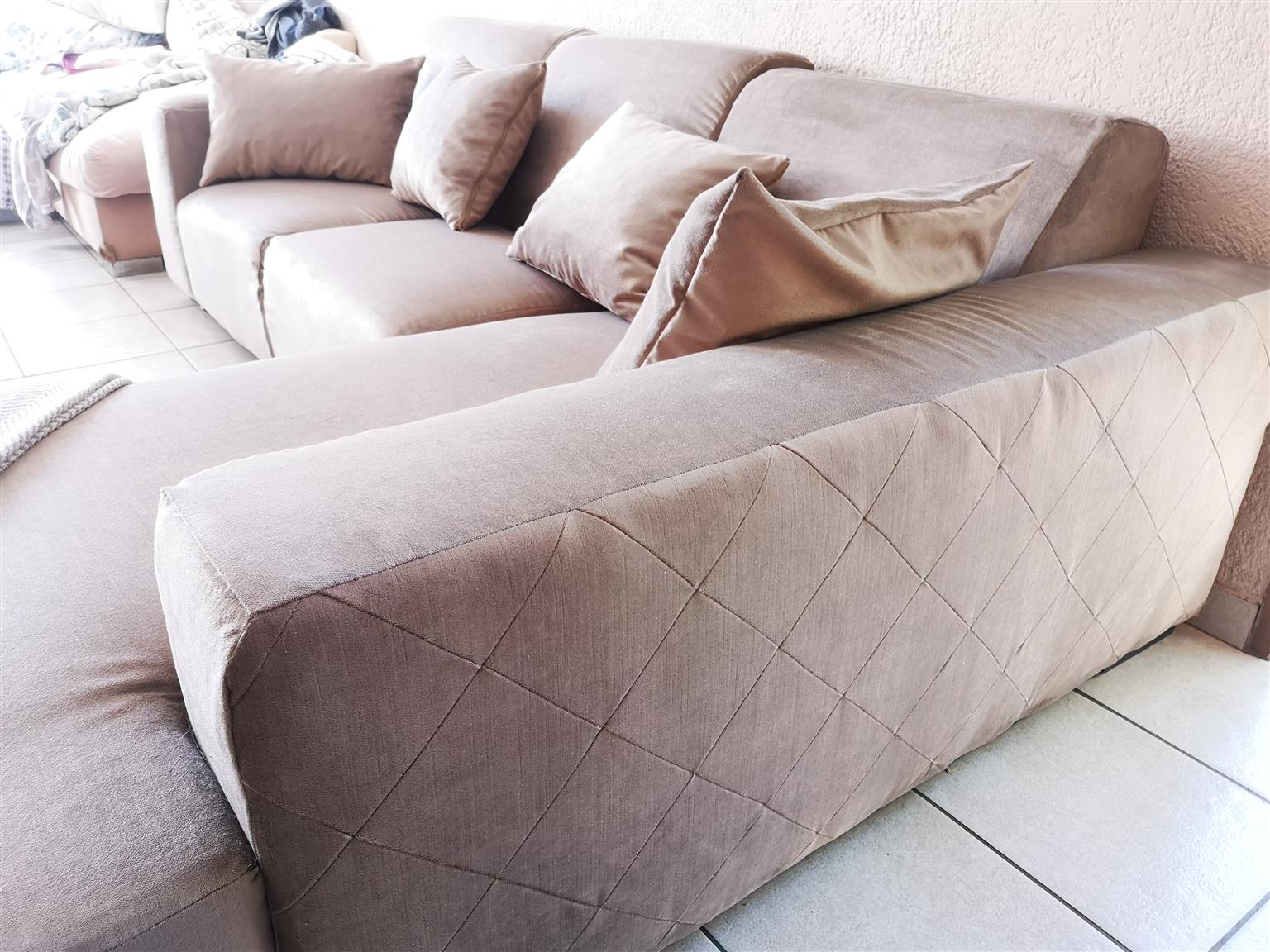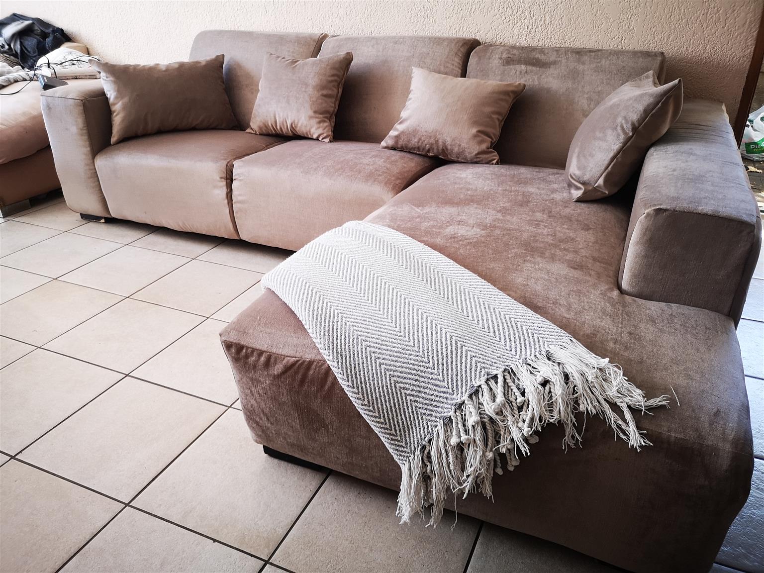 A Stunning L Shape Couch with Scatters and it has been re upholstered. We are based in Brackenhurst, Alberton. Delivery can be arranged.