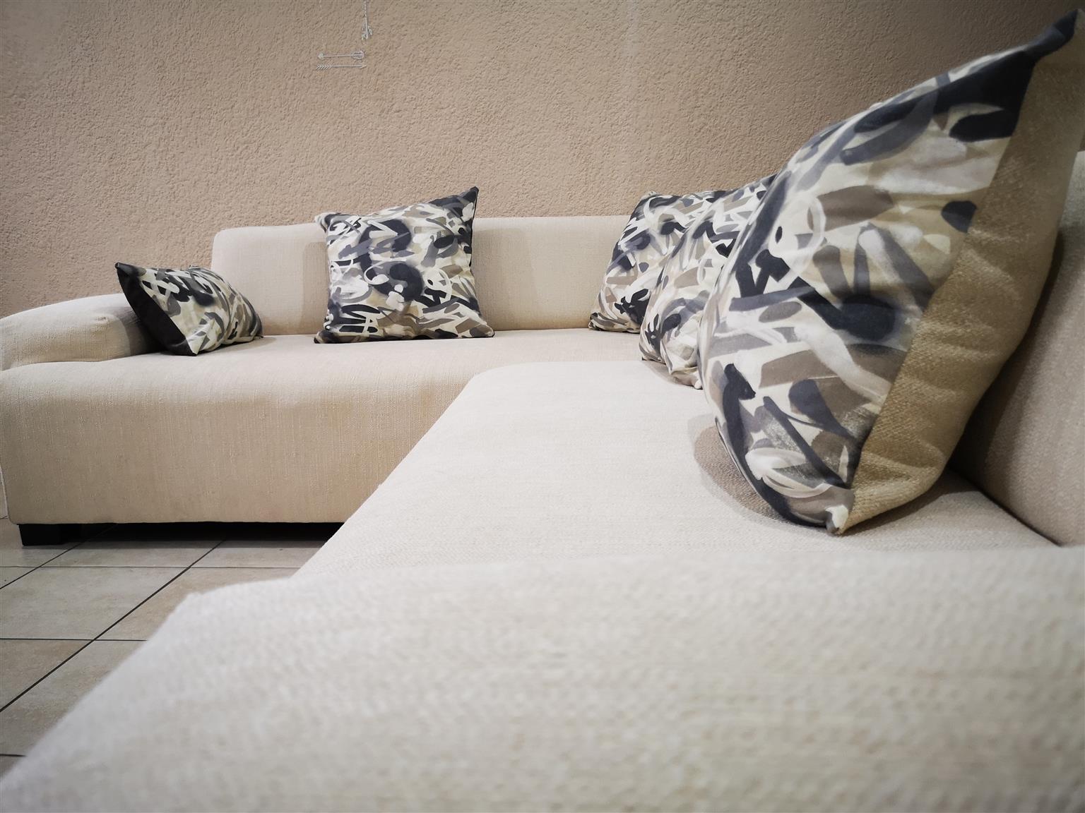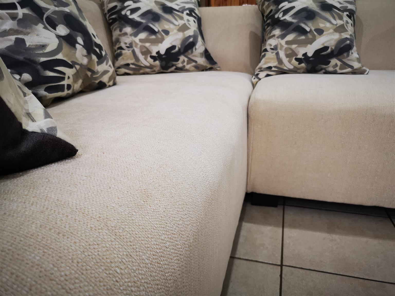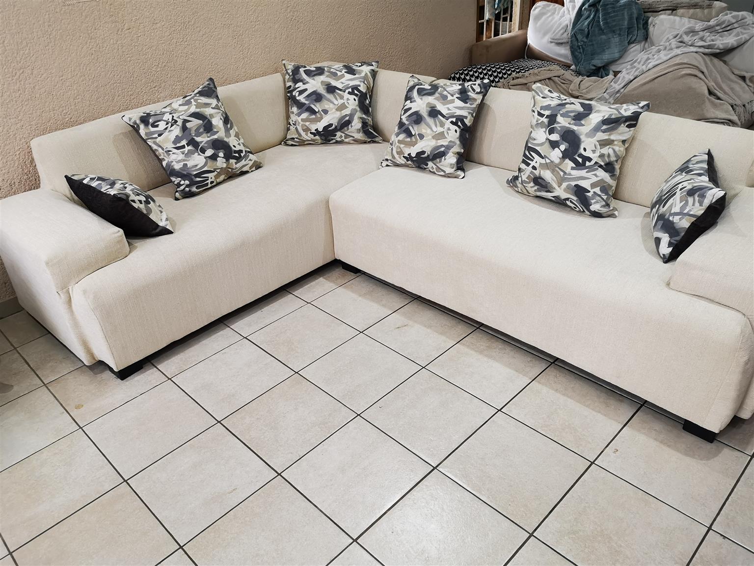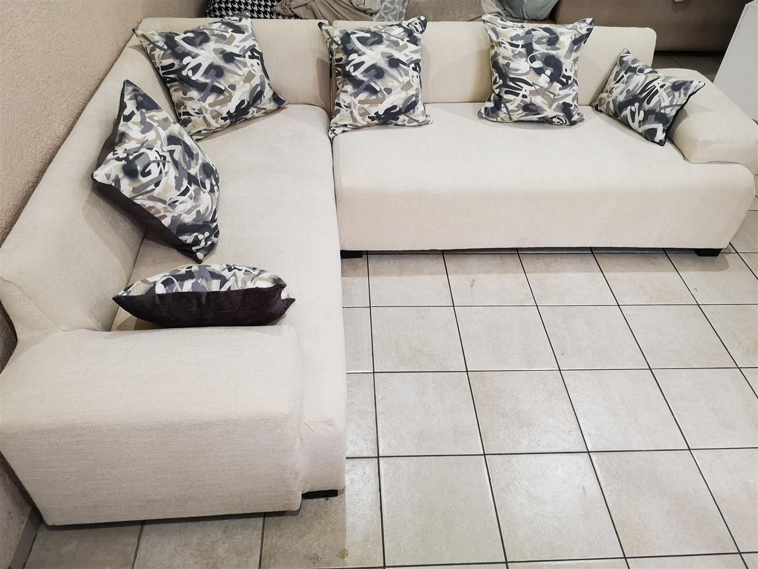 Beige L shape Couch with Scatters for sale. Comfortable and big. It is in immaculate condition and the fabric and cushions are brand new. We are based in Brackenhurst.