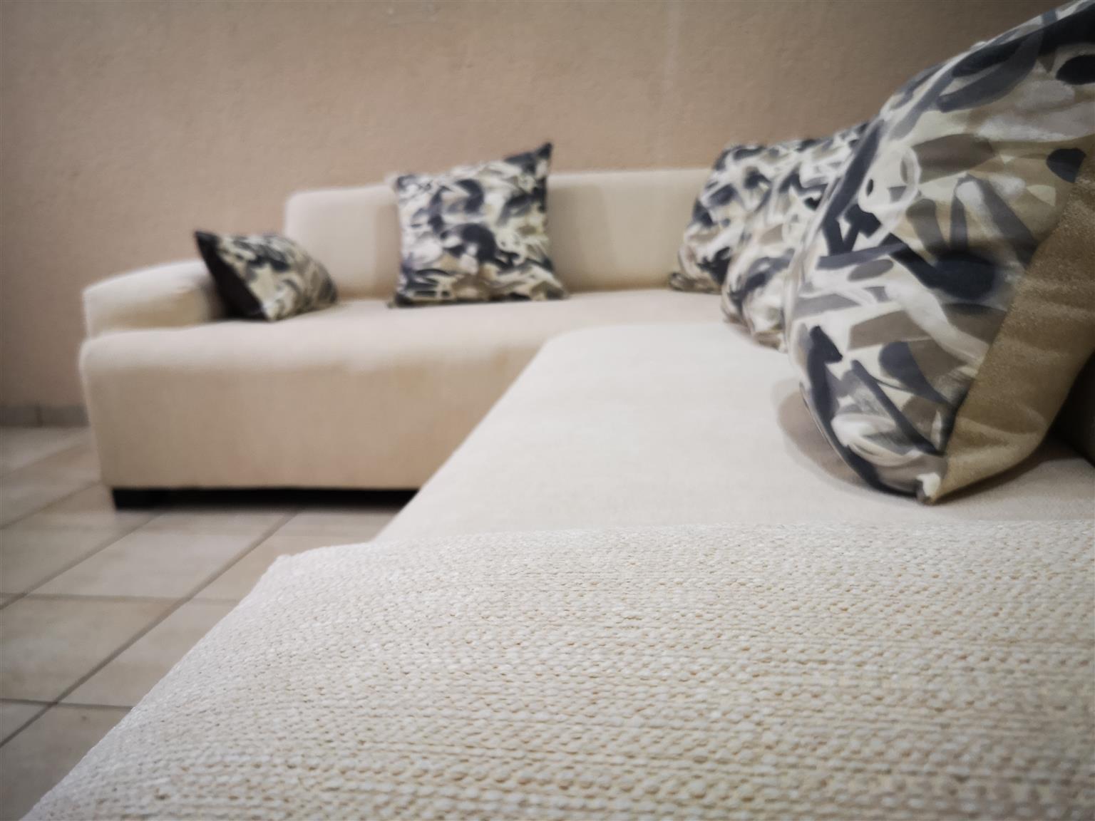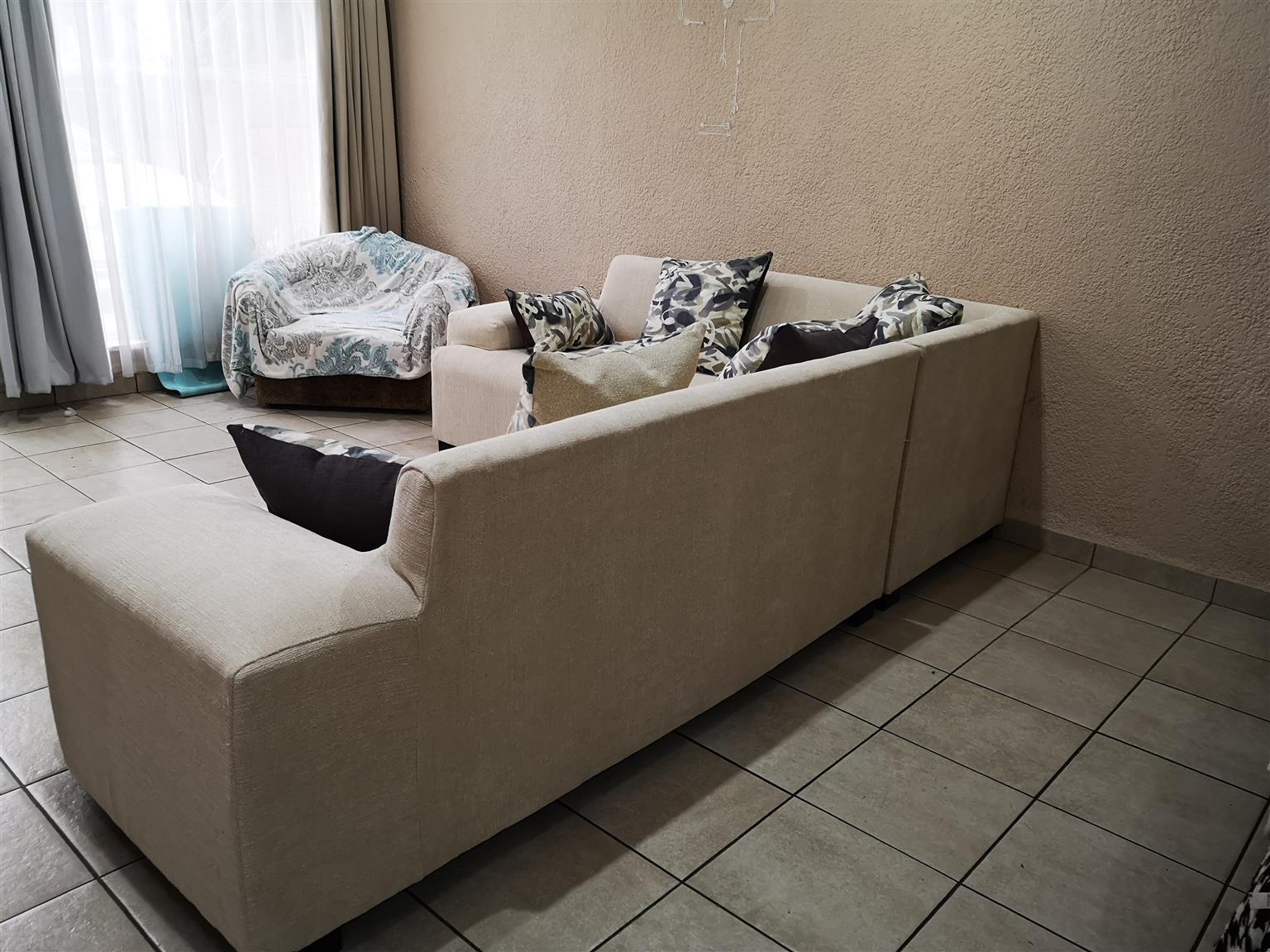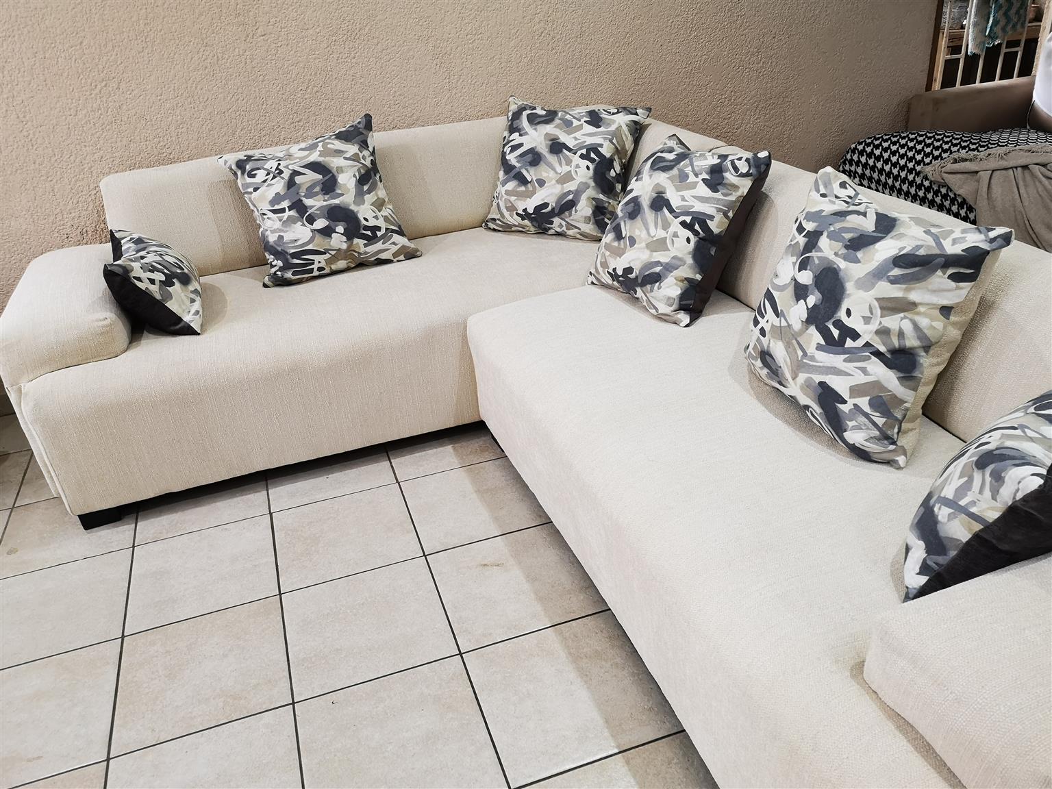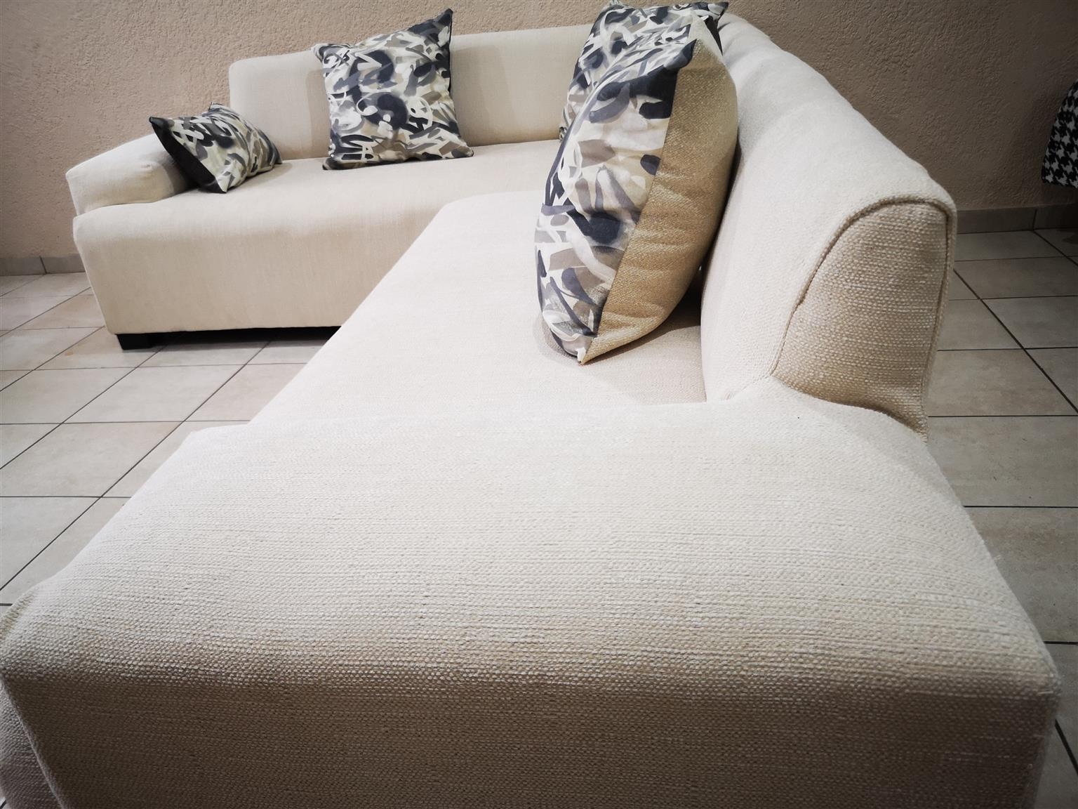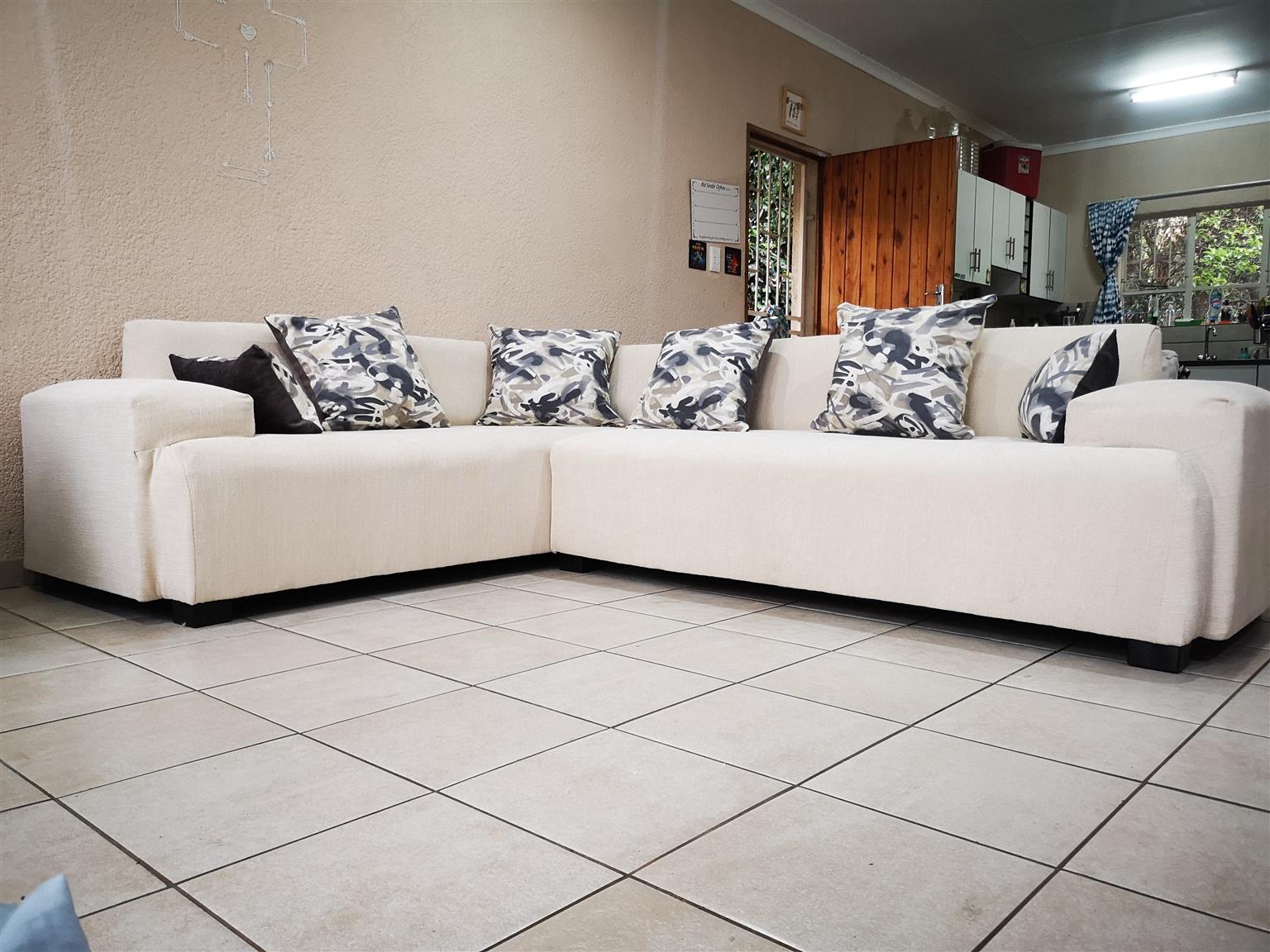 Beige L shape Couch with Scatters for sale. Comfortable and big. It is in immaculate condition and the fabric and cushions are brand new. We are based in Brackenhurst.