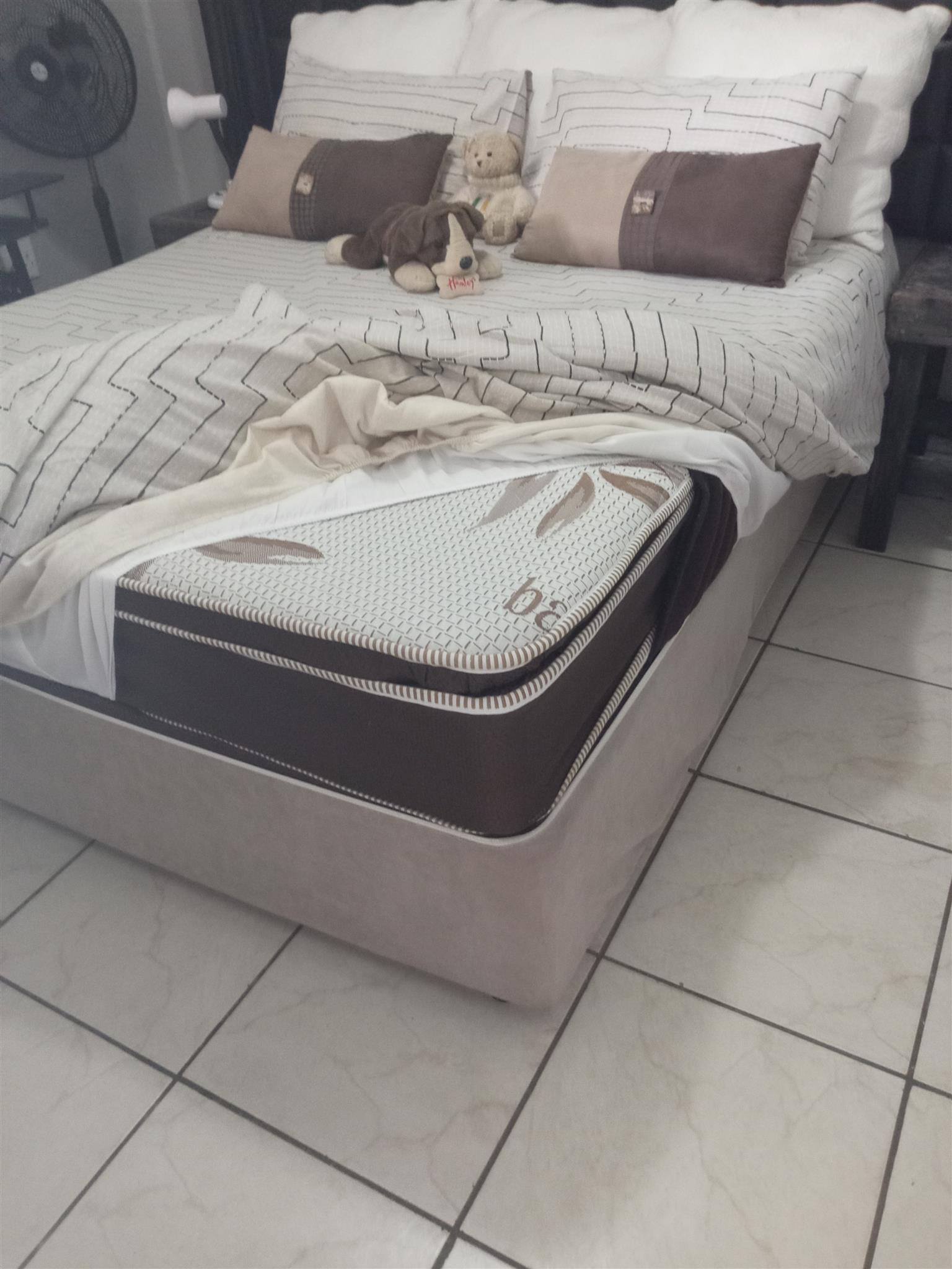 Queen bed including bedding plus two sets of duvet covers, headboard and two side tables in very good condition