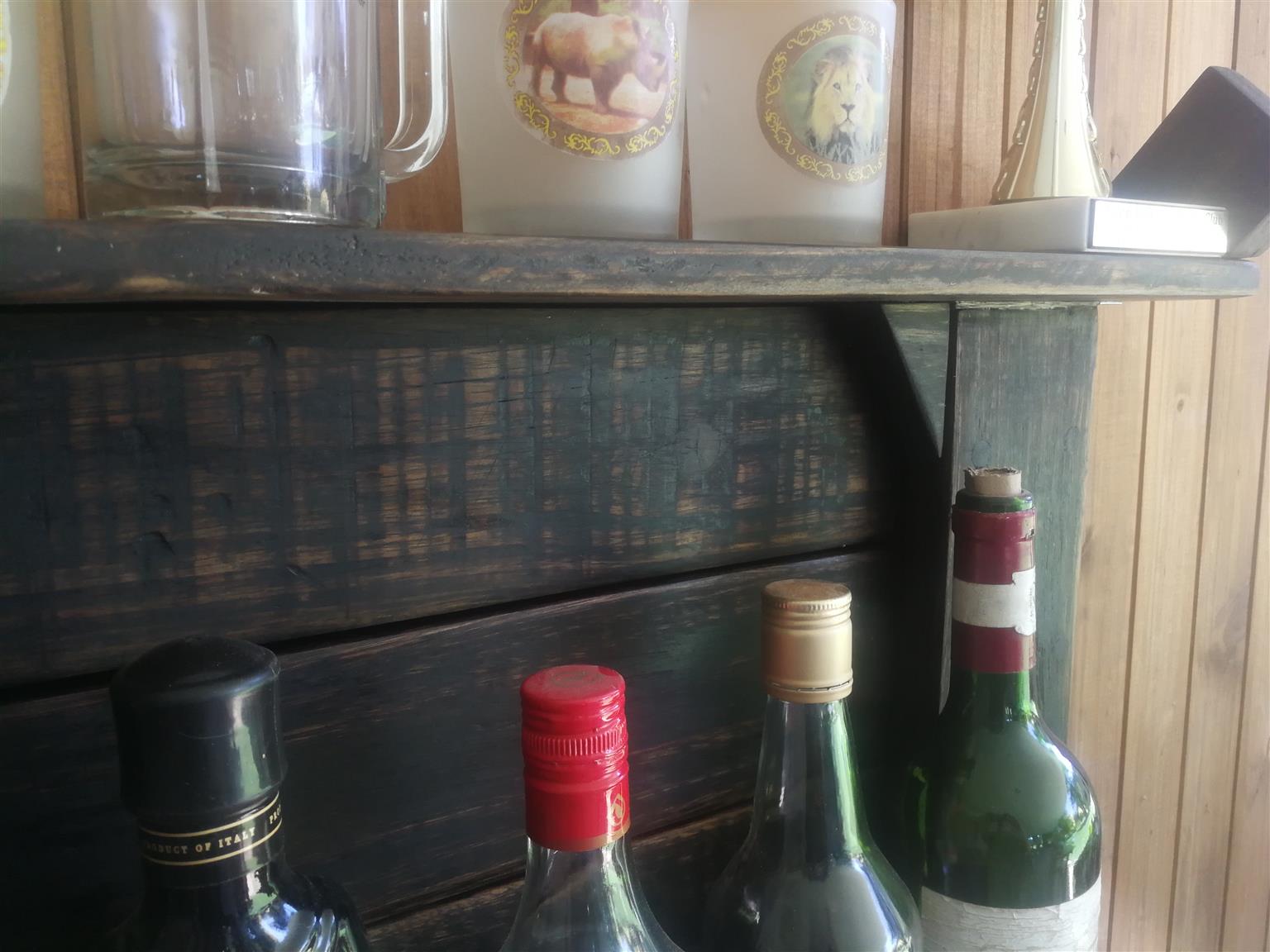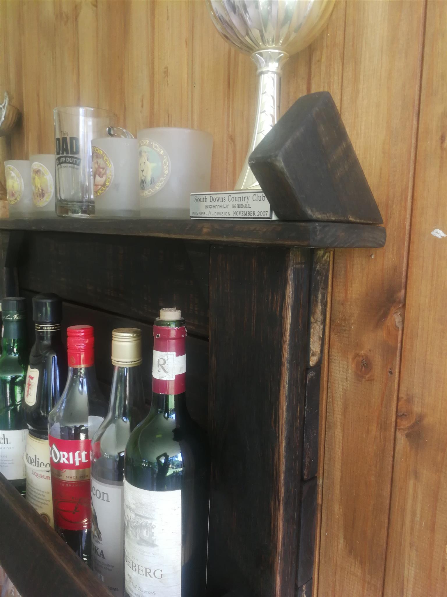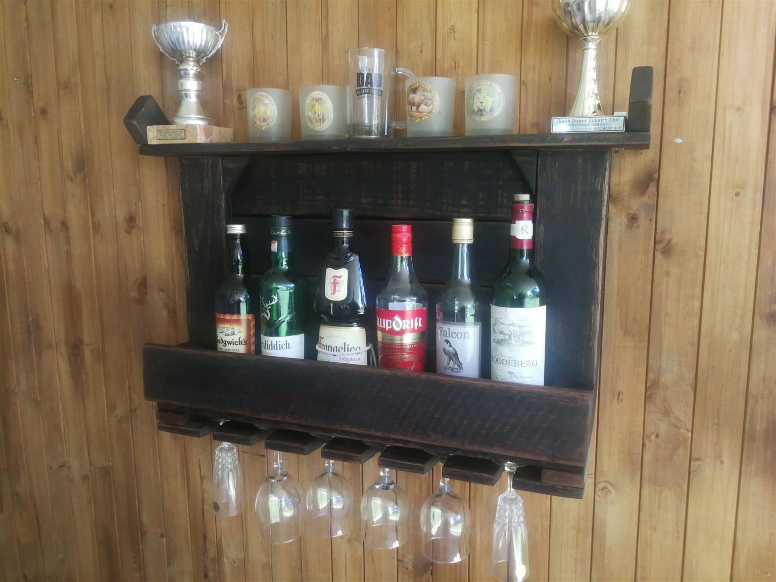 Custom made Bar Rack ideal for a home/business pub. Holds 6 Wine glasses (Bottom shelf), 6 Bottles of Liquor/Wine and 10 whiskey/brandy glasses (Top Shelf) To be collected in Brackenhurst (Alberton) Contents not incl. Cash only pls