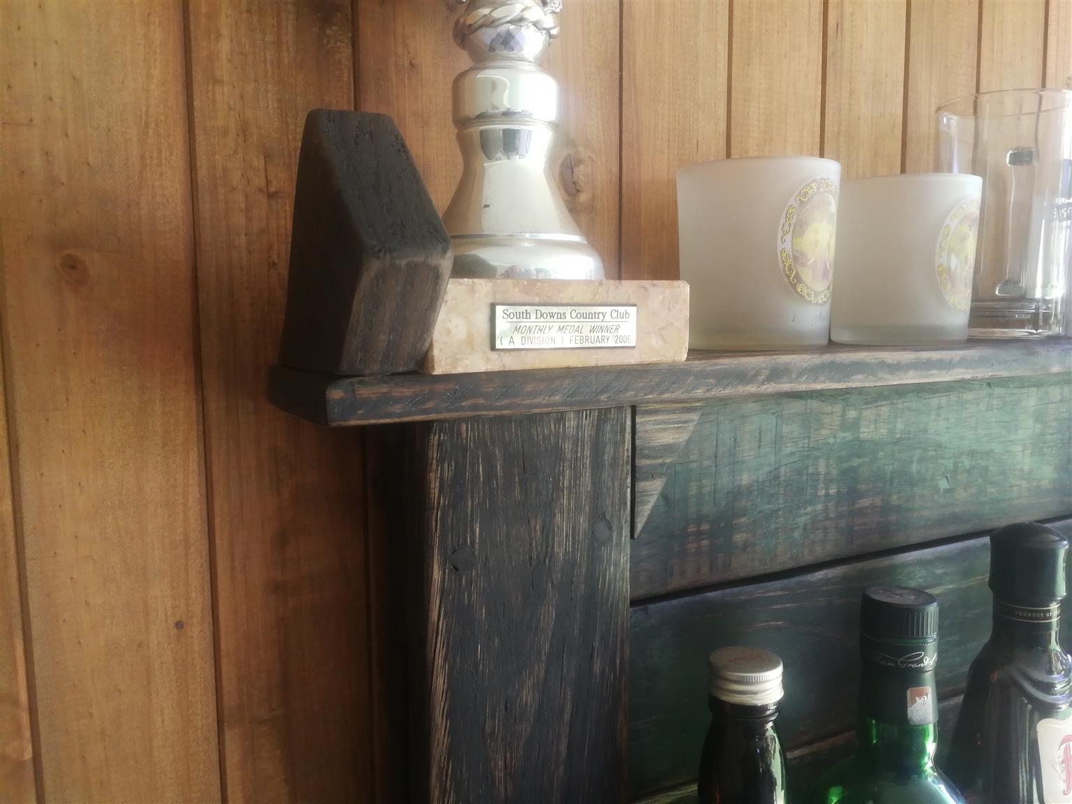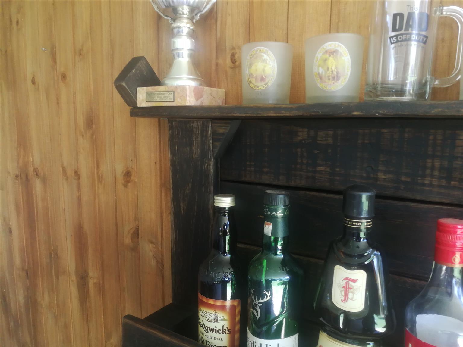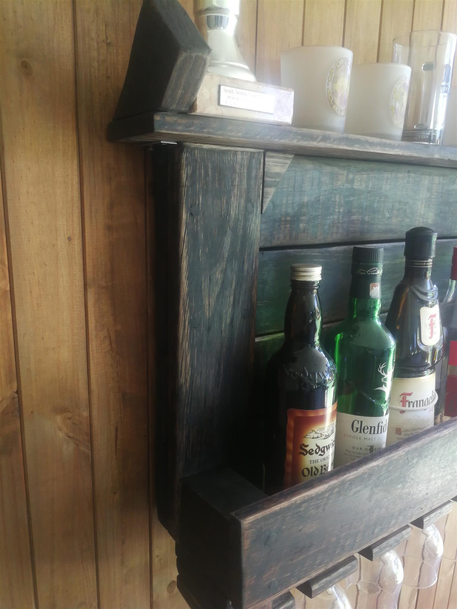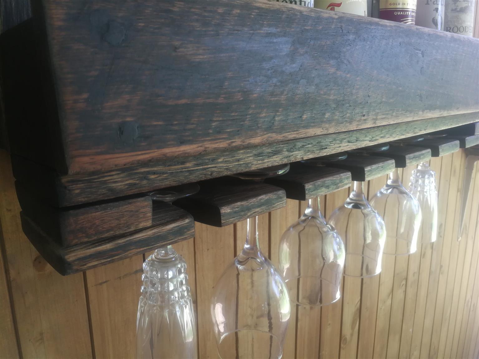 Custom made Bar Rack ideal for a home/business pub. Holds 6 Wine glasses (Bottom shelf), 6 Bottles of Liquor/Wine and 10 whiskey/brandy glasses (Top Shelf) To be collected in Brackenhurst (Alberton) Contents not incl. Cash only pls