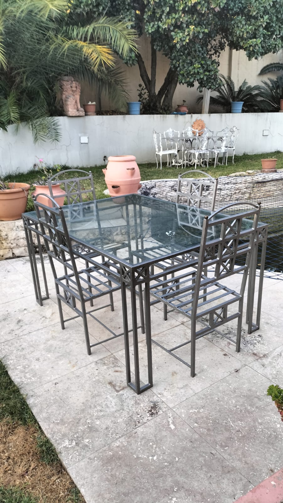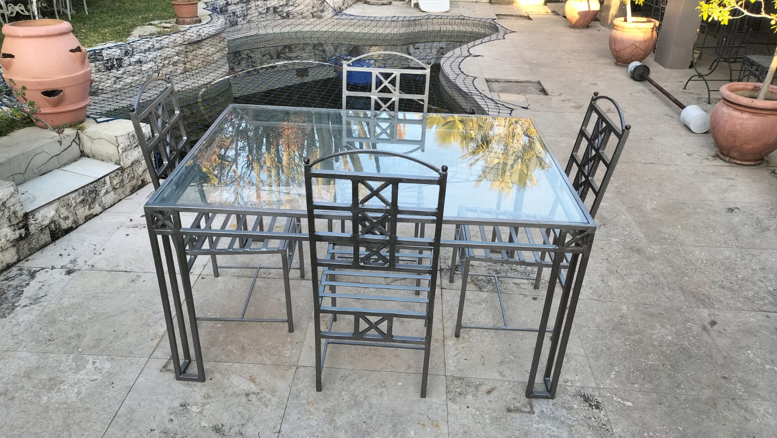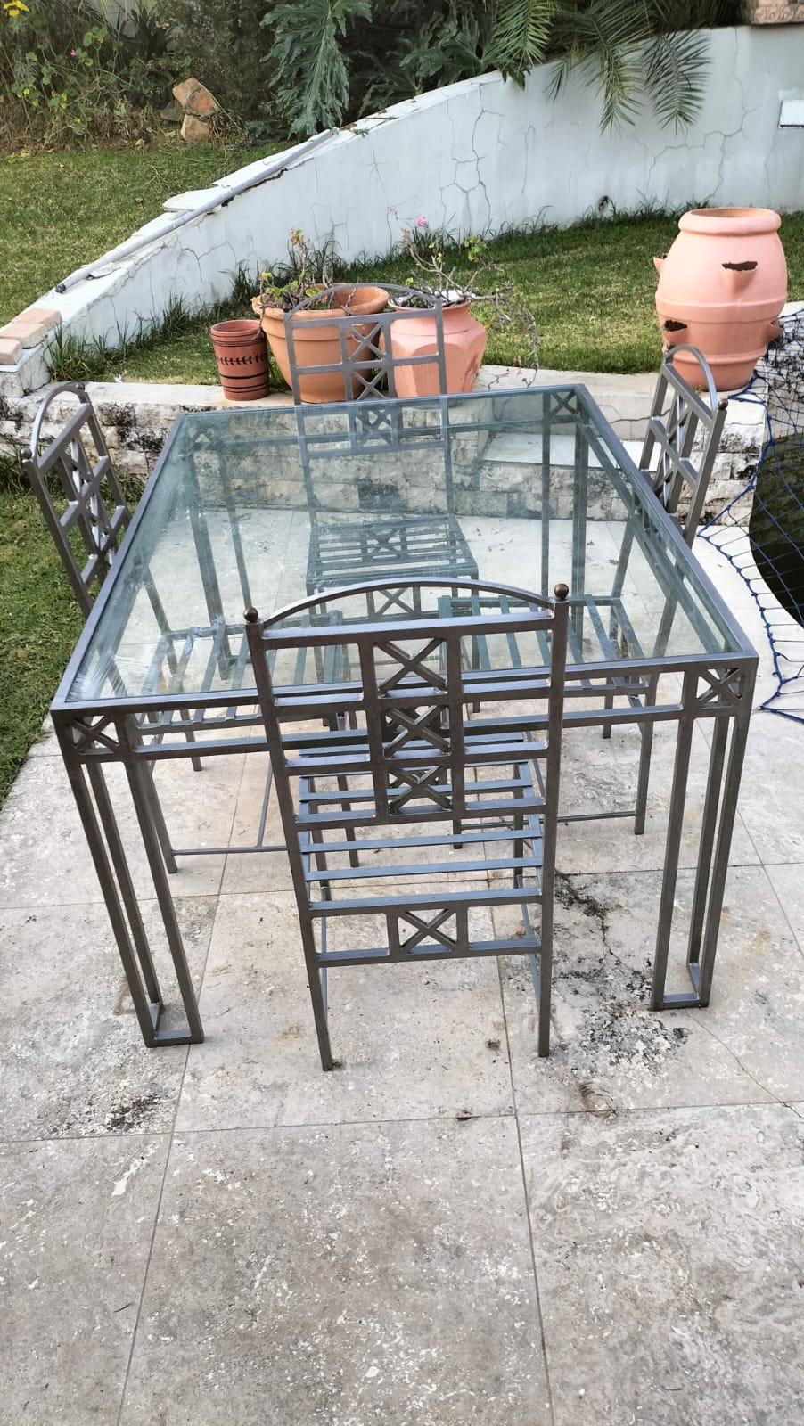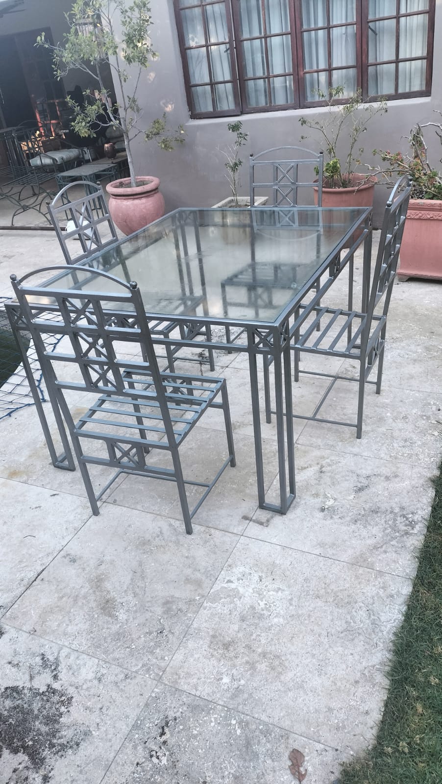 This durable, quality, contemporay set was made to 6 seater table dimensions with 4 chairs for spaciousness and comfort. It has been totally refurbished with modern grey, anti-rust paint. To buy this eqivalent, quality set new today one would pay from R12000 and above. Contact now so you will not be disappointed!
