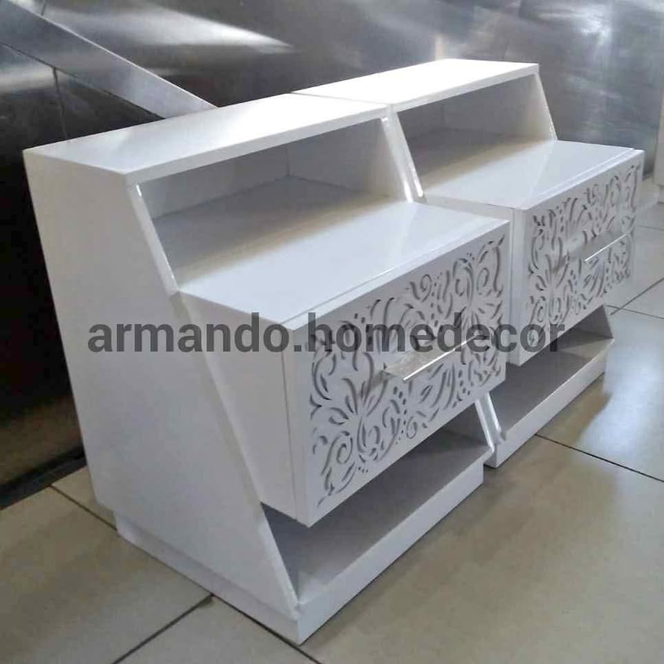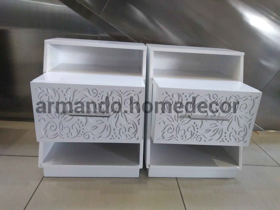 Set of 2 white pedestals. These bedside tables are made of wood and have a laser cut Moroccan design on the drawer with a silver colour handle. The side is slanted giving a modern look to your bedroom. There is a shelf on top and below the drawer for storage. Approx size : 45x45x60cm R1700 for 2 Collection is from our store in Midrand or delivery is available with cash on delivery. Please WhatsApp to order. More designs available. Please see my other adverts.