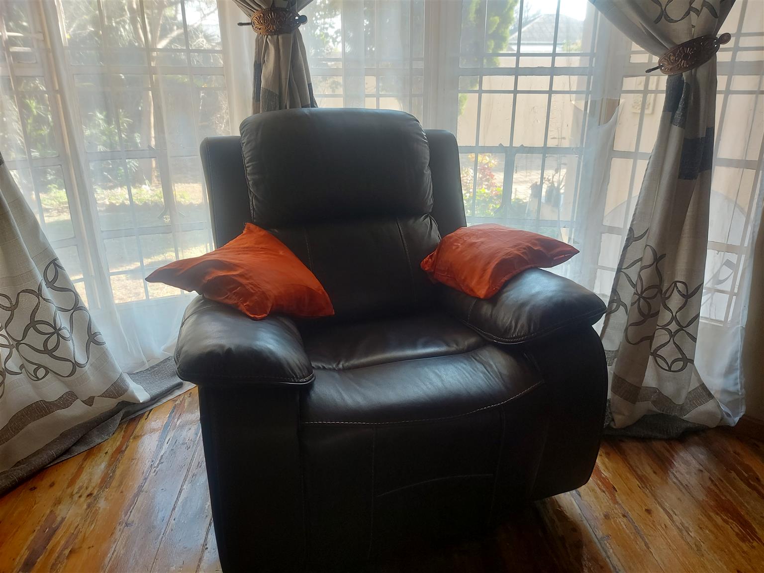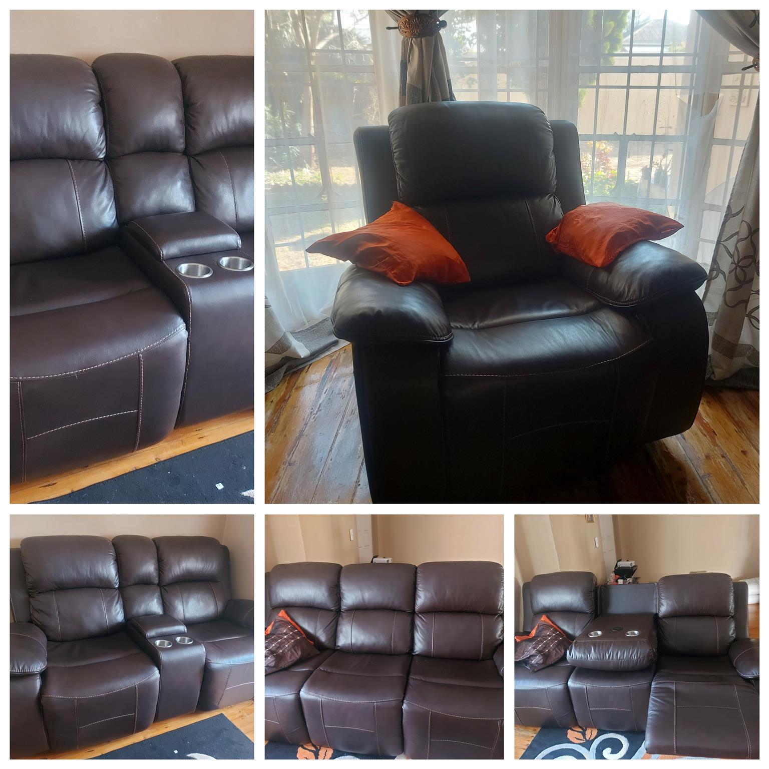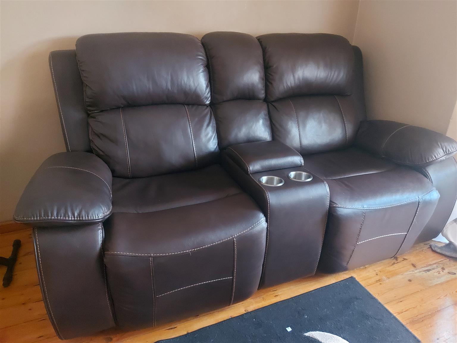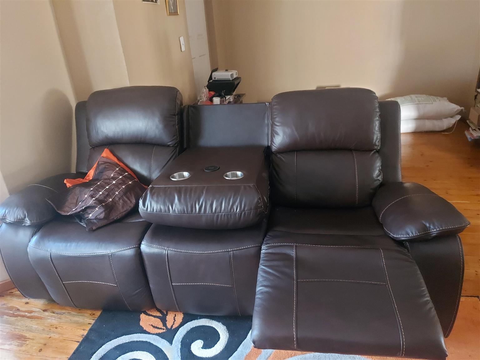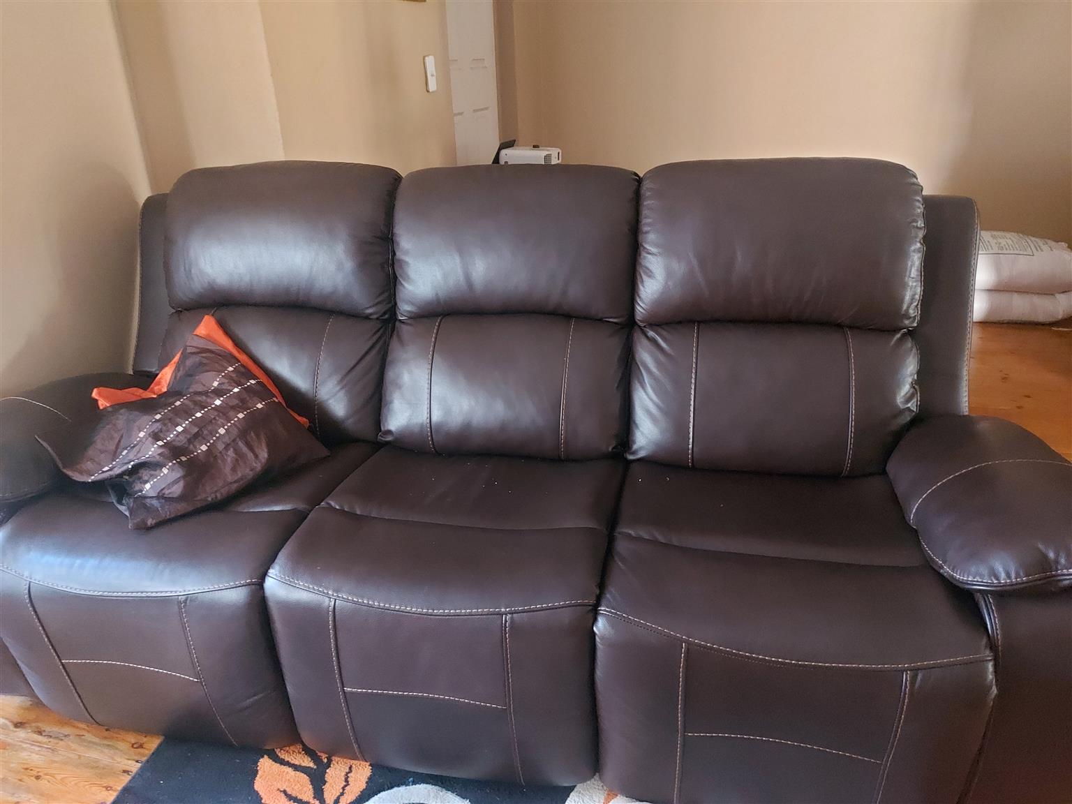 3 piece leather upper sofas with reclining seats almost new bought 1.5 years ago .Seller is relocating