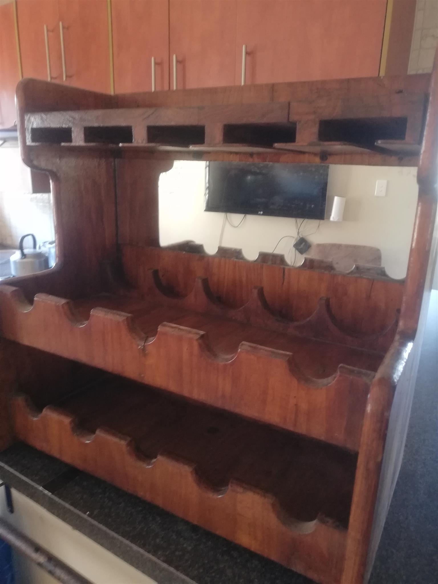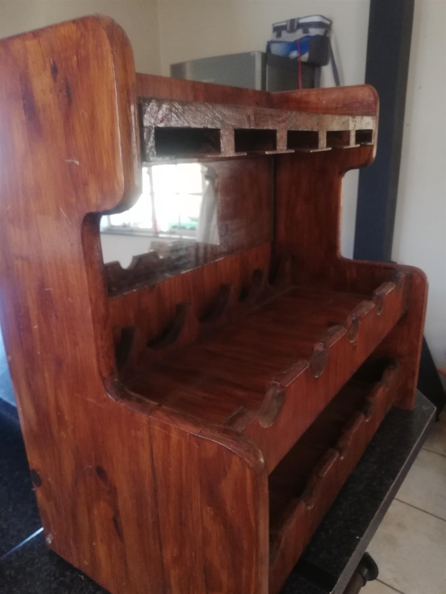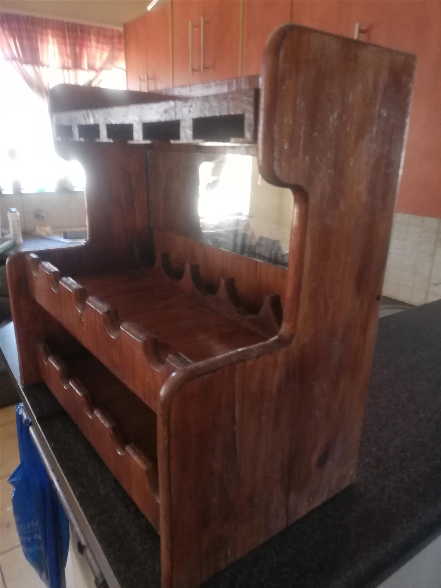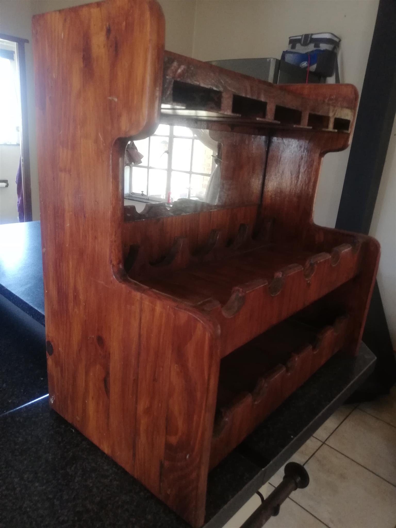 Wooden wine rack with rear mirror. Can take up to 10 bottles of wine and multiple wine glasses. Nice addition to any bar. ONCO