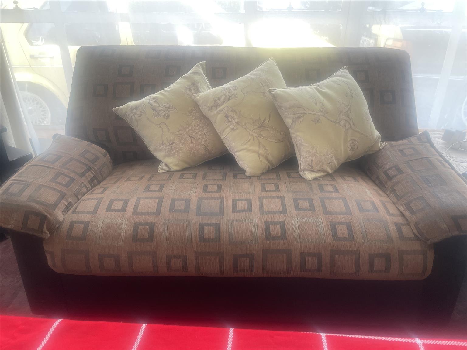 Used, strong, 3 Piece Lounge Suite. The fabric is slightly worn.