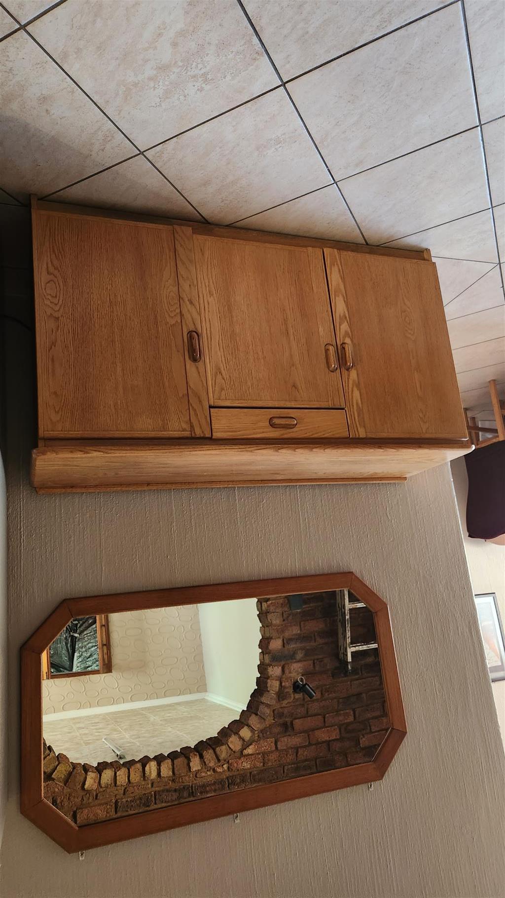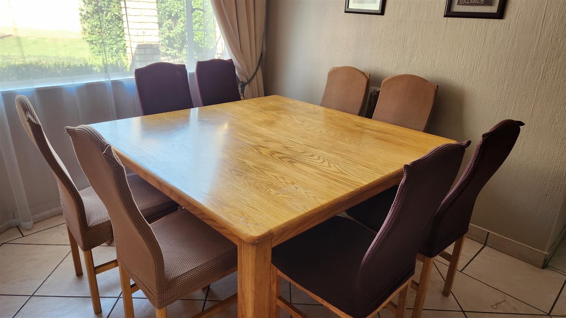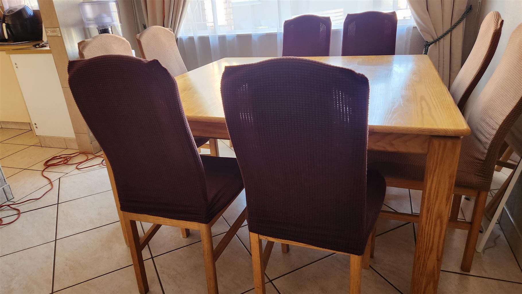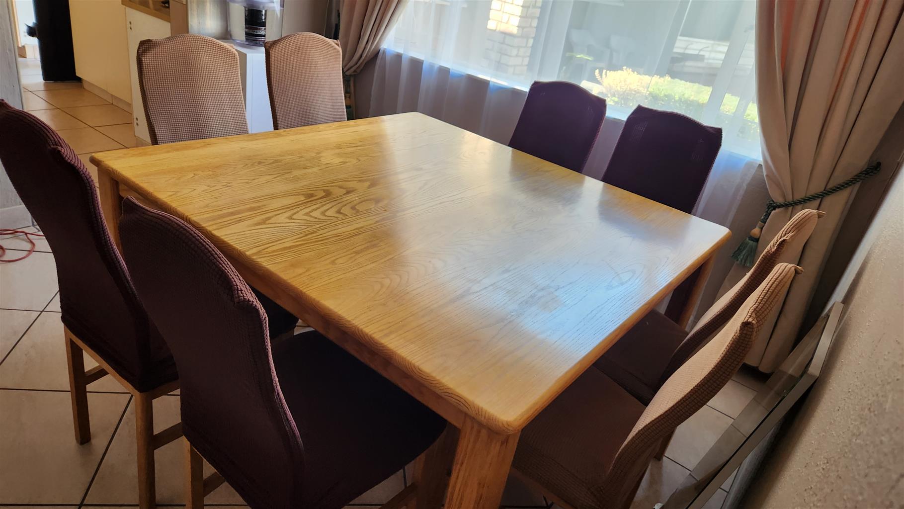 8 seater dining room table with chairs and covers, matching side board and mirror. Excellent condition solid pine.