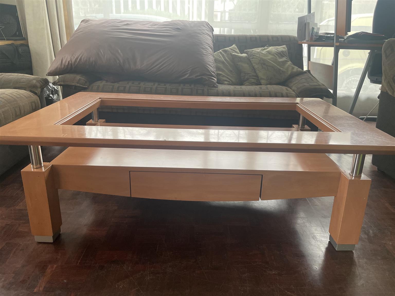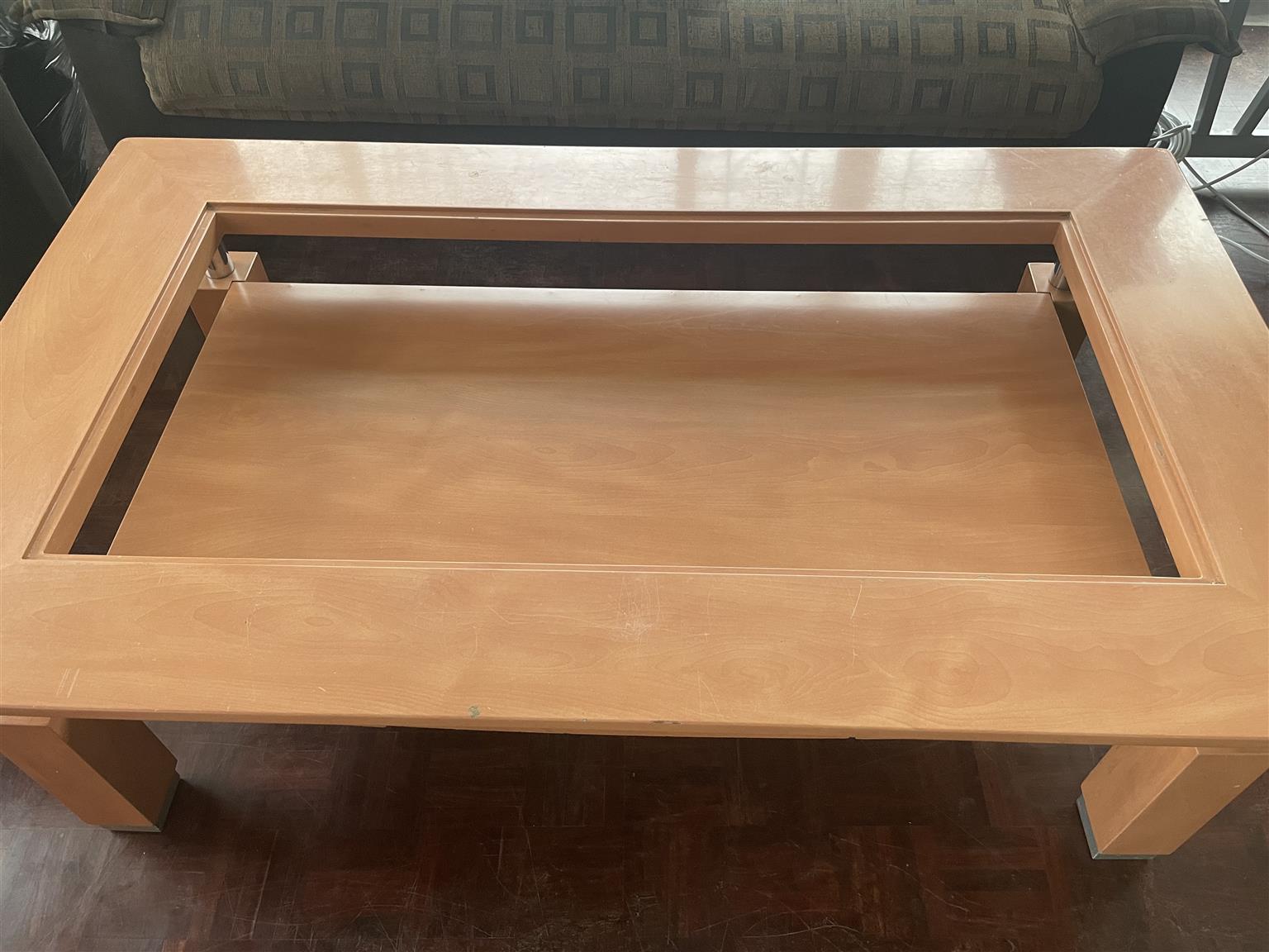 Solid, heavy wood coffee table.