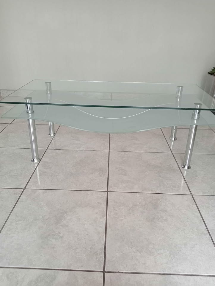 Solid glass coffee table with frosted under glass, it has lovely solid chrome legs. Excellent show piece for any lounge.