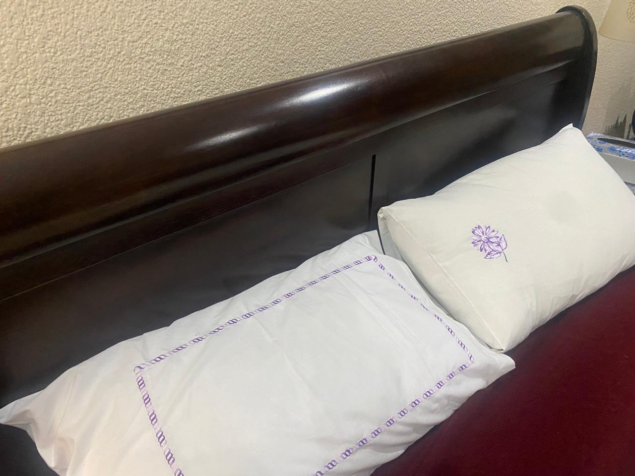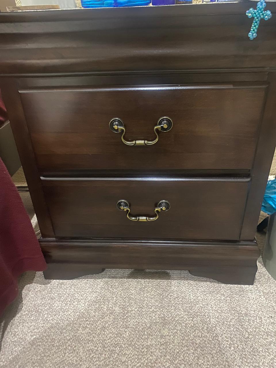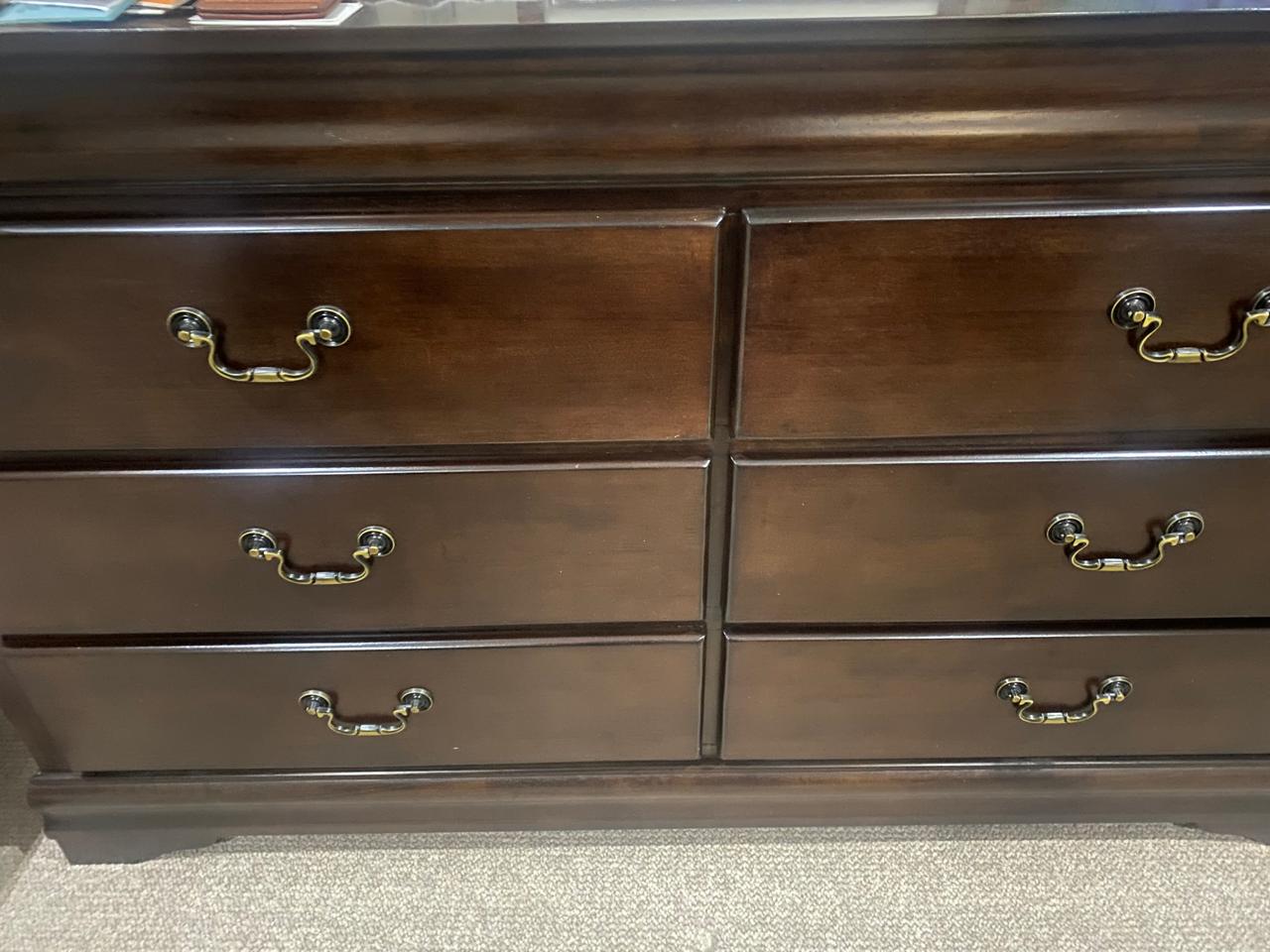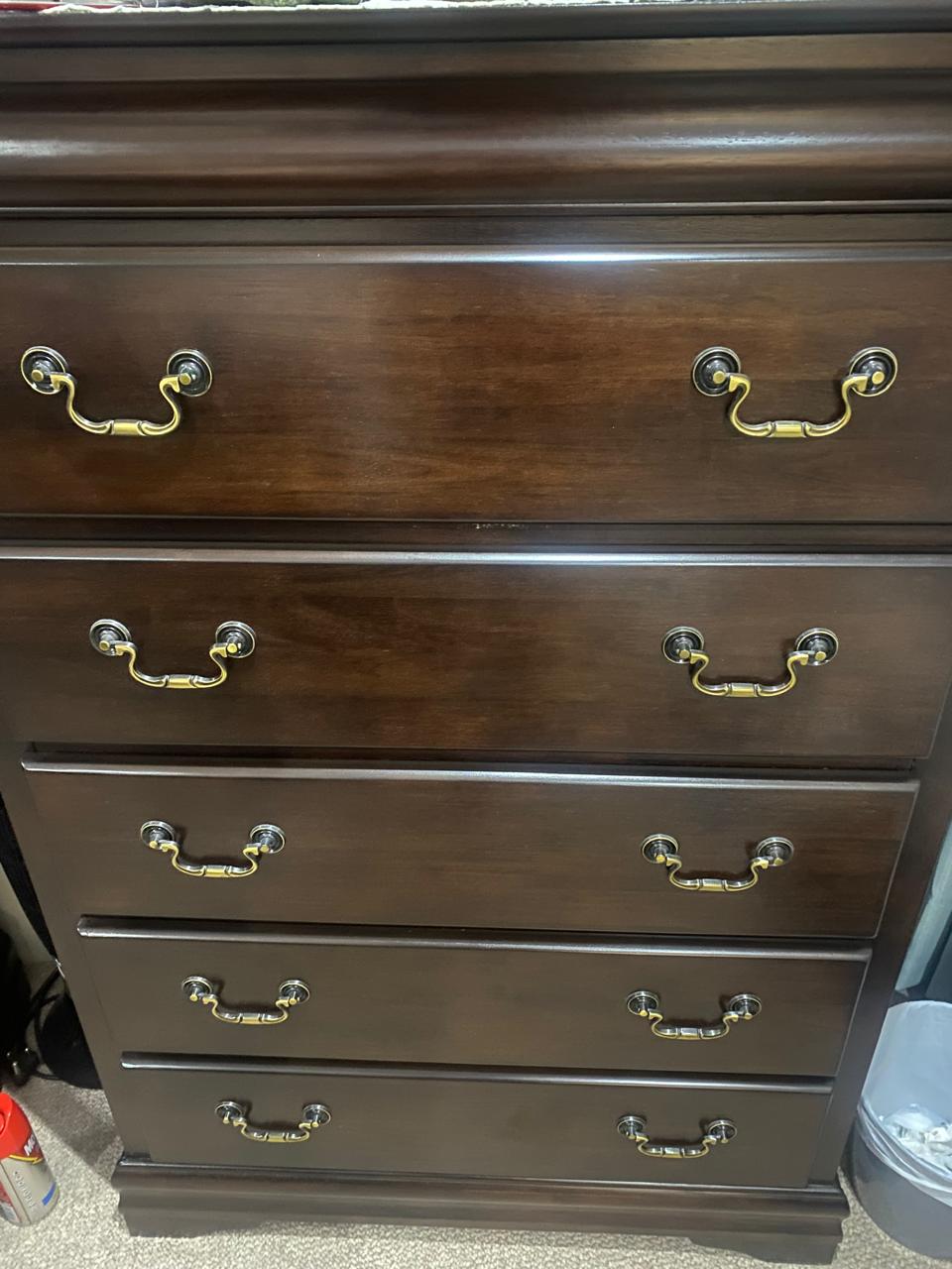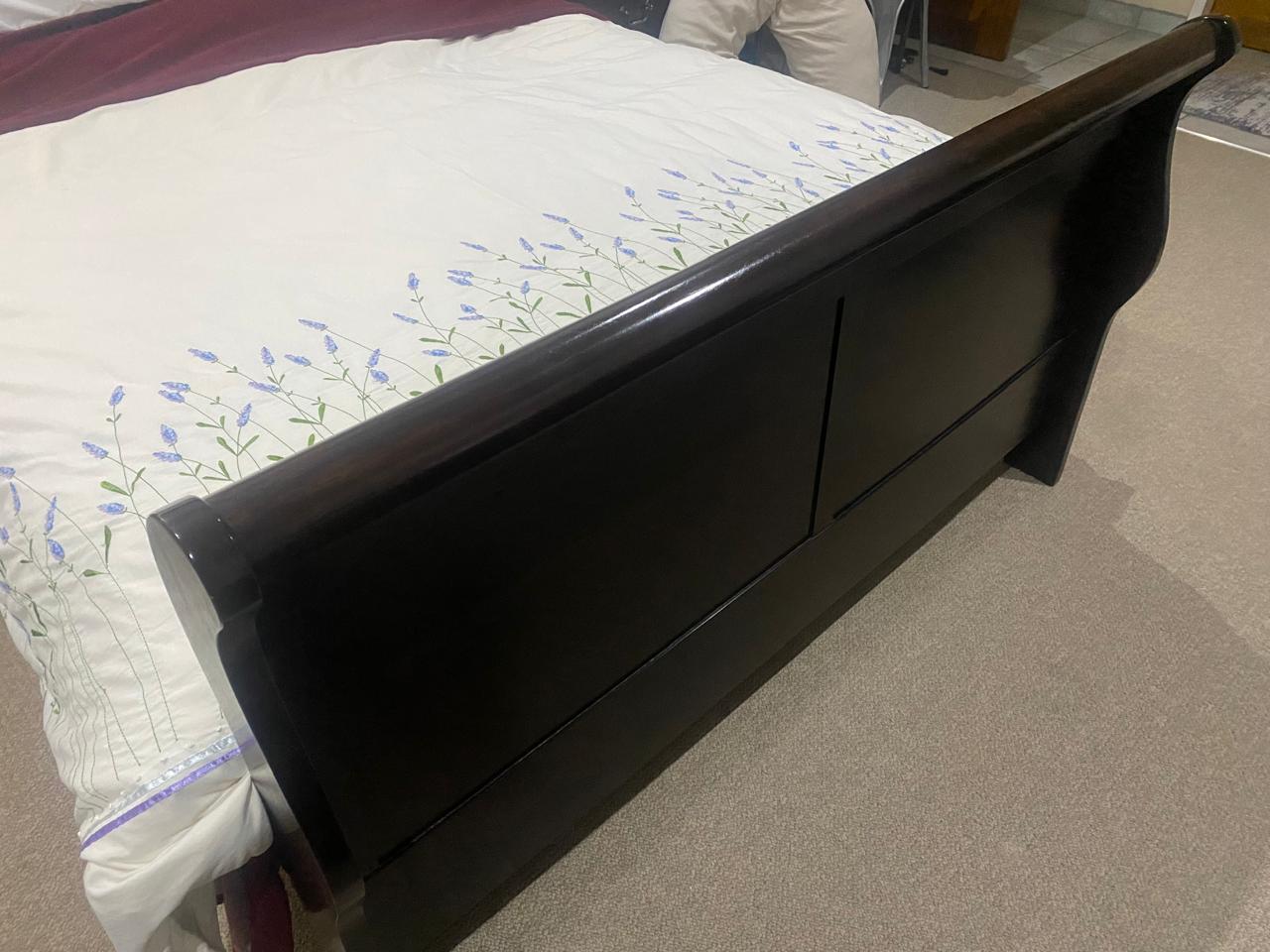 Dark wood sleigh bed bedroom suite - Dark wood, Queen XL-size bed with slats, (no base) and two bedside cabinets, an eight drawer cabinet and a six drawer cabinet for sale. All still in very good condition.