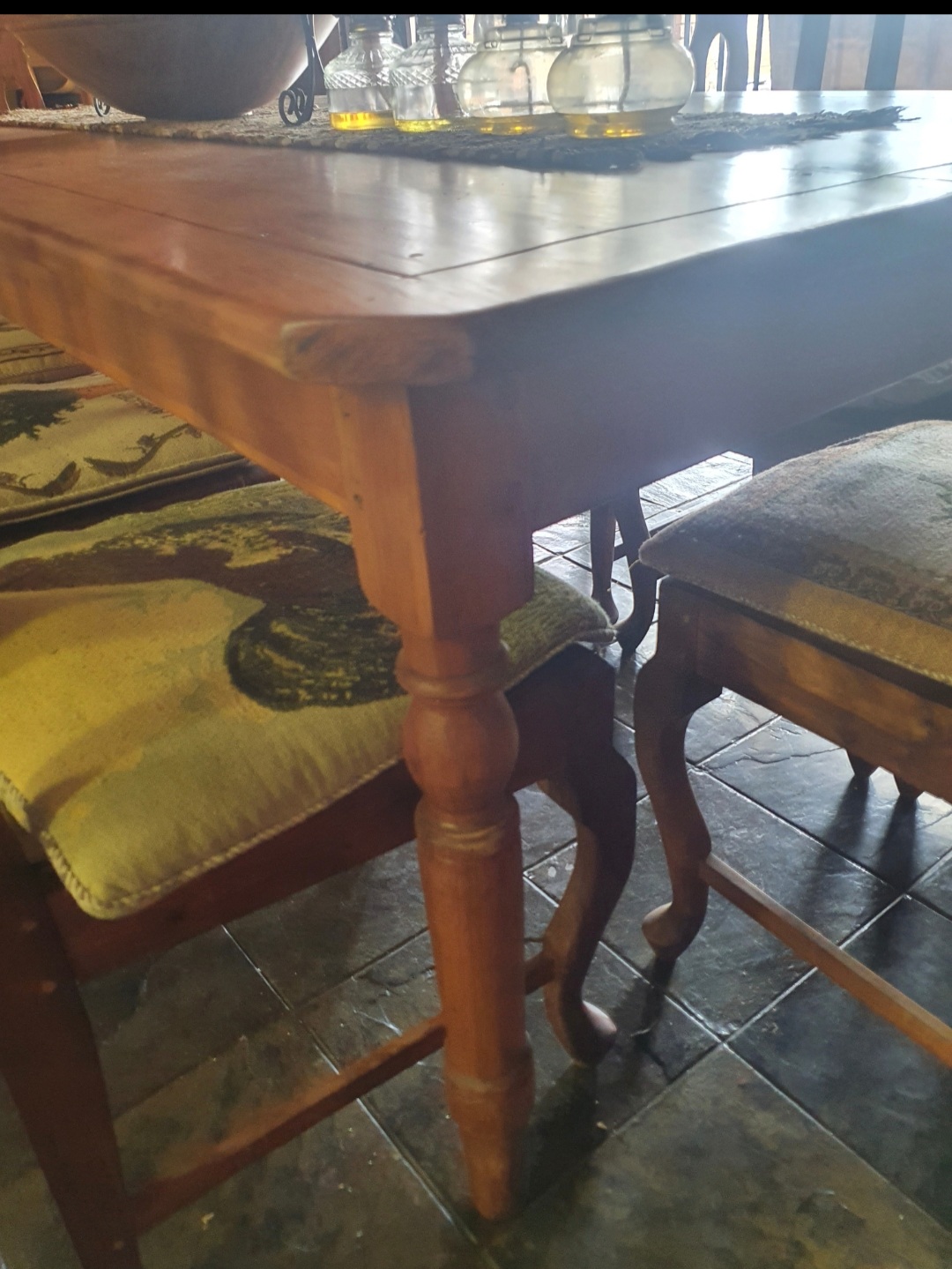 Antique Oregan pine table, very strong, plus 6 kiaat wood riempie chairs. Ideal for schools, old age homes, restaurants, after care schools, home schooling, creative arts and all other training. Neg