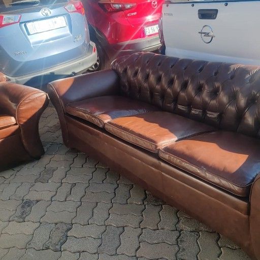 Genuine leather Chesterfield couches, removable cushions, comfortable, these will last a lifetime, brown in color, must be seen to be appreciated, only 3 & 1 seater available