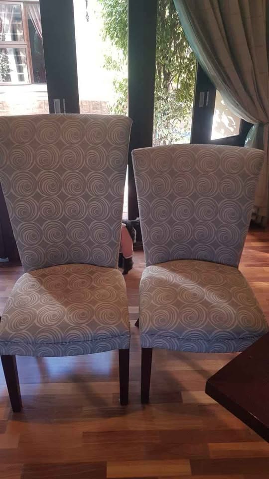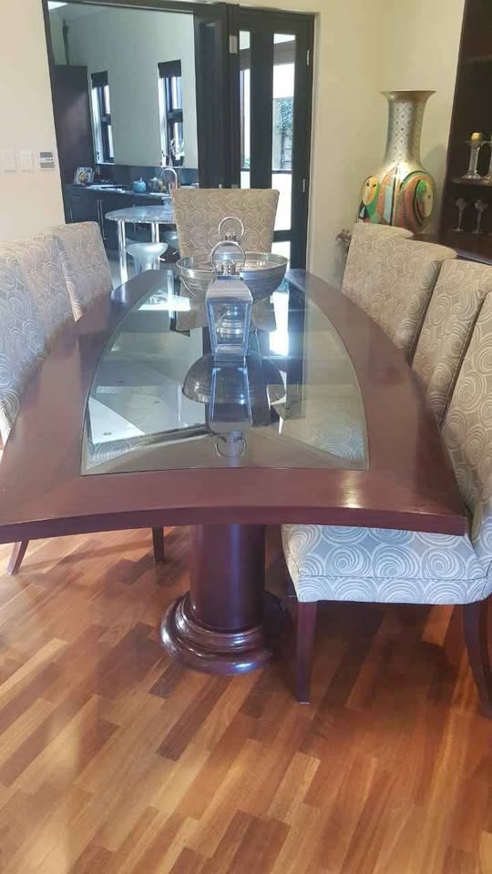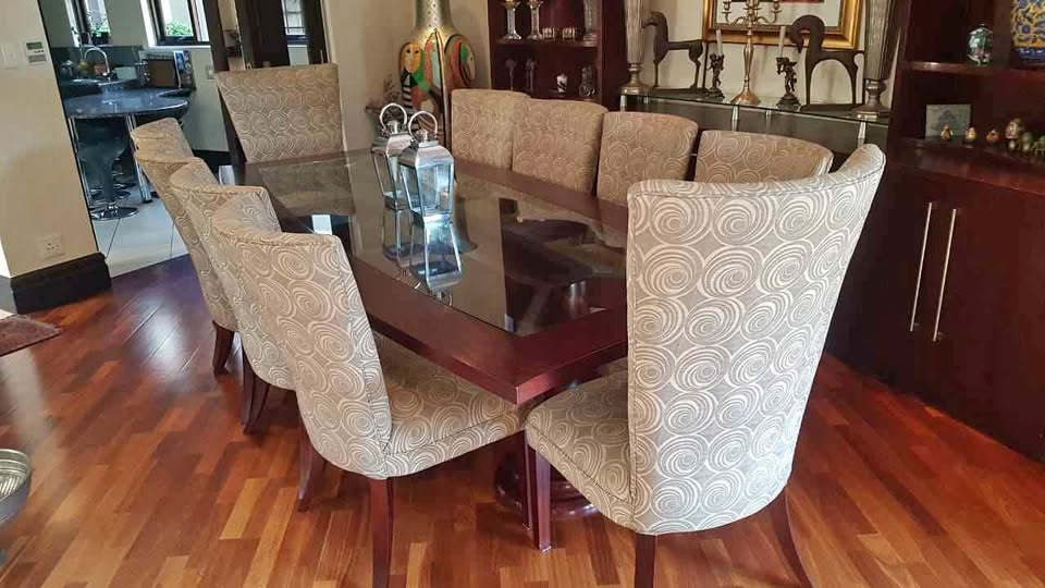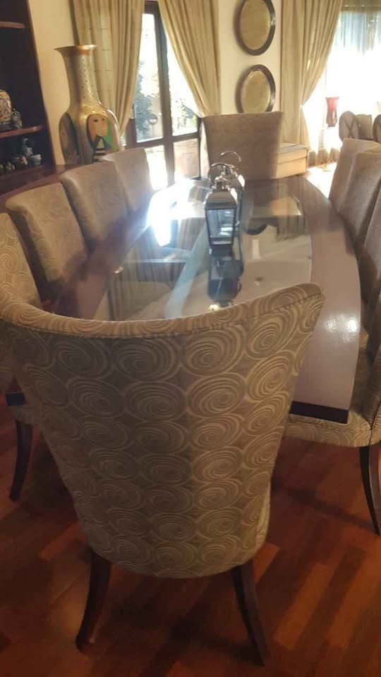 Elevate your dining experience with this exquisite Danic Dining Table and Chairs from Da Rocha Interiors. Handcrafted with solid mahogany and featuring a timeless design, this set is a masterpiece of elegance and quality. The patterned upholstery on the chairs adds a touch of sophistication, making it the perfect centerpiece for memorable gatherings. Collection in Bedfordview. Delivery can be arranged at an additional cost Serious buyers only please Contact Jackie on if you are interested