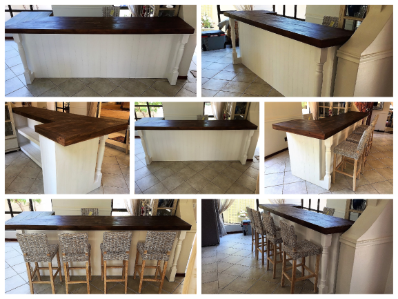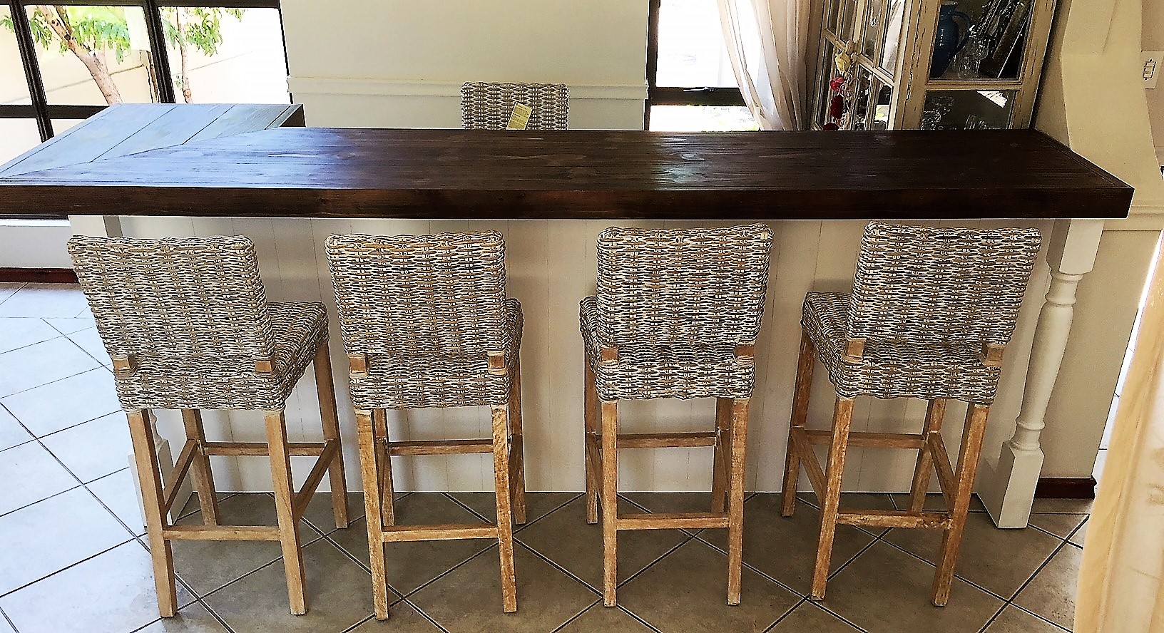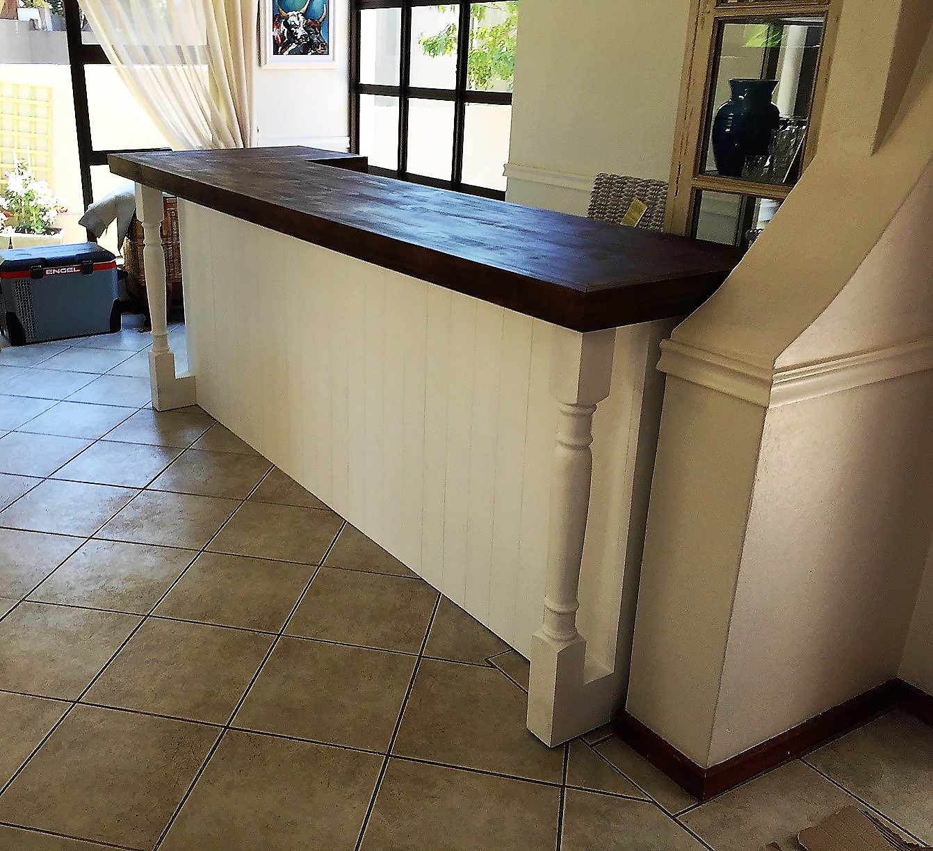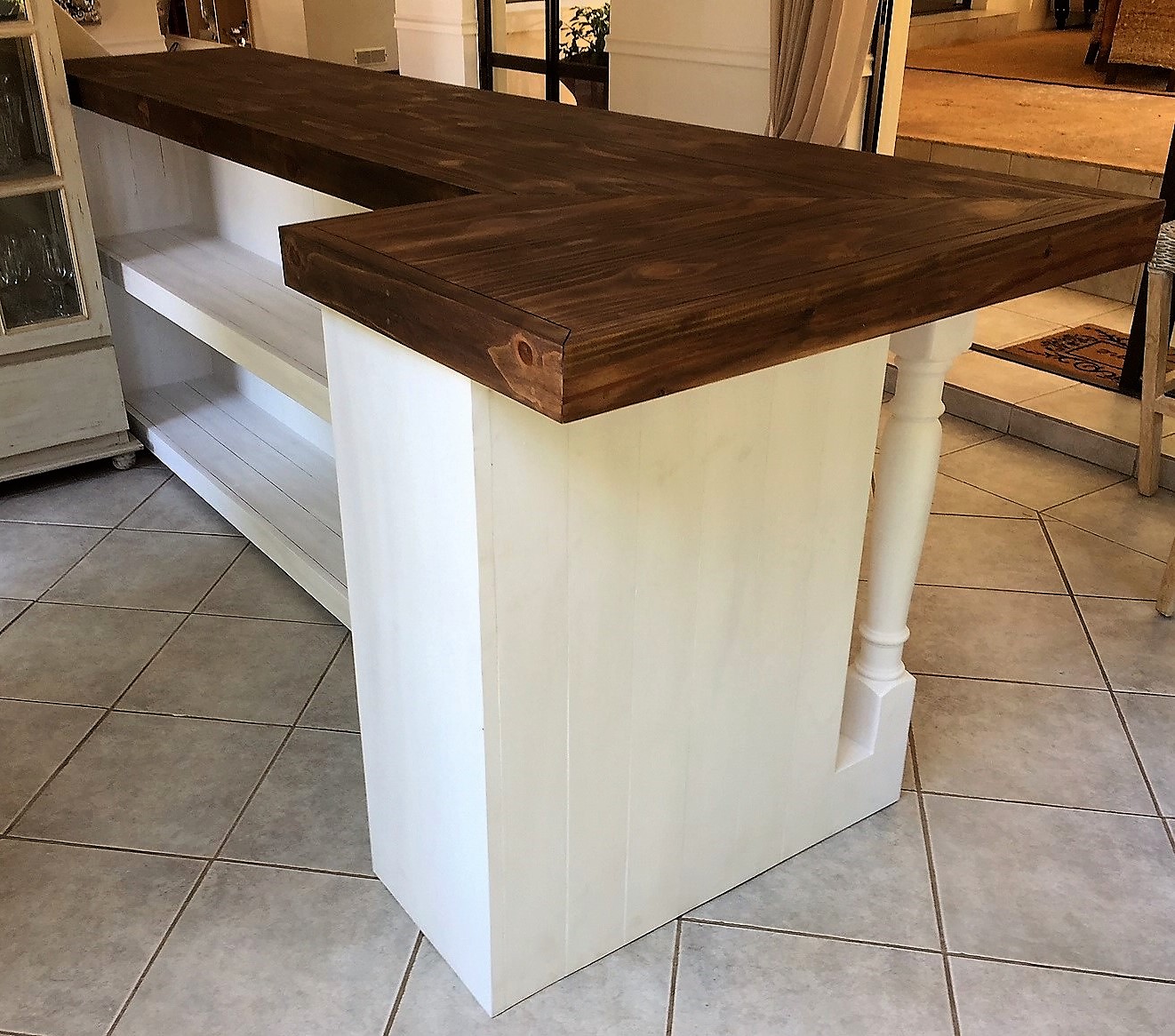 This fantastic hand-crafted design with dark stained top and white stained body makes it a showcase piece for the entertainer at home or at the Office. Beautiful top with over-hang rounded of with very nice turned legs at the front. Very versatile piece. Can also be used as a Reception Counter, Coffee bar etc. Bar stools excluded.