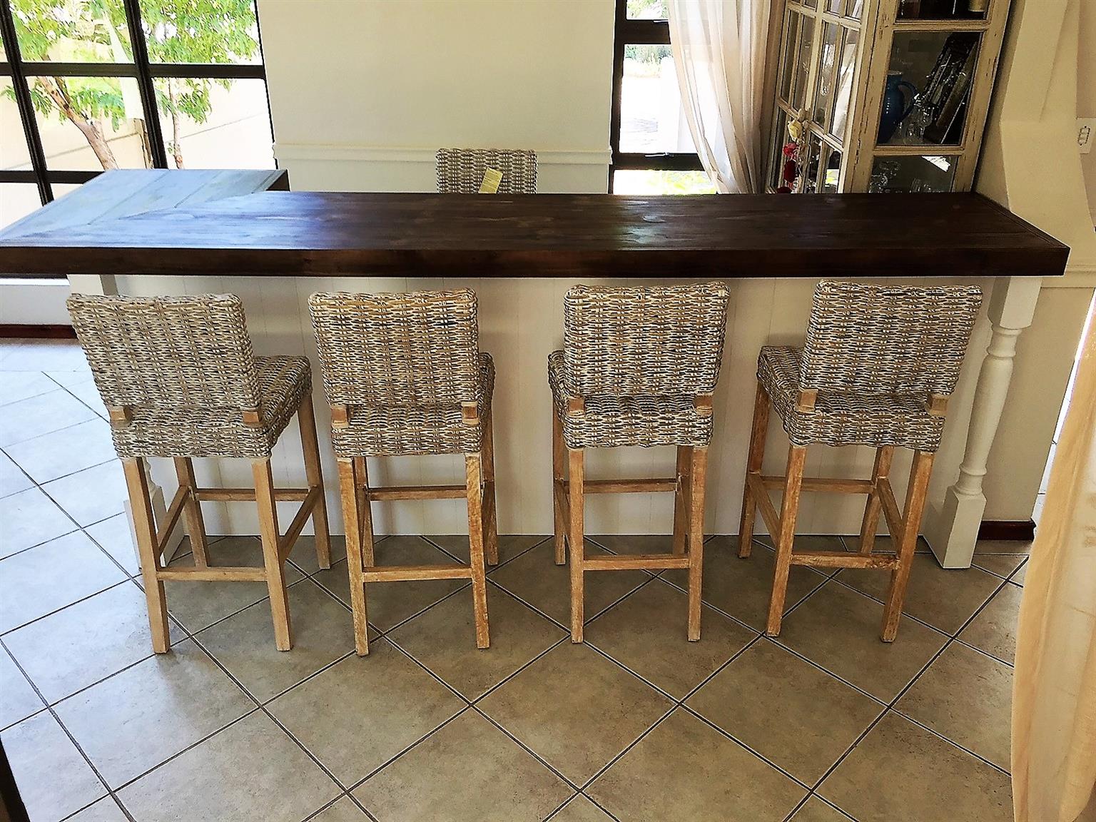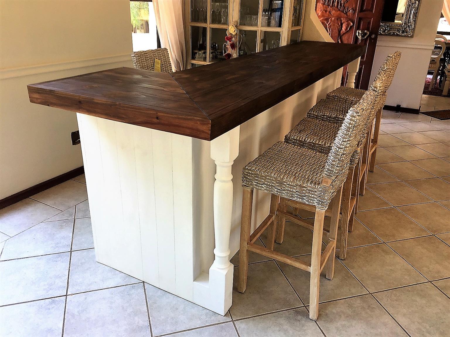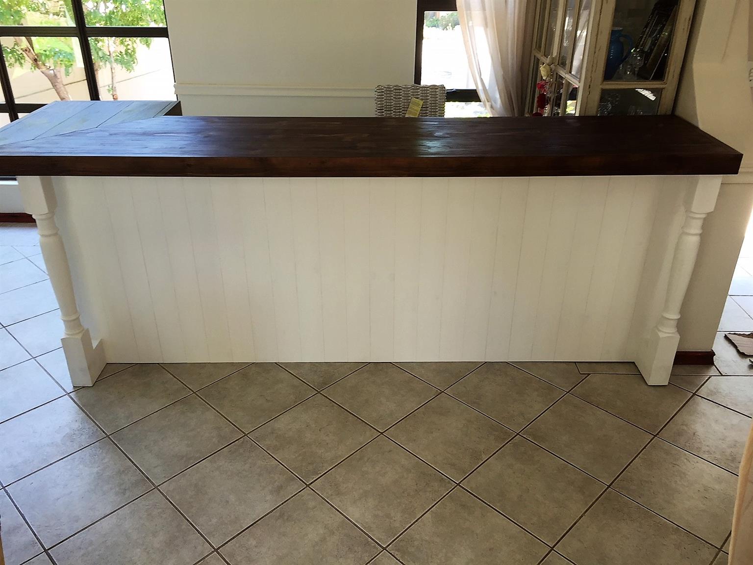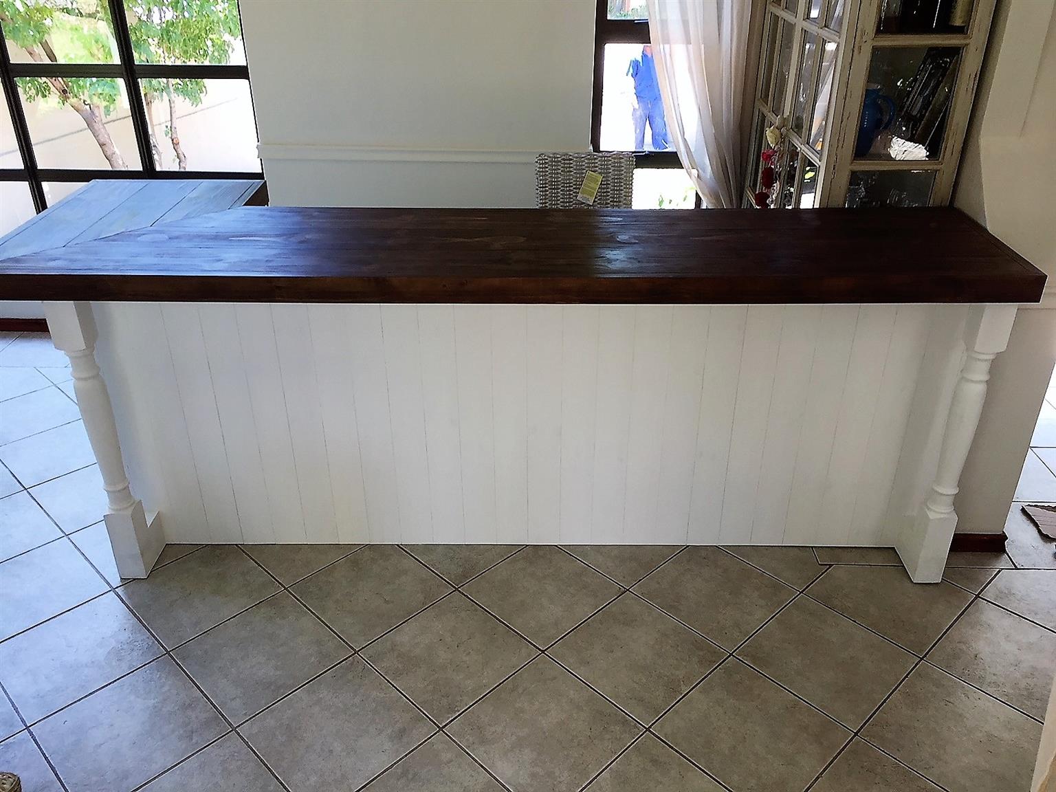 This fantastic hand-crafted design with dark stained top and white stained body makes it a showcase piece for the entertainer at home or at the Office. Beautiful top with over-hang rounded of with very nice turned legs at the front. Very versatile piece. Can also be used as a Reception Counter, Coffee bar etc. Bar stools excluded.