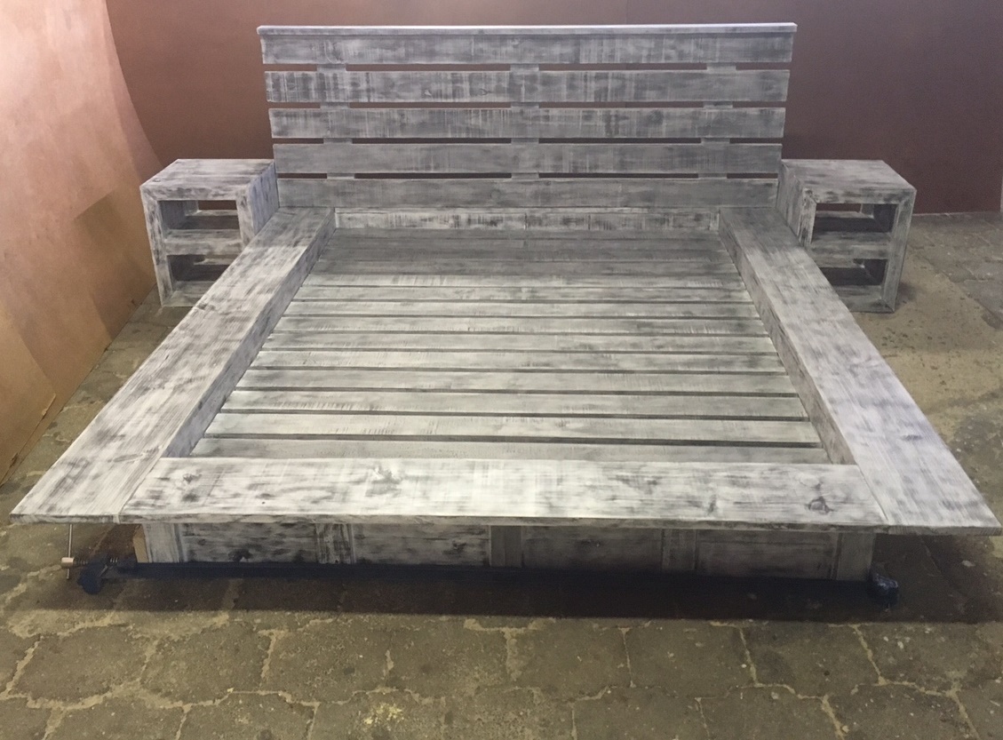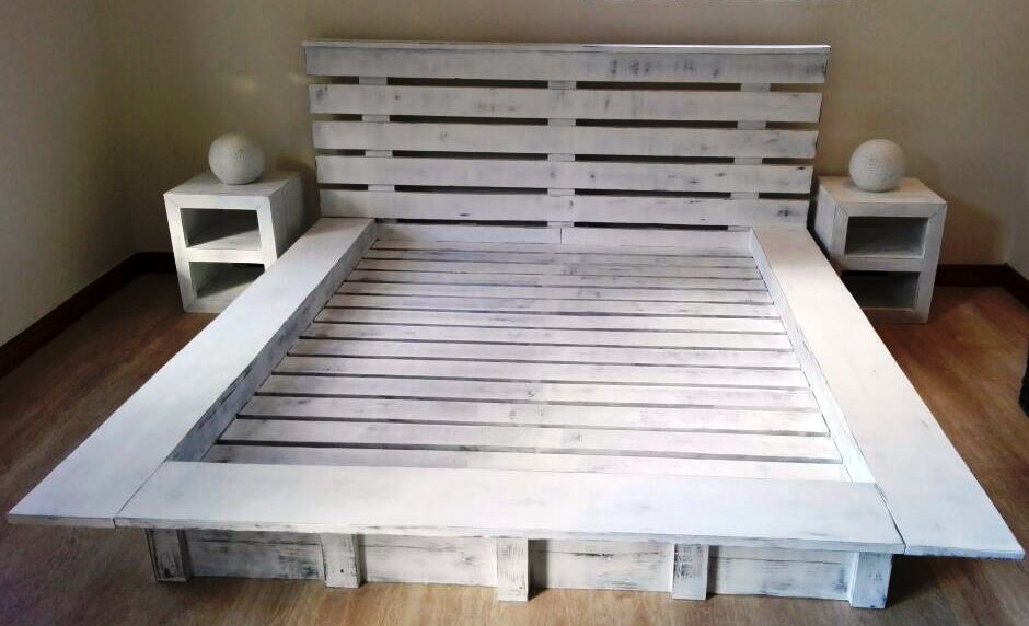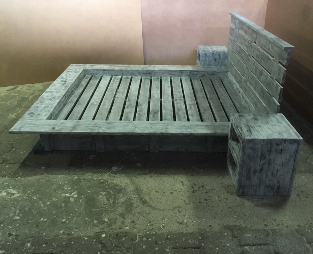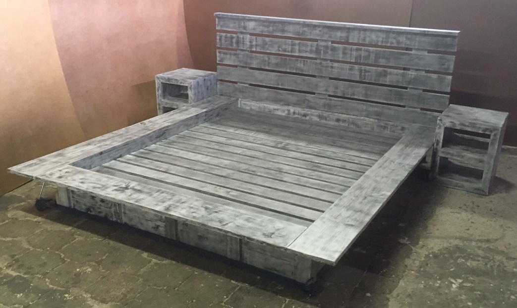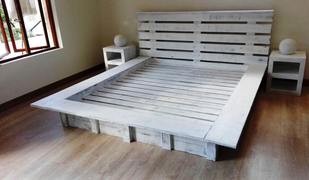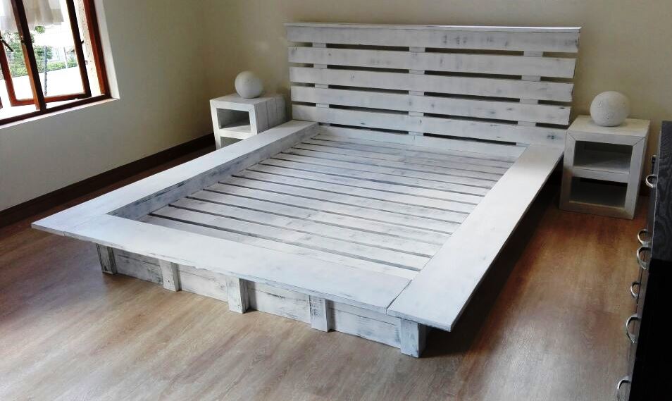 Beautiful Chalk painted and distressed combo consisting of the "box", headboard and 2 x Night stands. Mattress and other extras excluded. This hand-made combo is very solid and easy on the eye!. Mattress sunken 100mm.