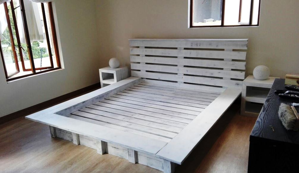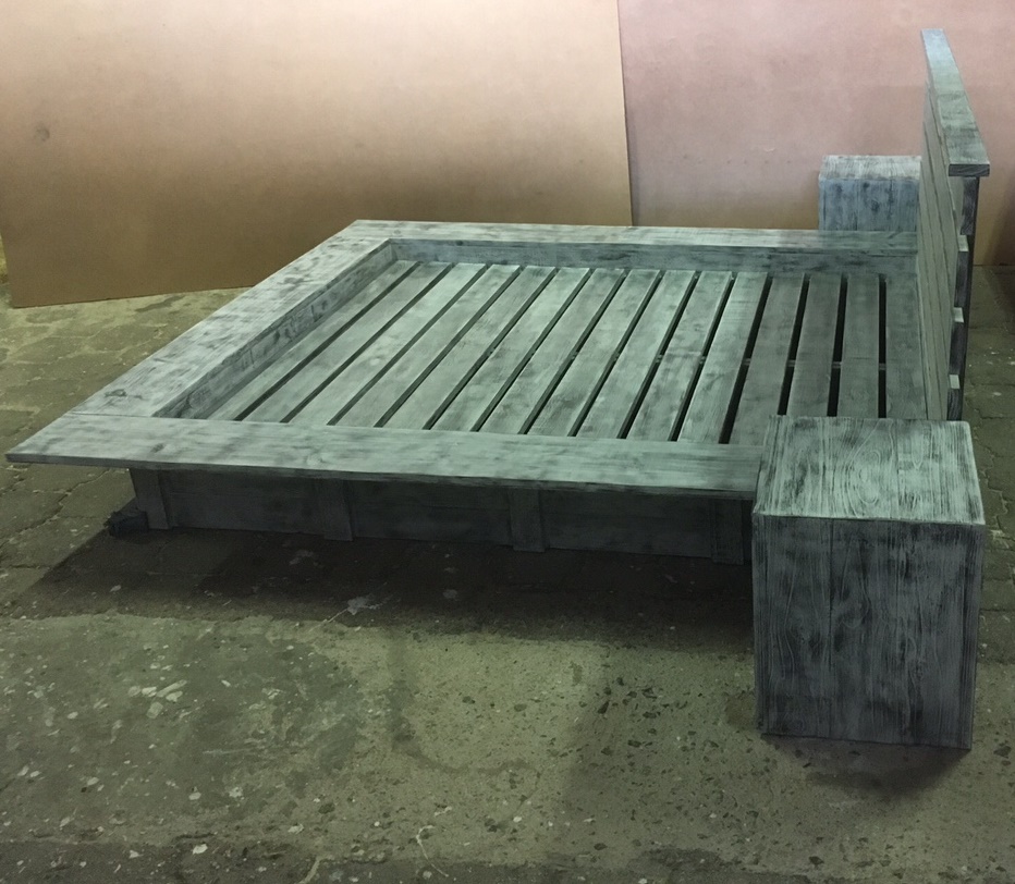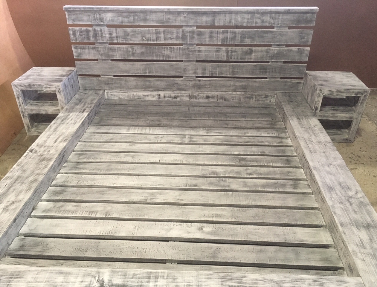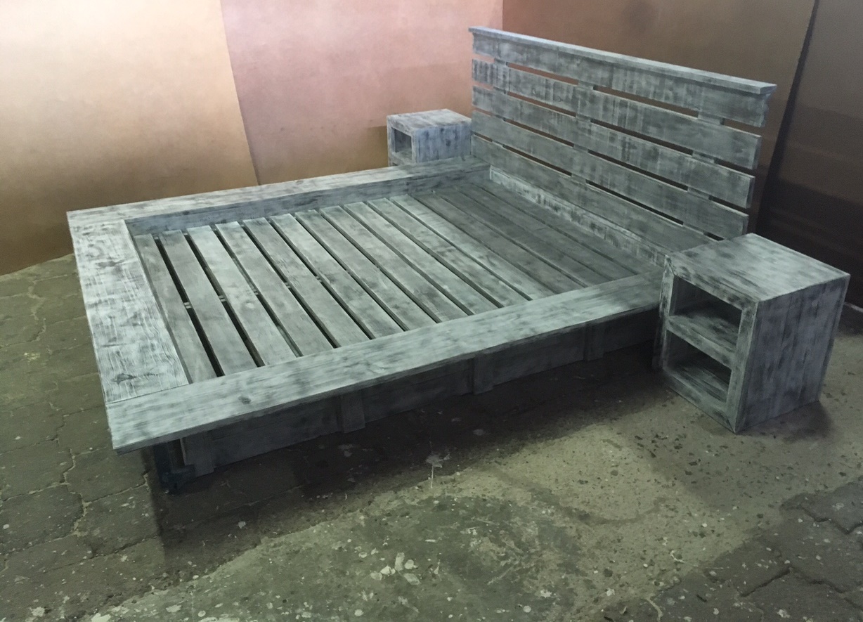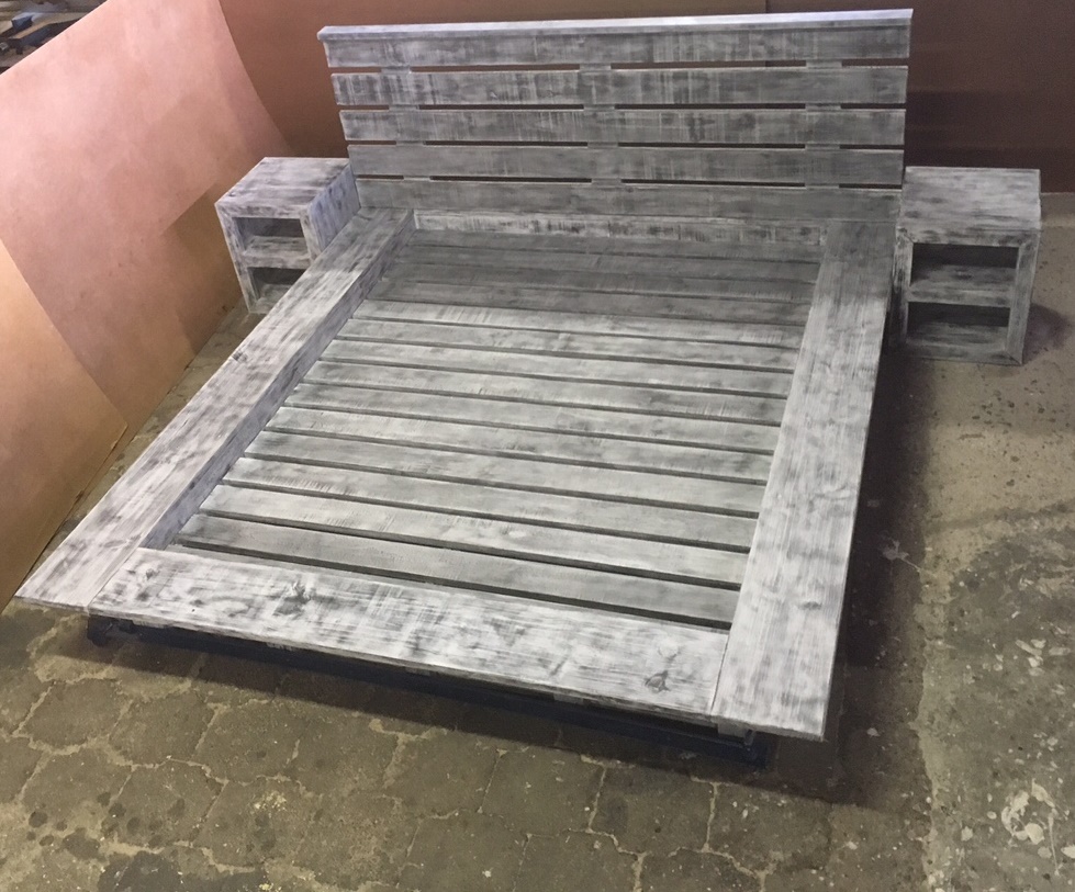 Beautiful Chalk painted and distressed combo consisting of the "box", headboard and 2 x Night stands. Mattress and other extras excluded. This hand-made combo is very solid and easy on the eye!. Mattress sunken 100mm.