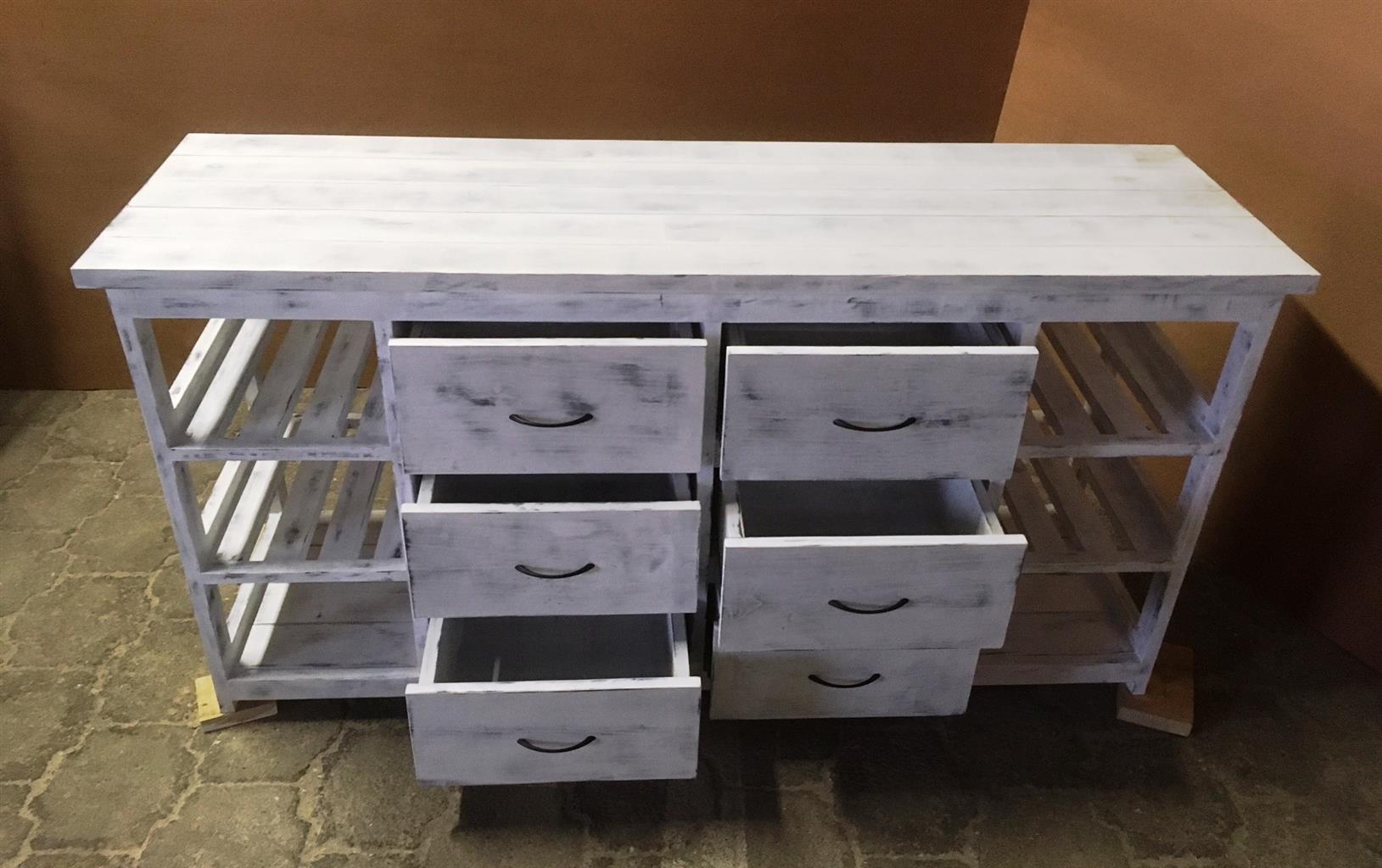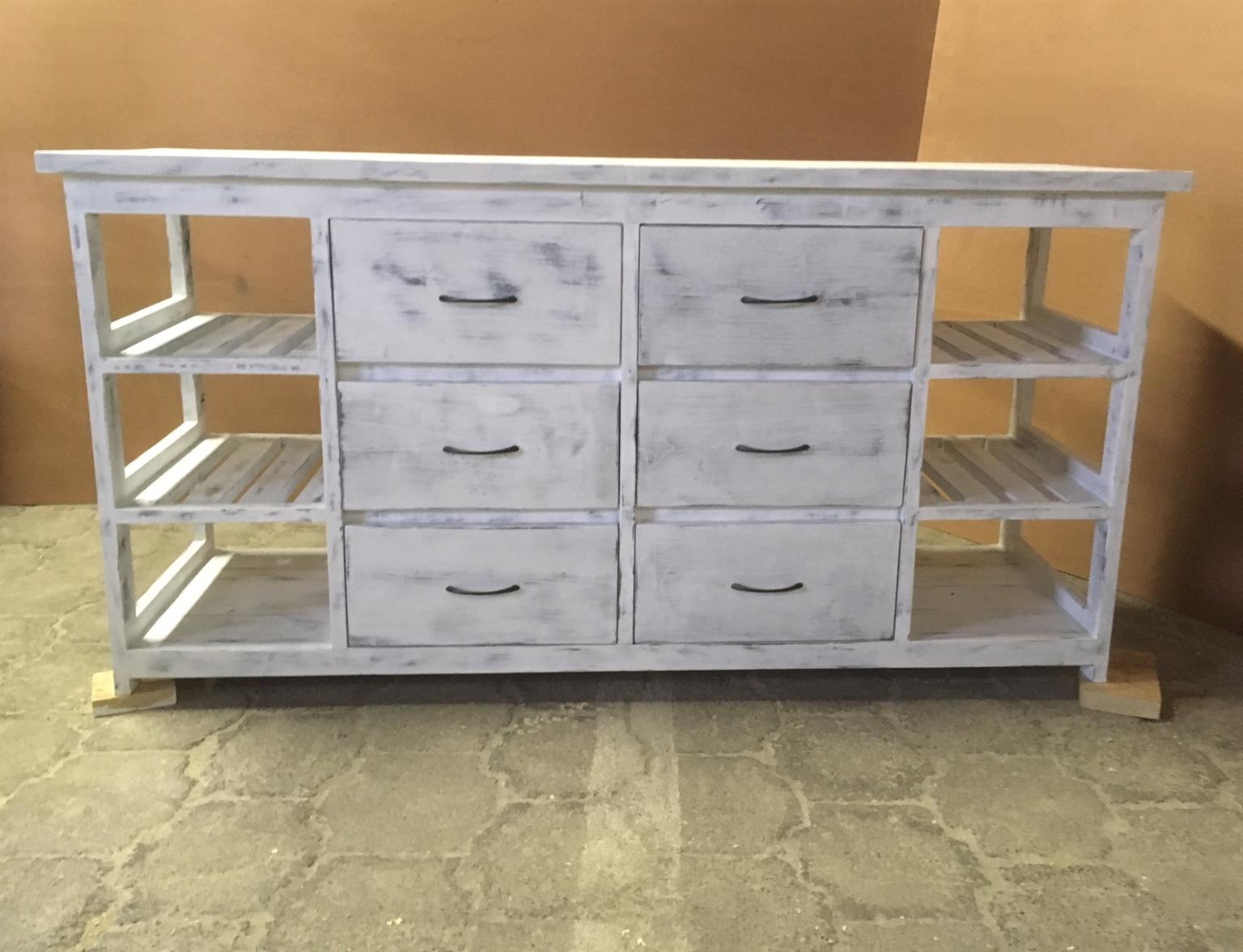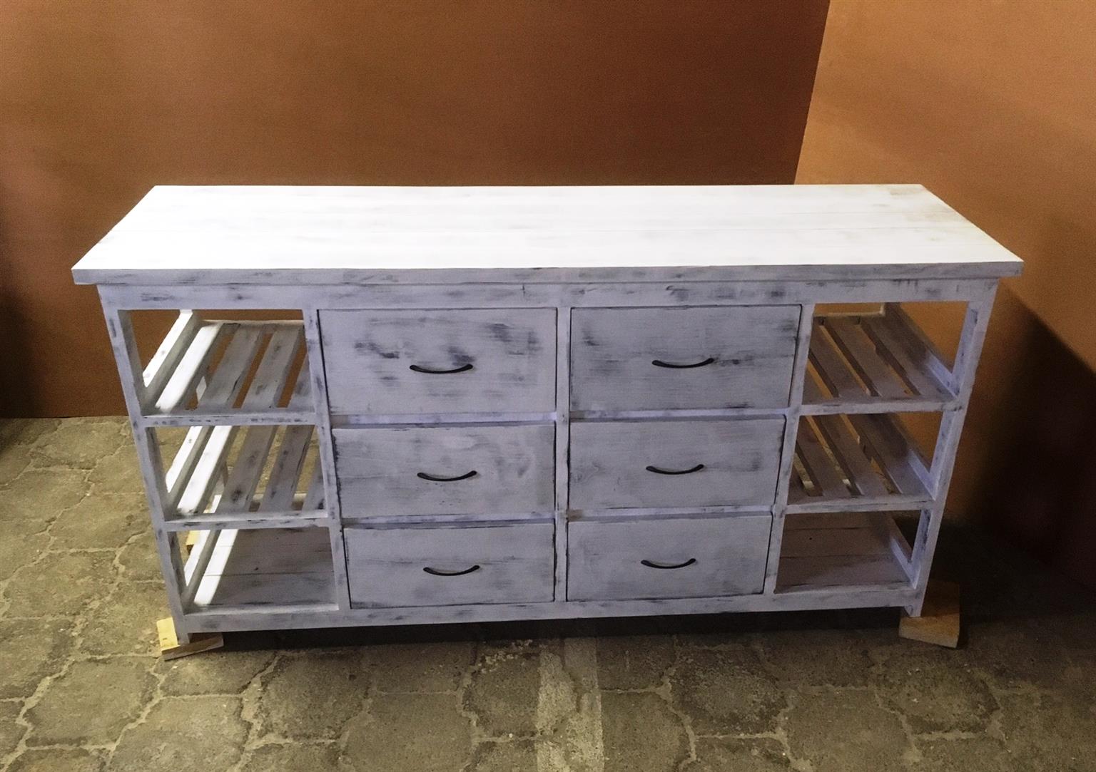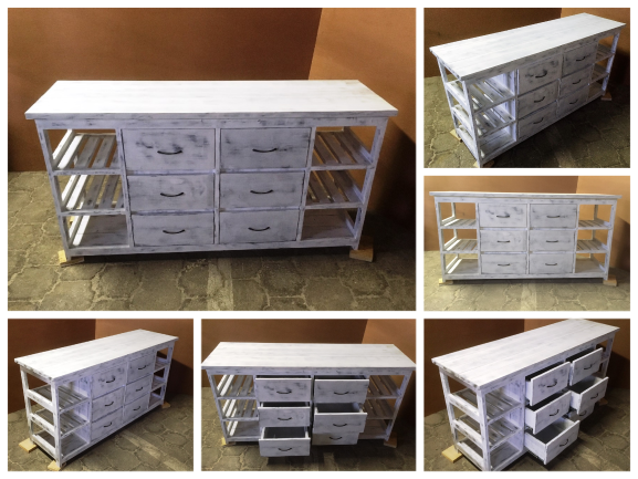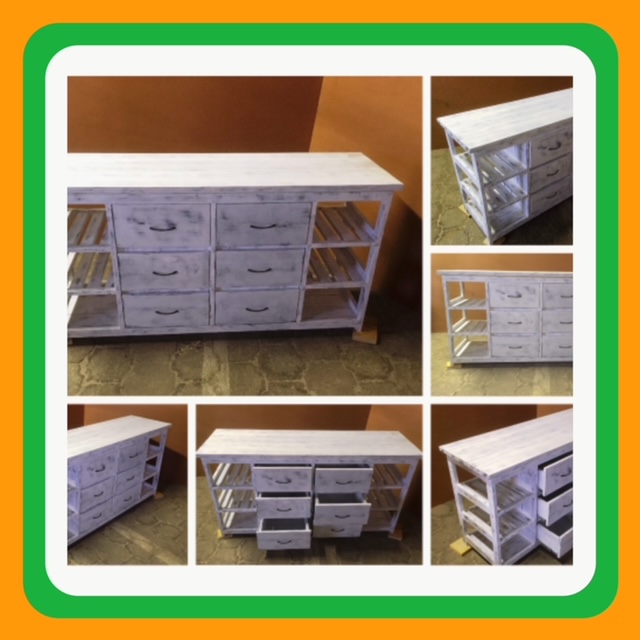 This attractive multi purpose 6 drawer and 6 compartments (for wicker baskets) weathered look hand-made piece will compliment your current bedroom furniture sets very well. Can also be used as a combination of change-over table cum Chest of drawers in the nursery. It is a lovely piece and has deep drawers for lots off clothes. All drawers are on runners for easy opening and closing.