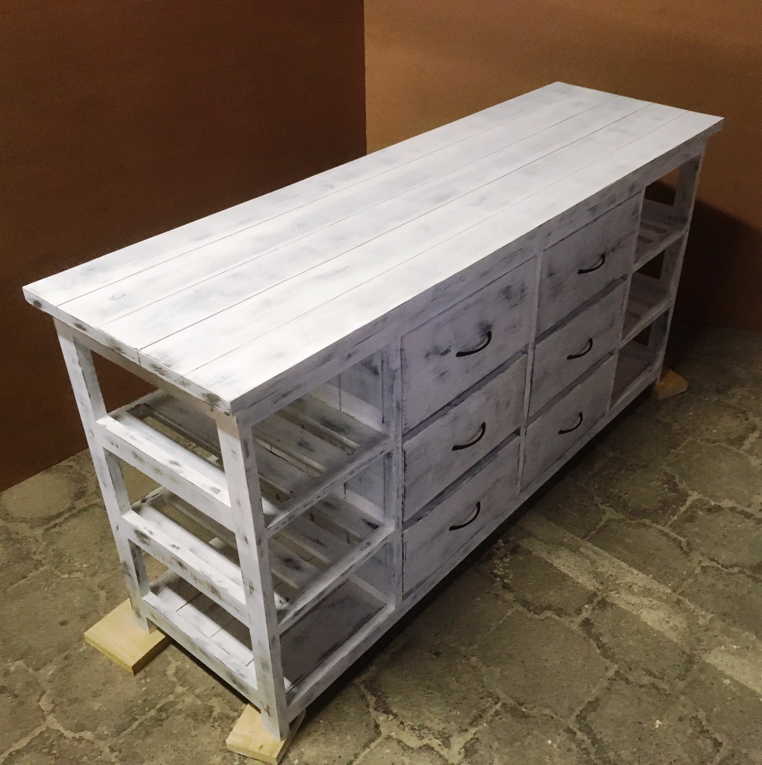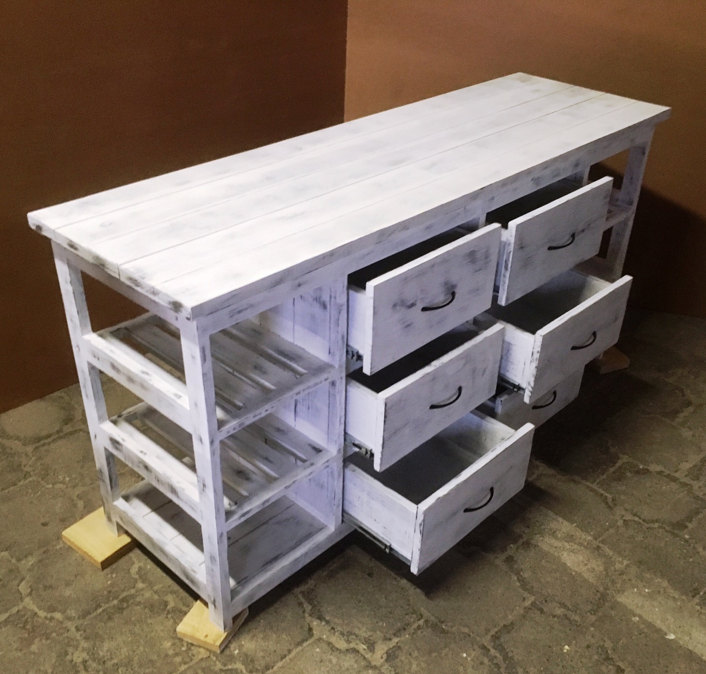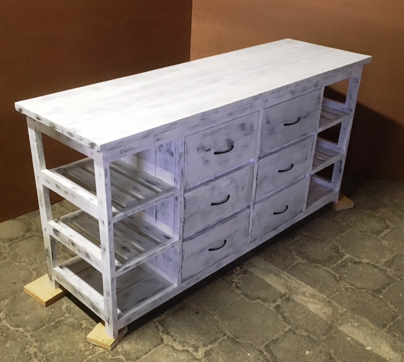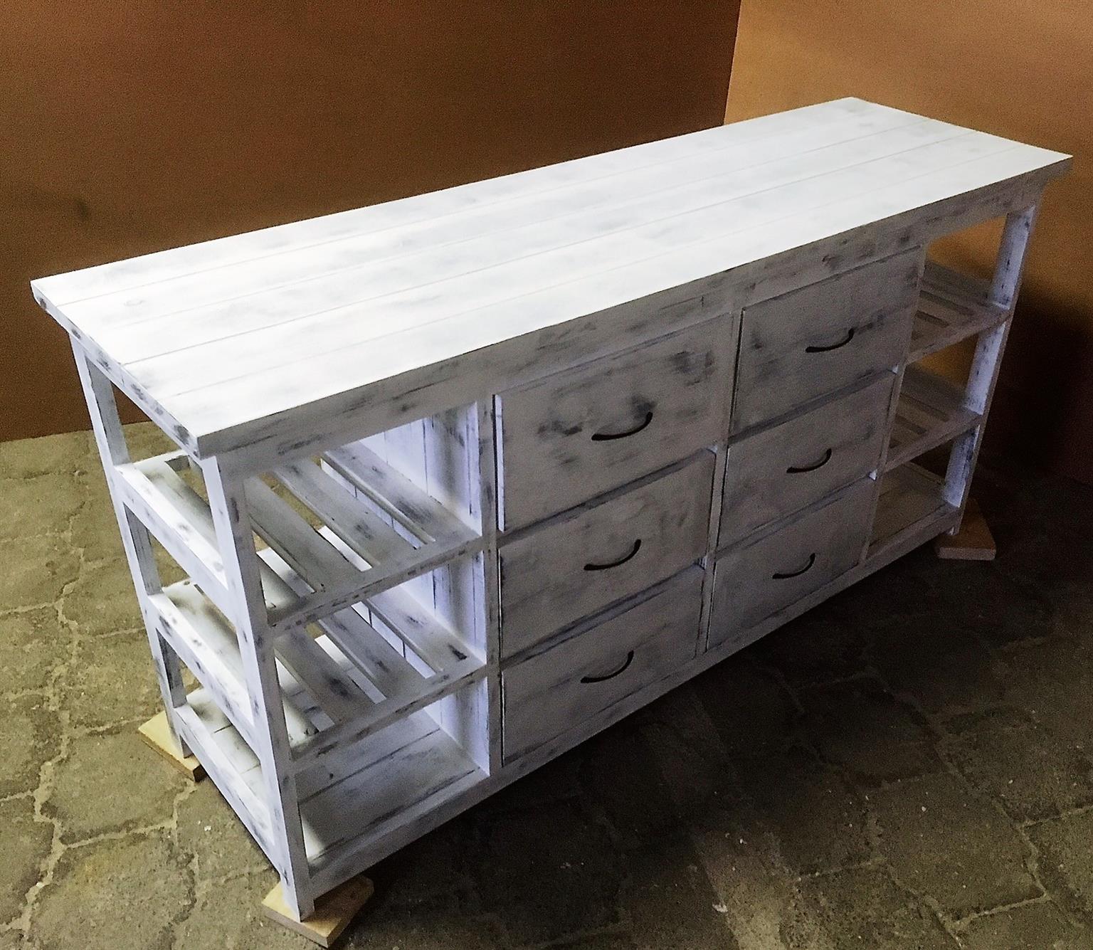 This attractive multi purpose 6 drawer and 6 compartments (for wicker baskets) weathered look hand-made piece will compliment your current bedroom furniture sets very well. Can also be used as a combination of change-over table cum Chest of drawers in the nursery. It is a lovely piece and has deep drawers for lots off clothes. All drawers are on runners for easy opening and closing.