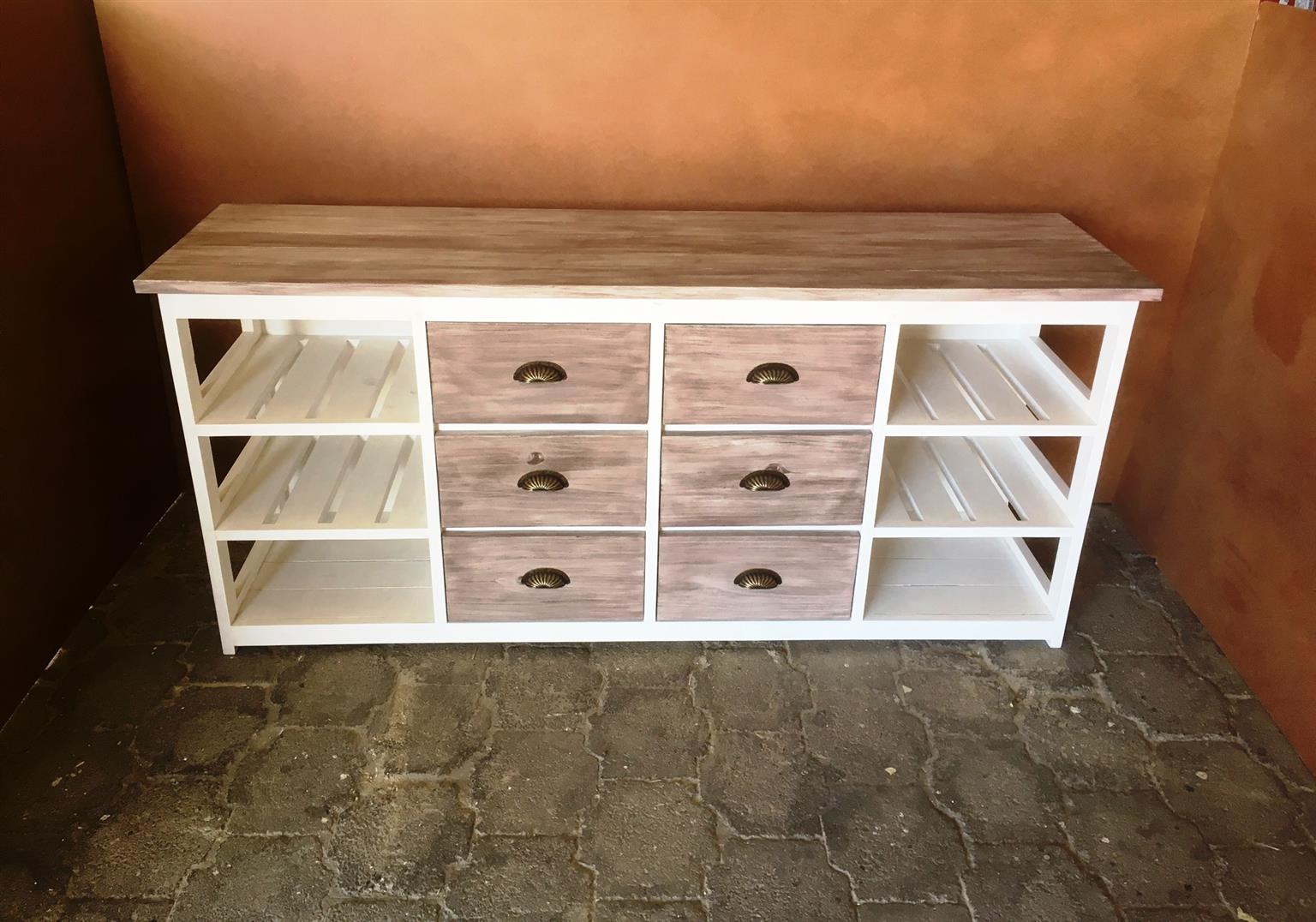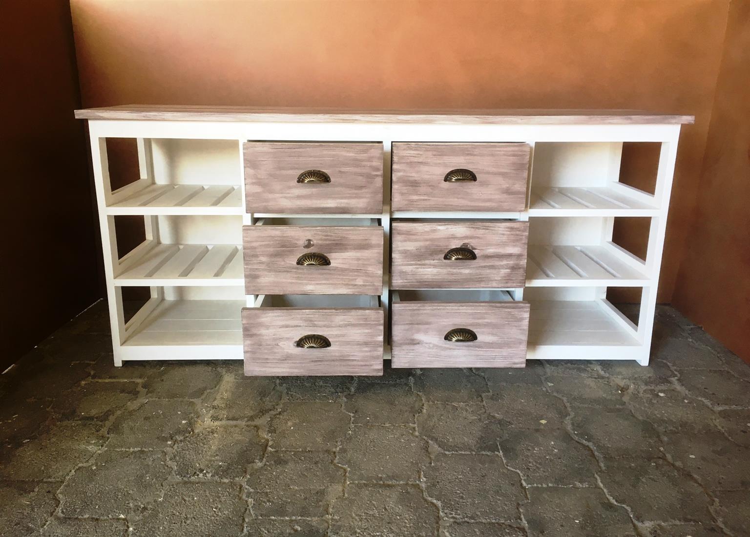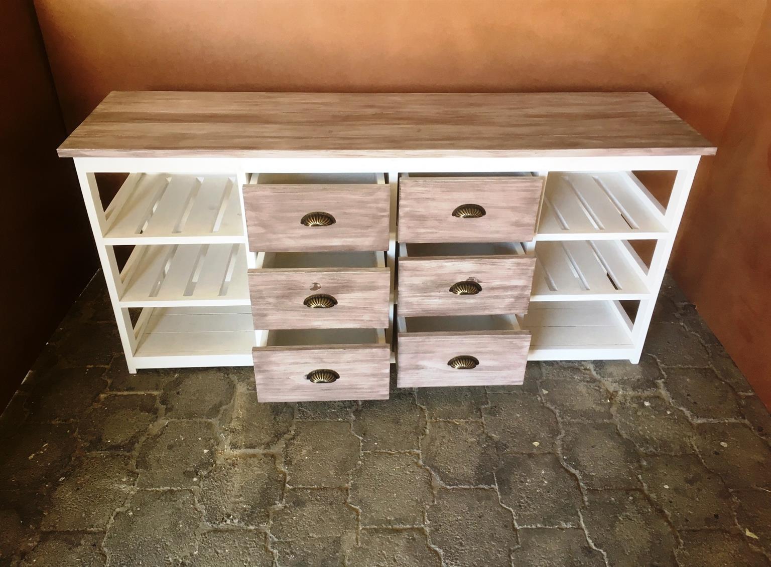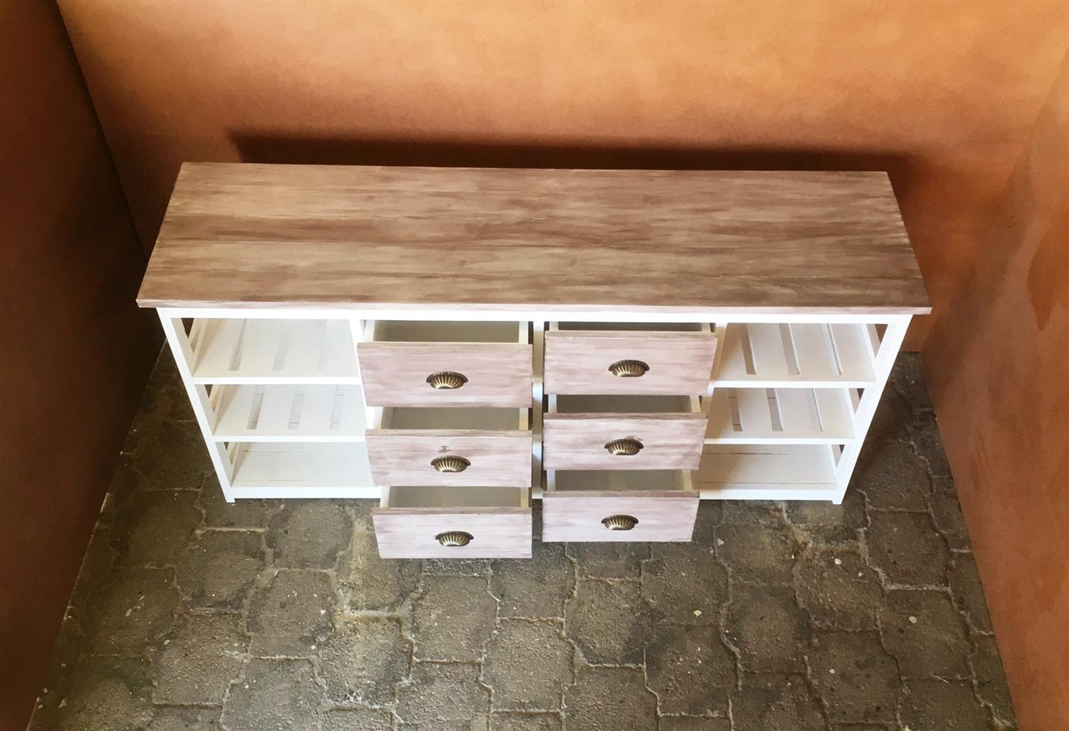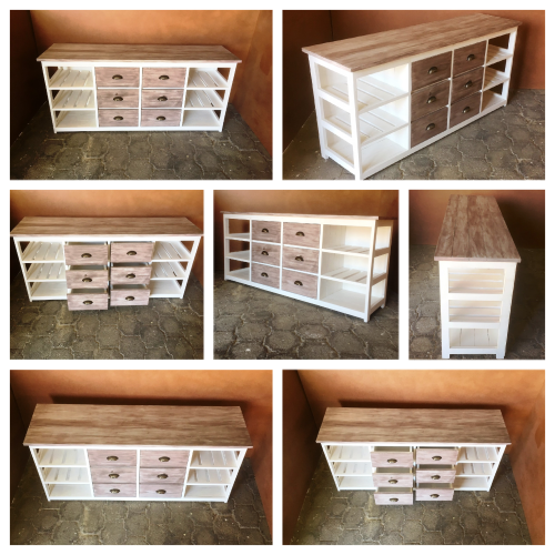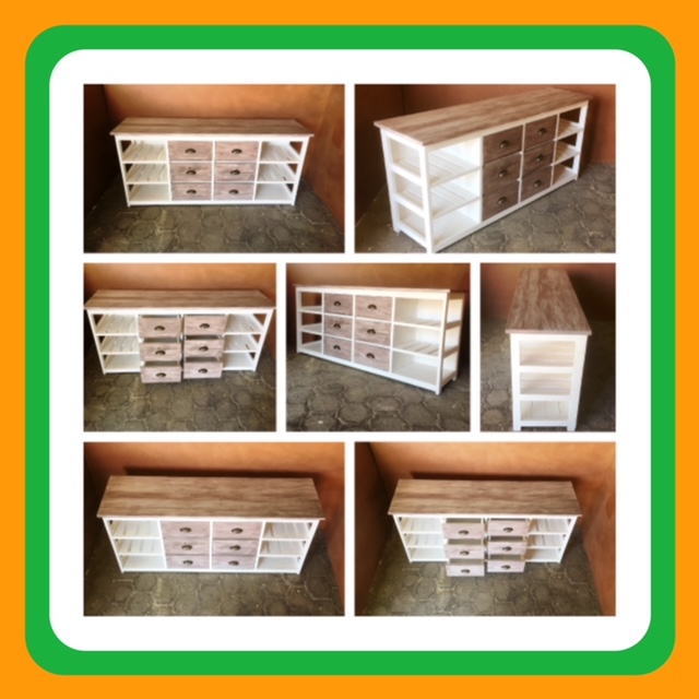 This beautiful multi purpose 6 drawer and 6 compartments (for wicker baskets) Two toned hand-crafted piece will compliment your current bedroom furniture sets very well. Can also be used as a combination of change-over table cum Chest of drawers in the nursery. It is a lovely piece and has deep drawers for lots of clothes. All drawers are on runners for easy opening and closing.