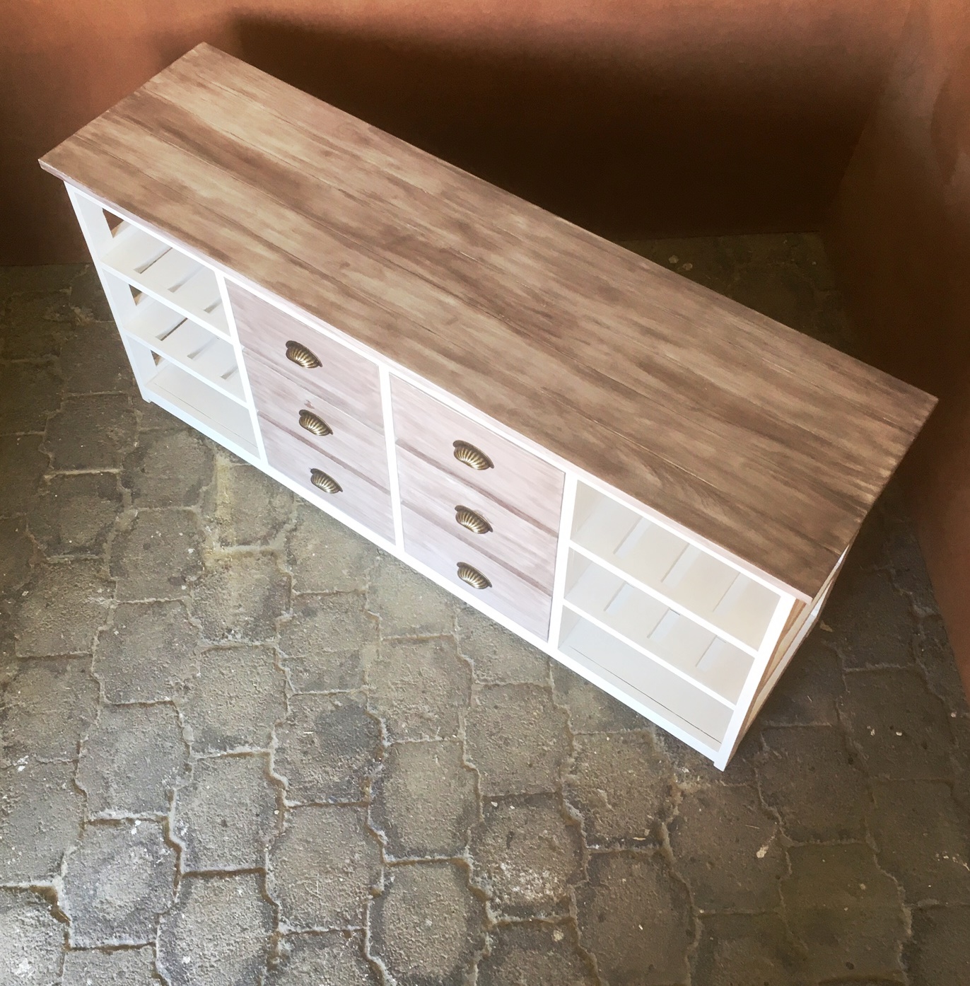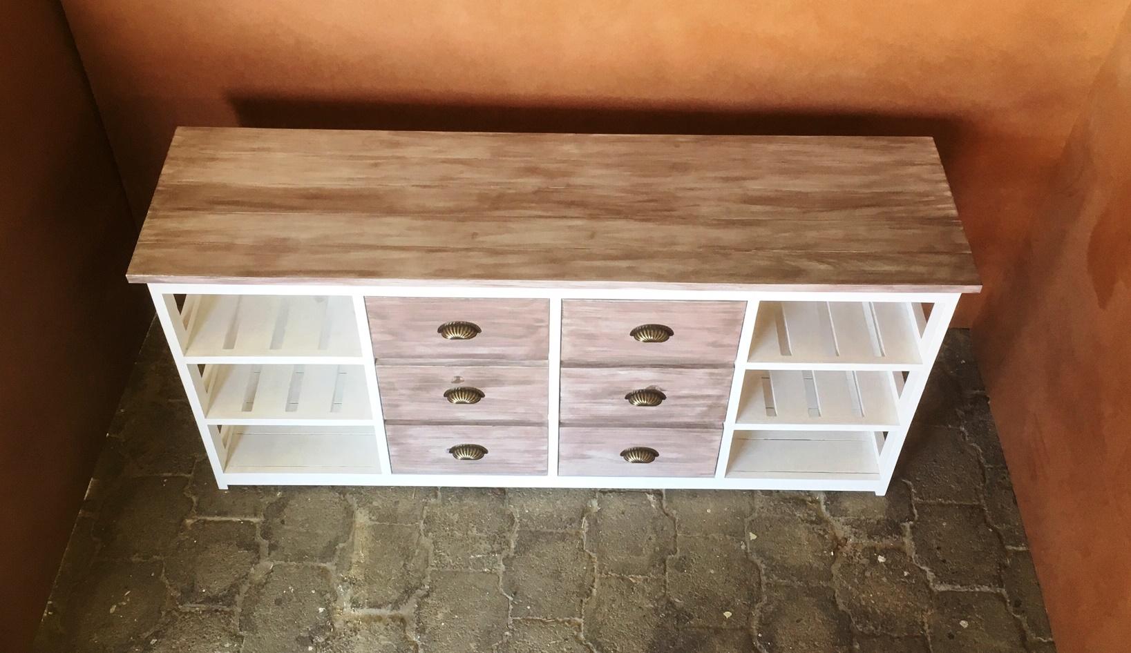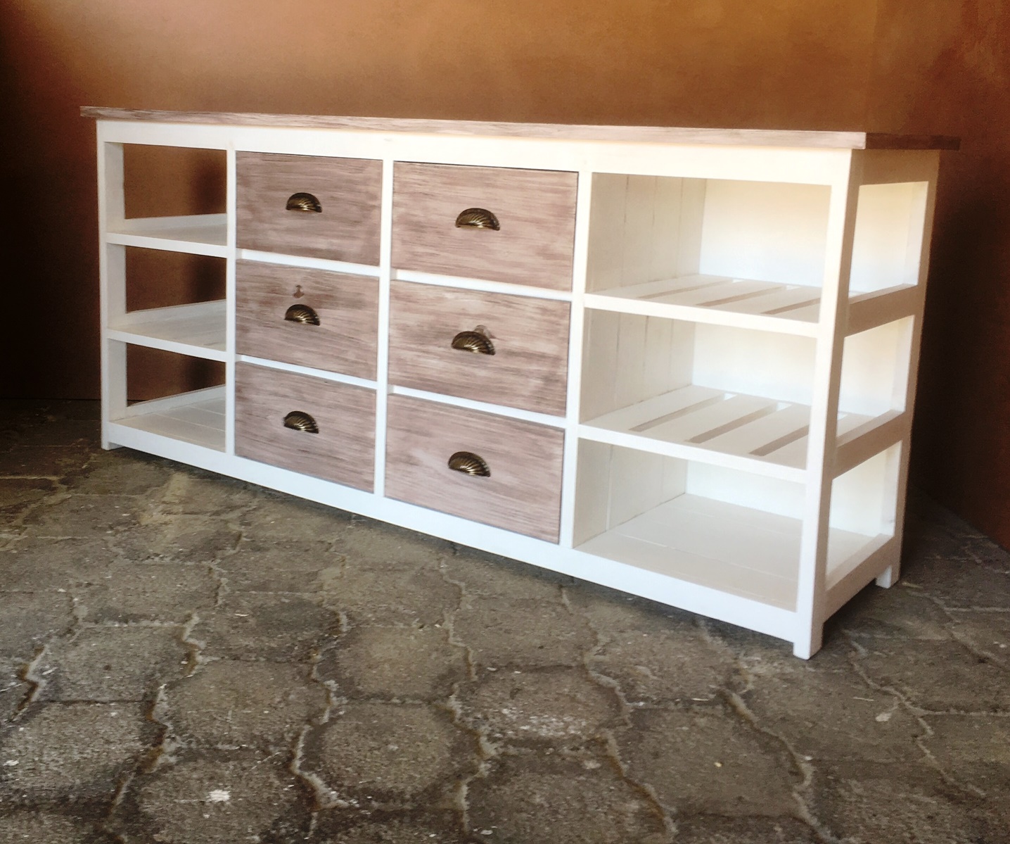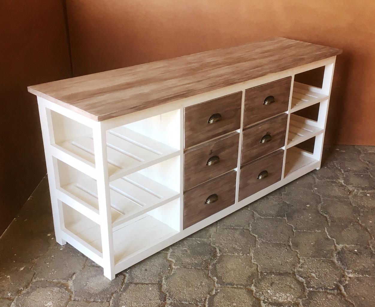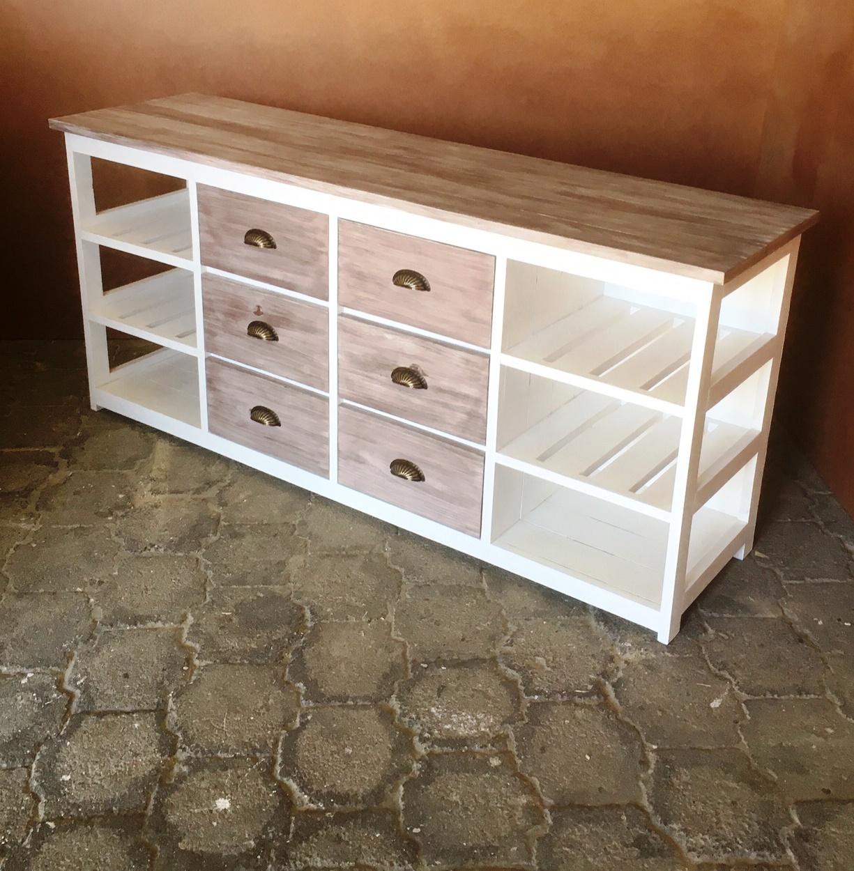 This beautiful multi purpose 6 drawer and 6 compartments (for wicker baskets) Two toned hand-crafted piece will compliment your current bedroom furniture sets very well. Can also be used as a combination of change-over table cum Chest of drawers in the nursery. It is a lovely piece and has deep drawers for lots of clothes. All drawers are on runners for easy opening and closing.