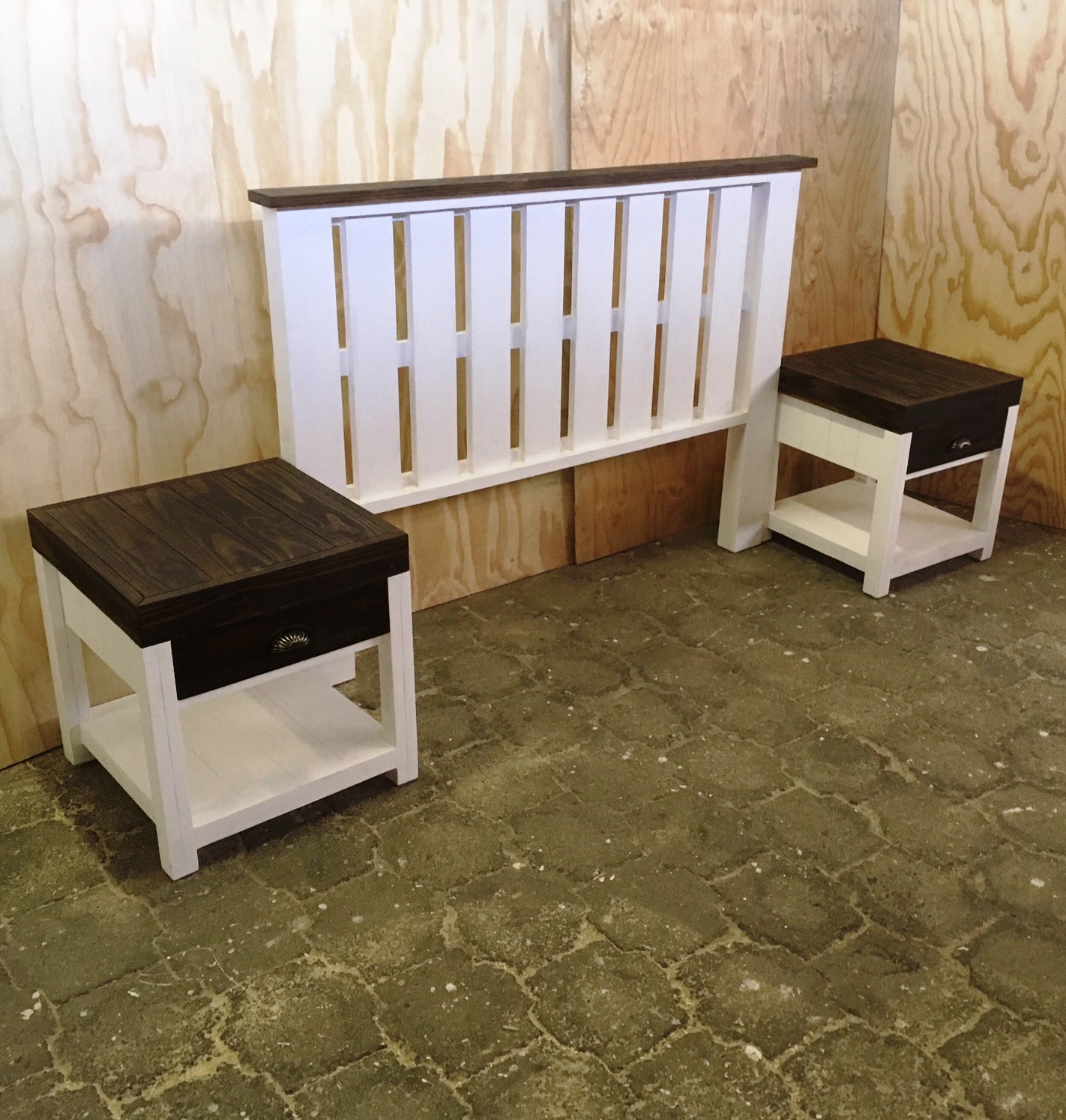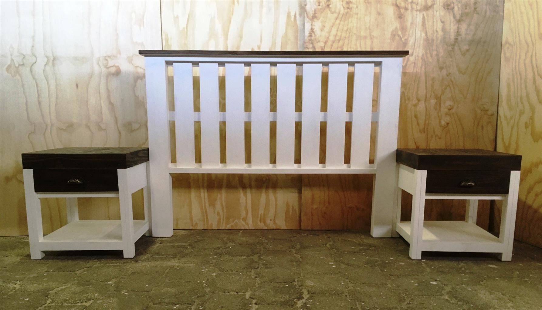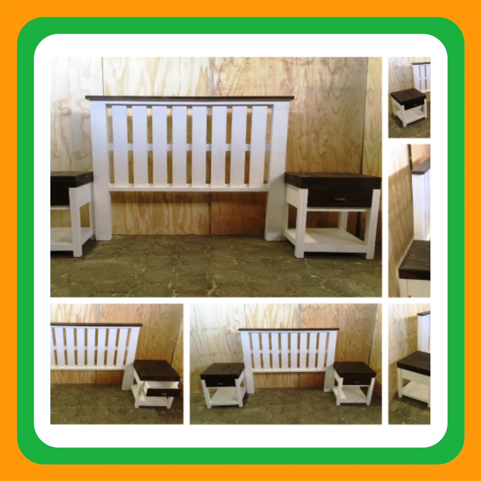 This beautiful brown stained top and white washed body Queen size headboard combo consists of a Headboard and two Night stands with single drawers. It is very popular with the younger generation and will light up any bedroom